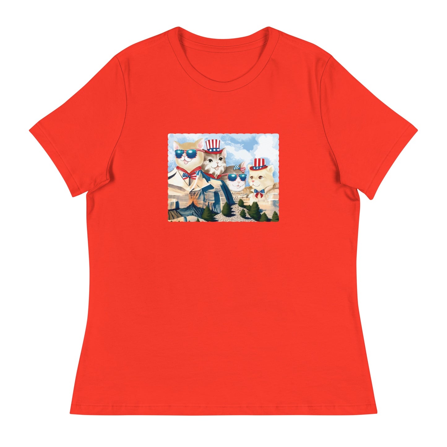 This just might be the softest and most comfortable women's t-shirt you'll ever own that features four fun and patriotic cats on their own mountain.