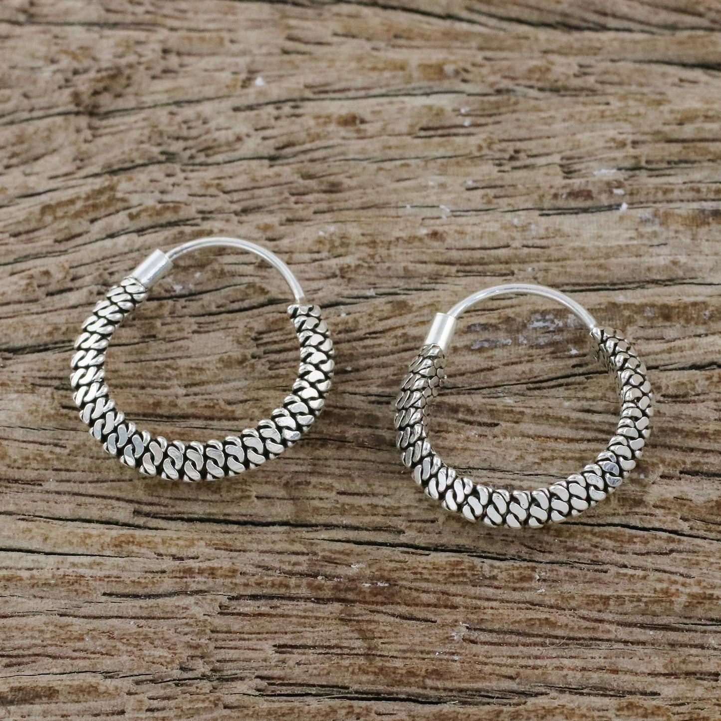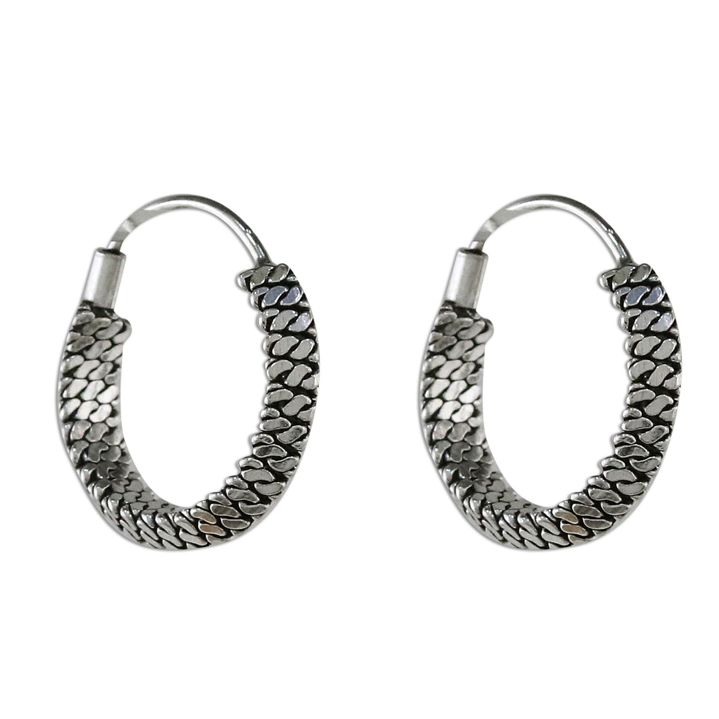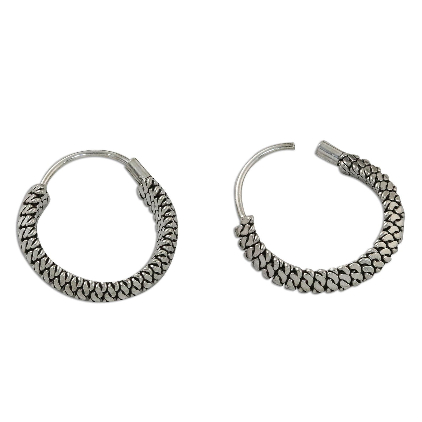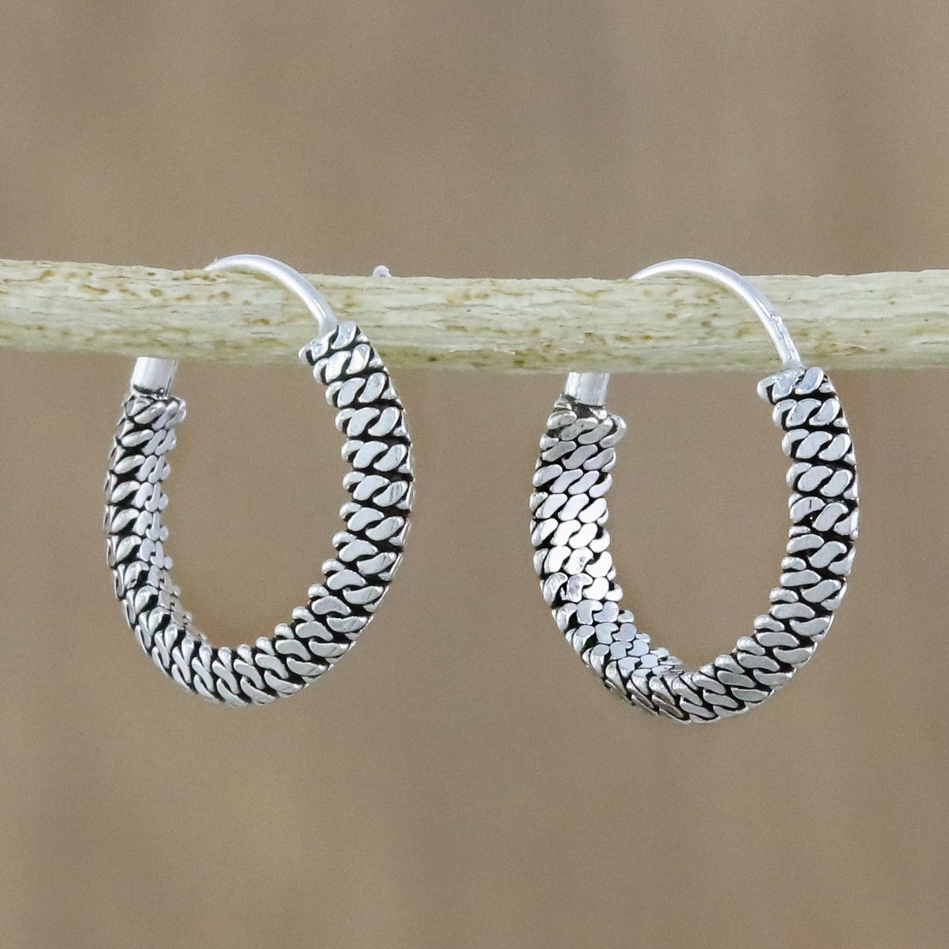 Crafted of sterling silver with a richly textured chain design, this charming pair of hoop earrings displays the wonder of Thai silversmithing. Wadarat Supasirisuk presents the earrings, proud to offer her country's handicrafts.