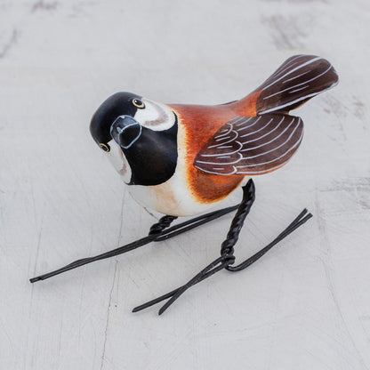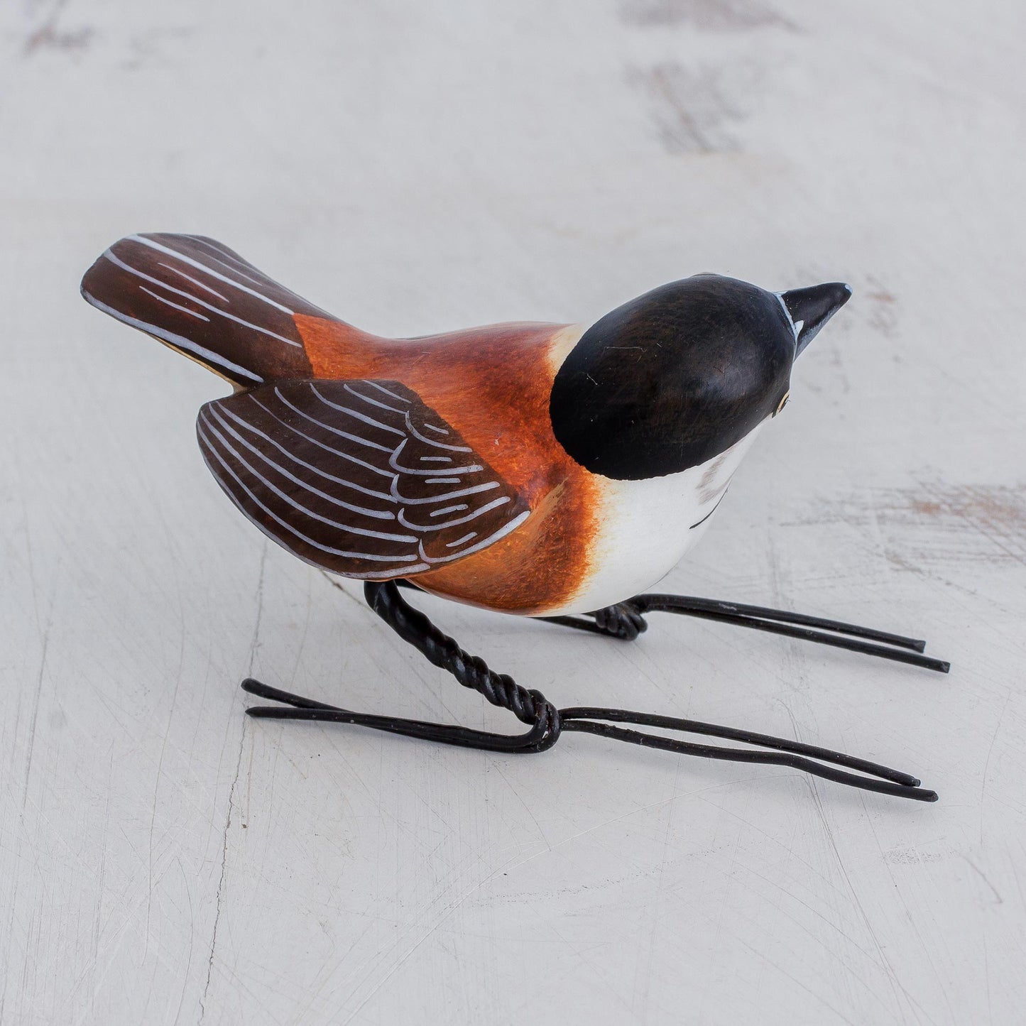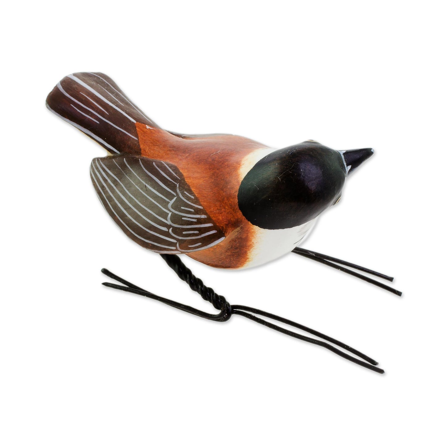 This ceramic figurine of the chestnut-backed chickadee tilts its head up as if looking at you, ready to be posed in your home or patio. Guatemalan artisan Mauricio Morales hand sculpts and hand paints this handsome bird with meticulous detail to capture the species' likeness. The aluminum wire legs and feet can bend to position the bird to your liking.