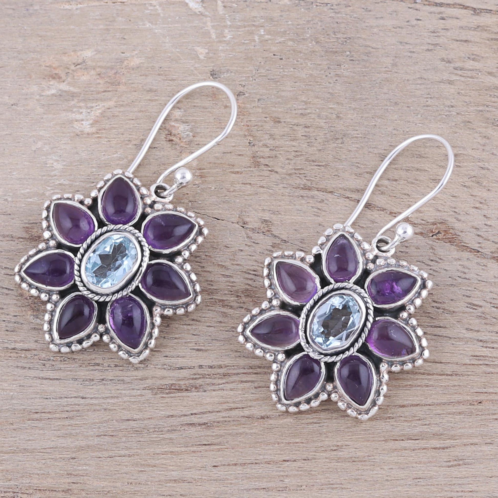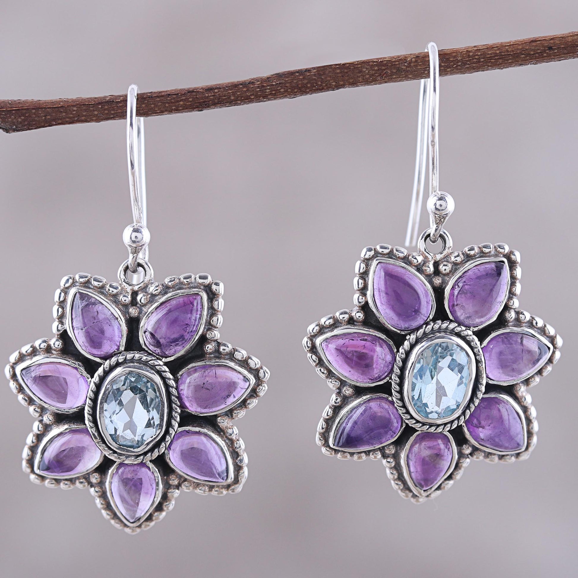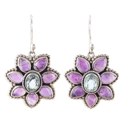Chrysanthemum Blossoms Blue Topaz and Amethyst Dangle Earrings from India