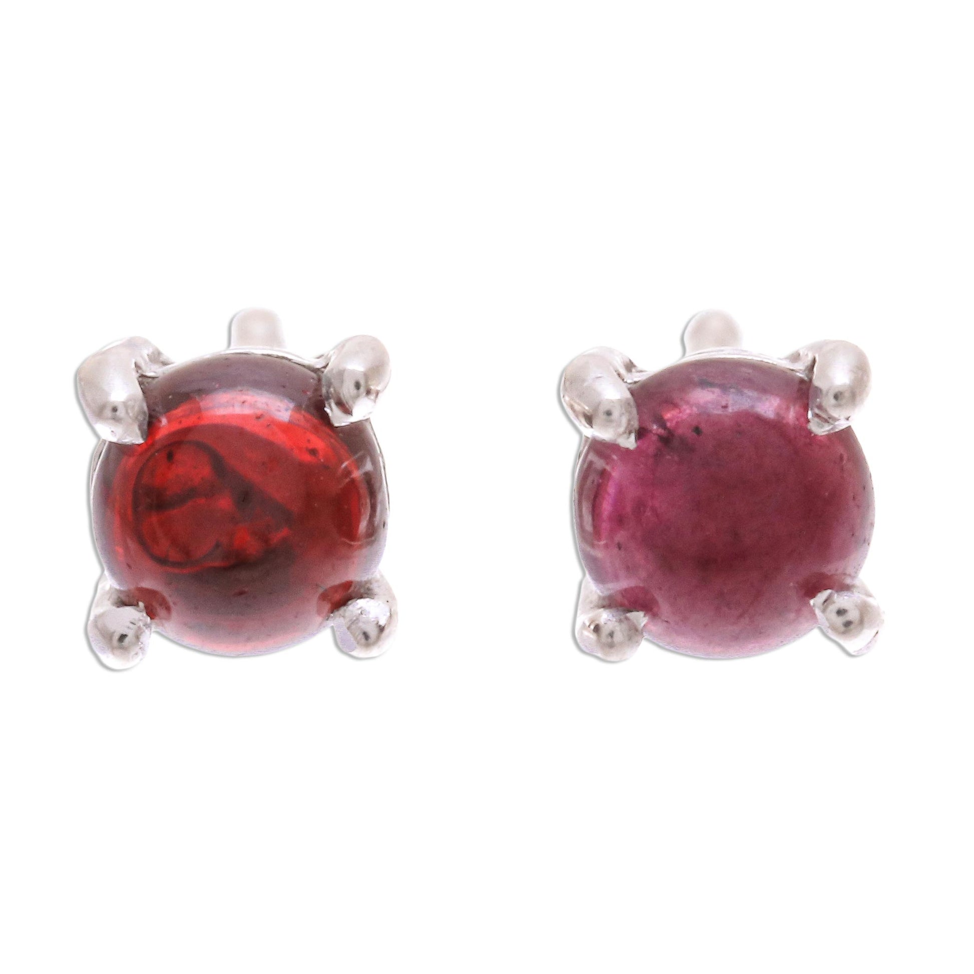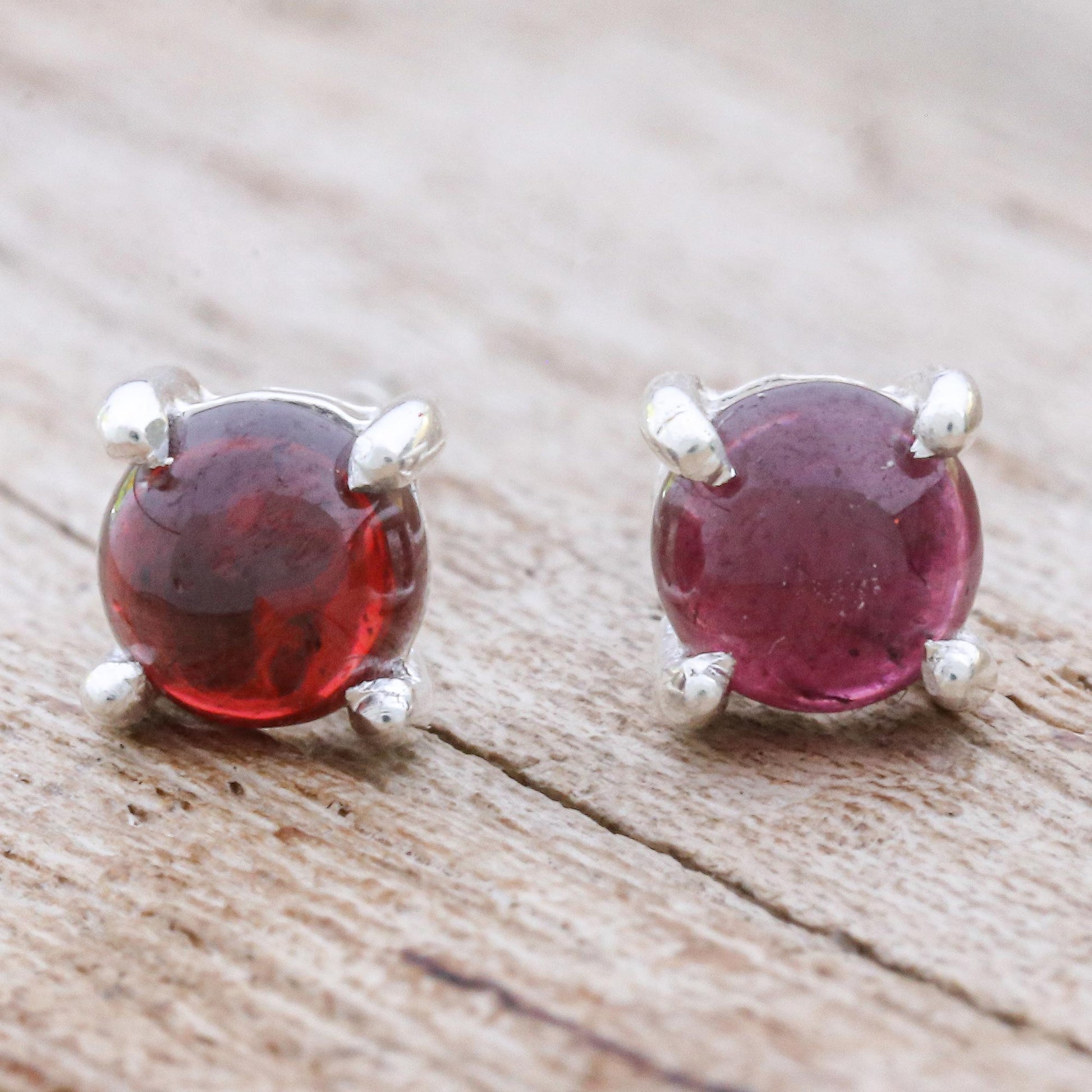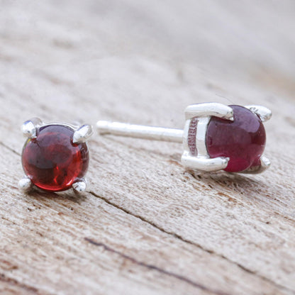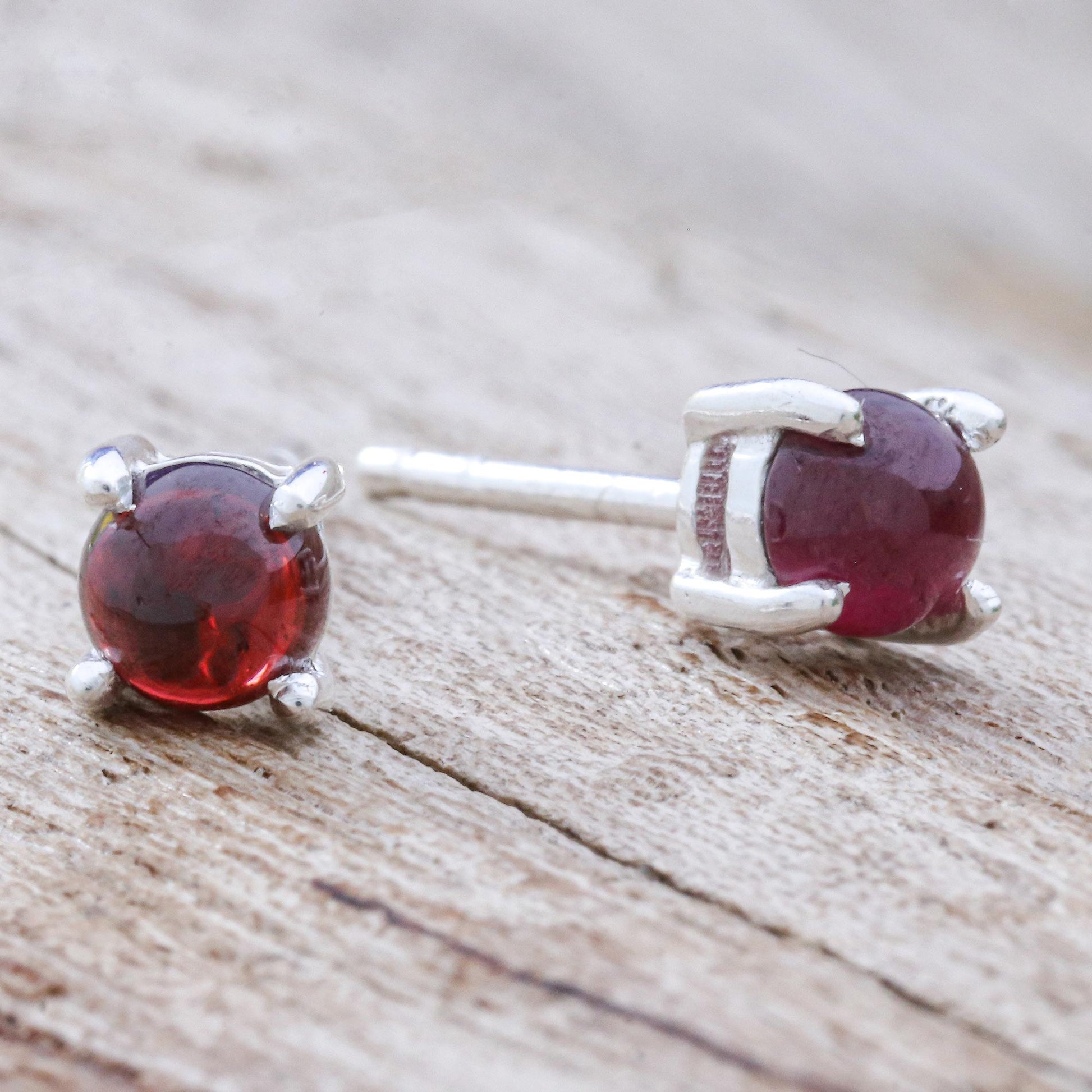 Wear this pair of enchanting stud earrings on the next full moon. Crafted by Thai artisan Narinee, the round earrings are crafted with wine-colored garnet gemstones and finished with an arresting sterling silver basket setting.