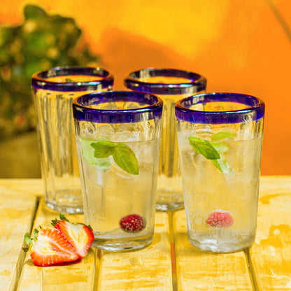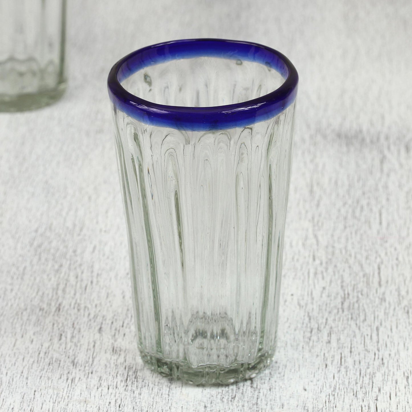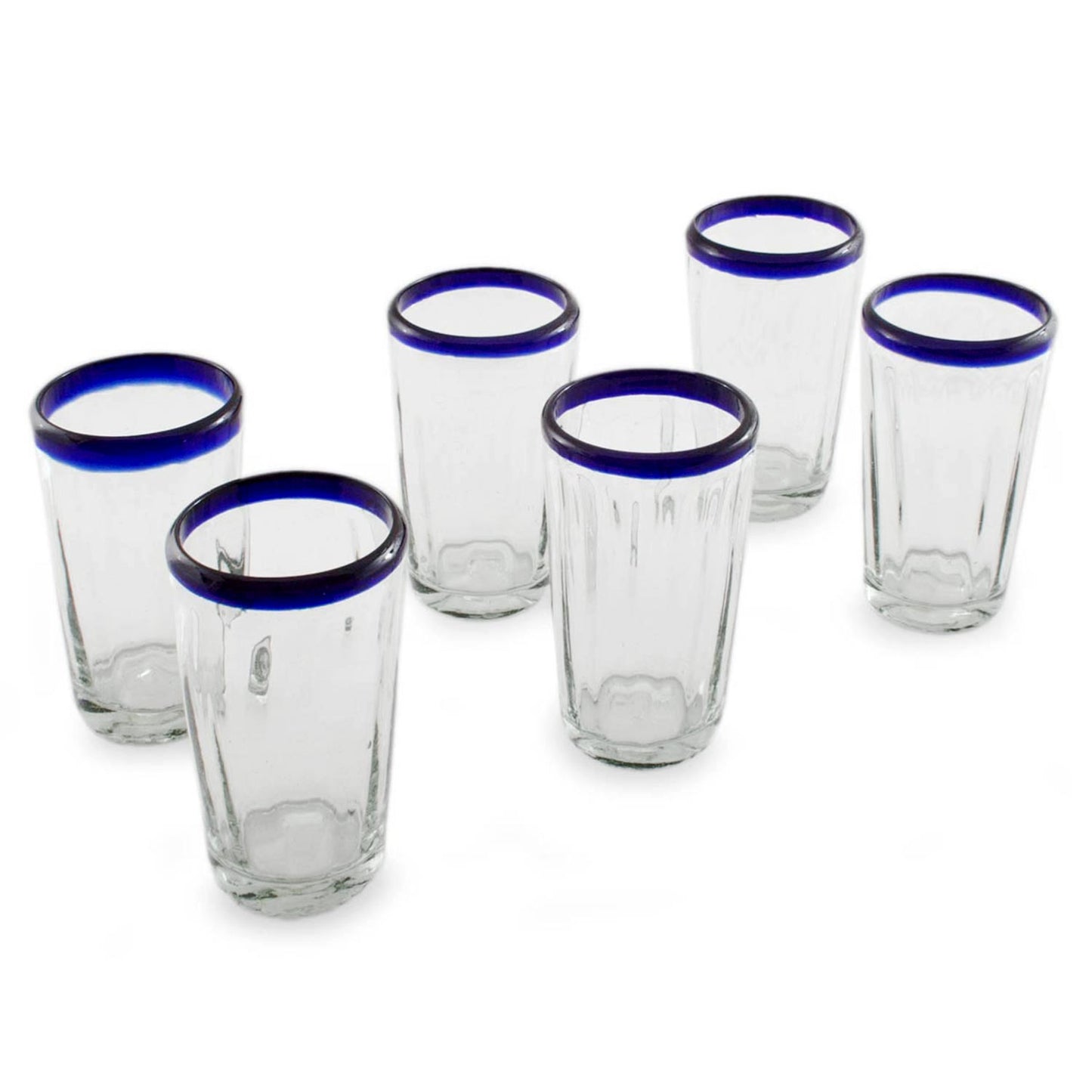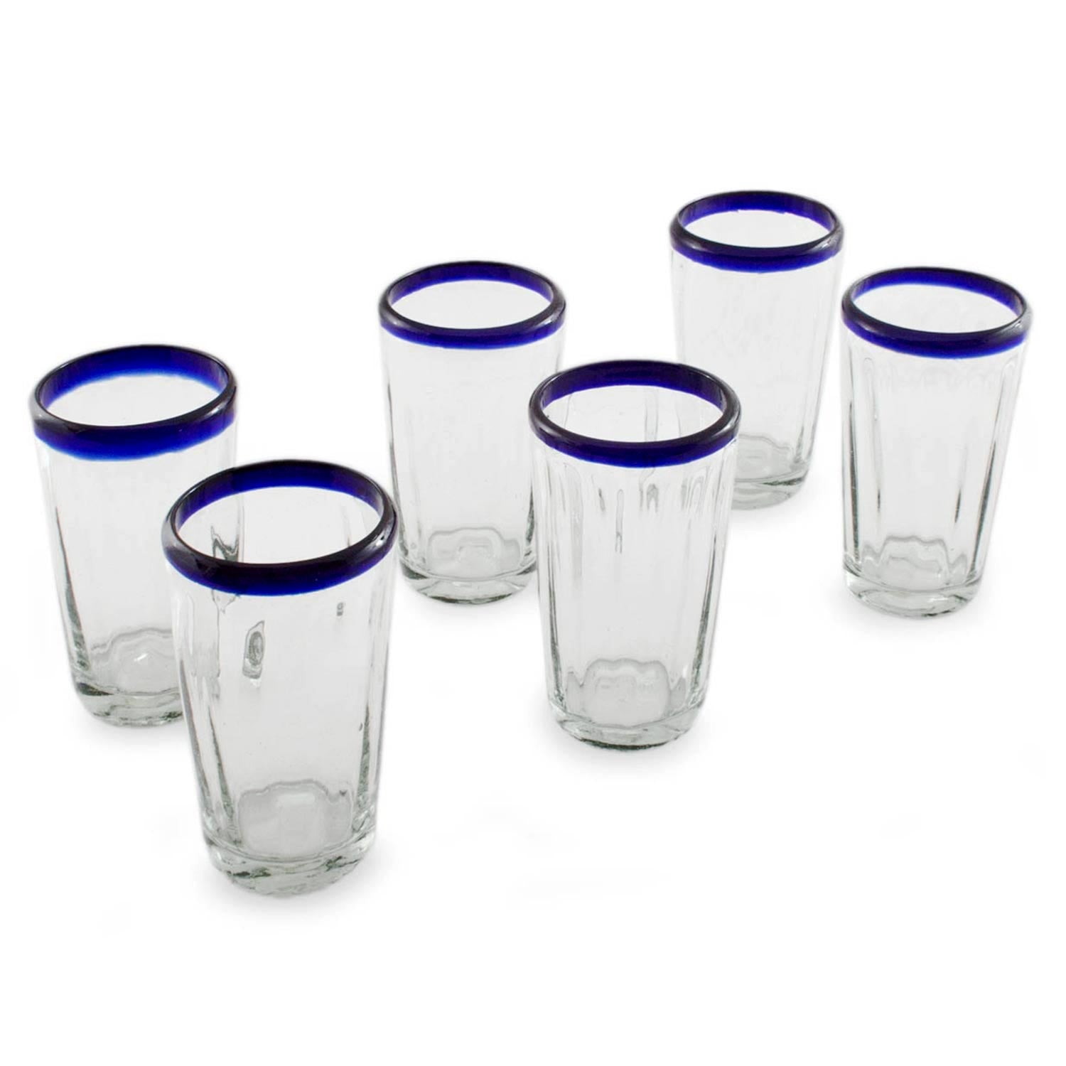 Bordered in brilliant cobalt blue, these delightful tumblers bring a festive touch to any table setting. The set of six comes from talented artisans for the Novica Handblown Collection. Vertical grooves add texture to the glasses.
