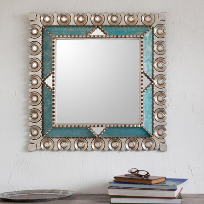 As entrancing as it is beautiful, this wall mirror from Peru is crafted with inspiration from traditional colonial handicrafts. Peruvian artisan Marcos Luzalde creates this piece, framing the square mirror with accents in turquoise blue. The marupa wood frame is detailed with circular patterns and mirrored accents, finished with a gleaming silver gilded finish.