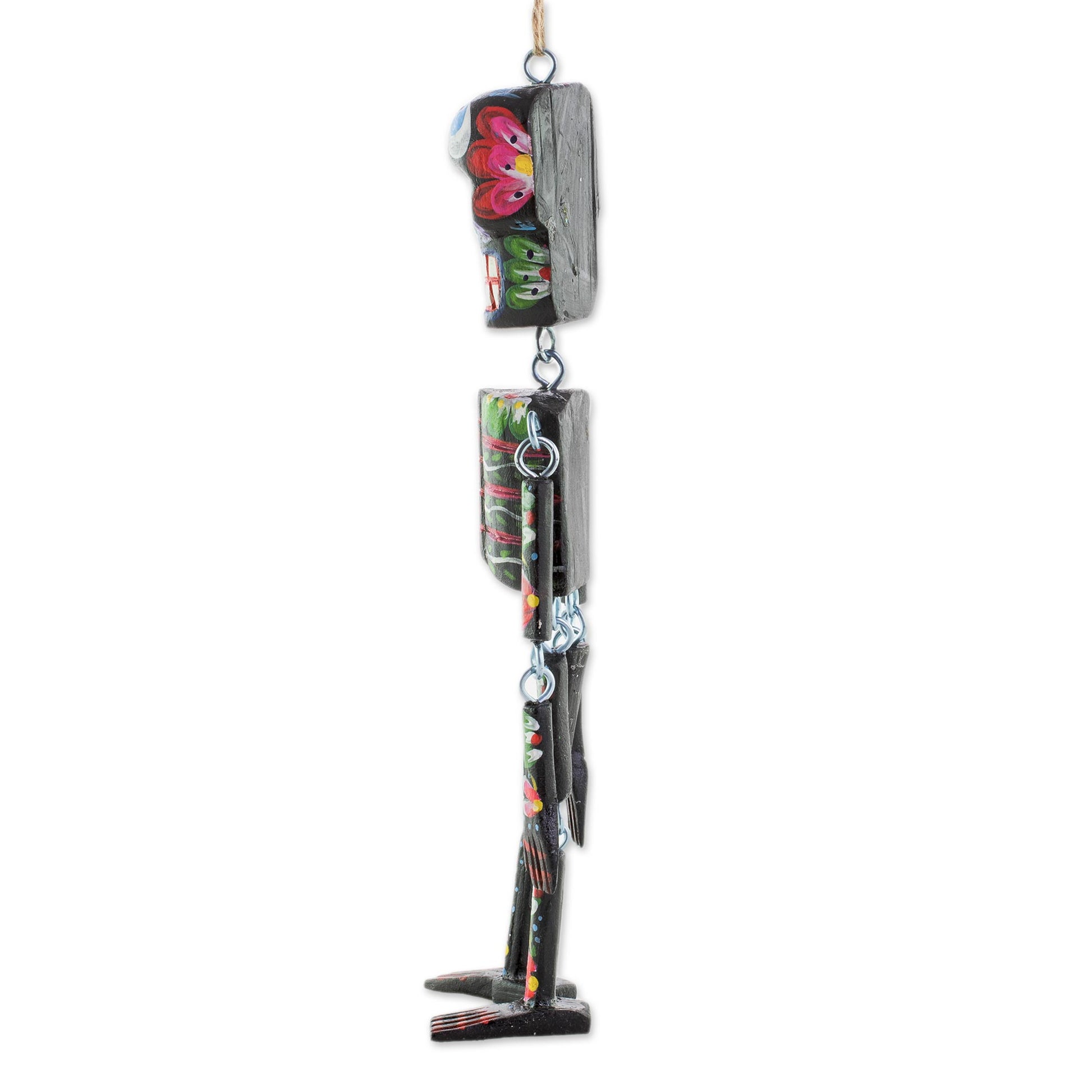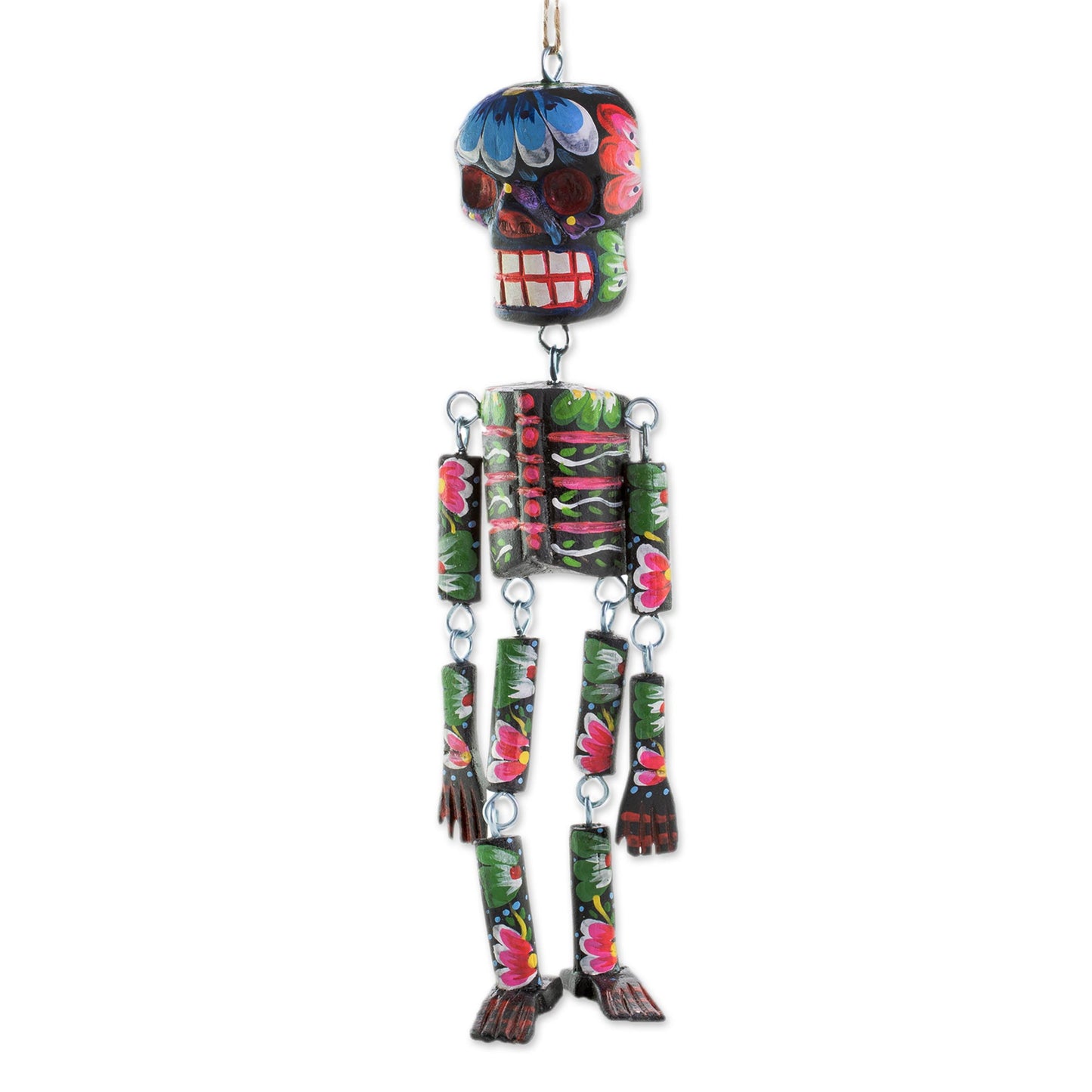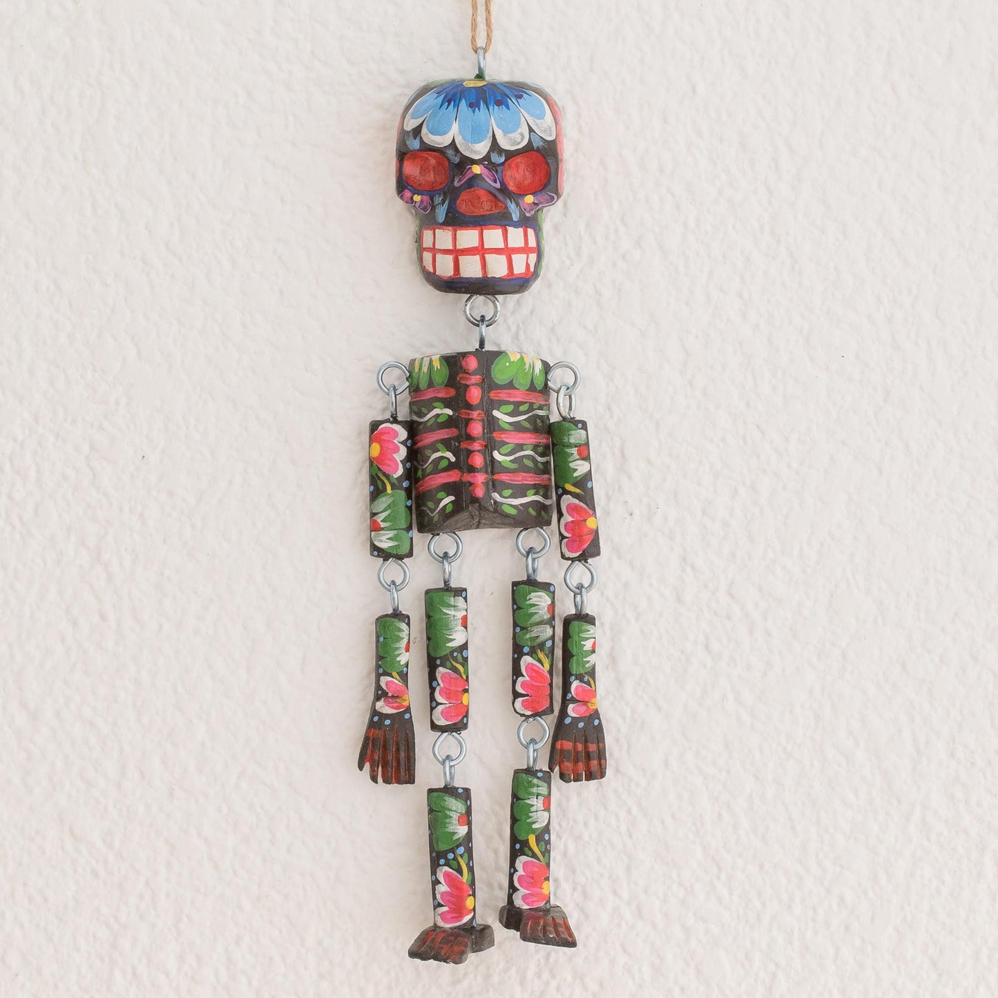 Inspired by the colorful traditions of their country, Guatemalan duo Juan and Carolina create this striking wall ornament to add to your home. Crafted of pinewood with brass joints, a jolly dangling skeleton in black is painted by hand with colorful floral motifs. The ornament is suspended from an agave fiber cord.