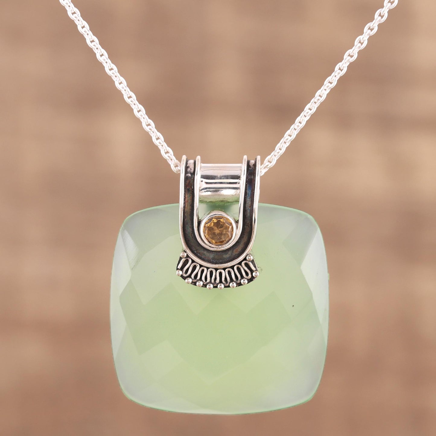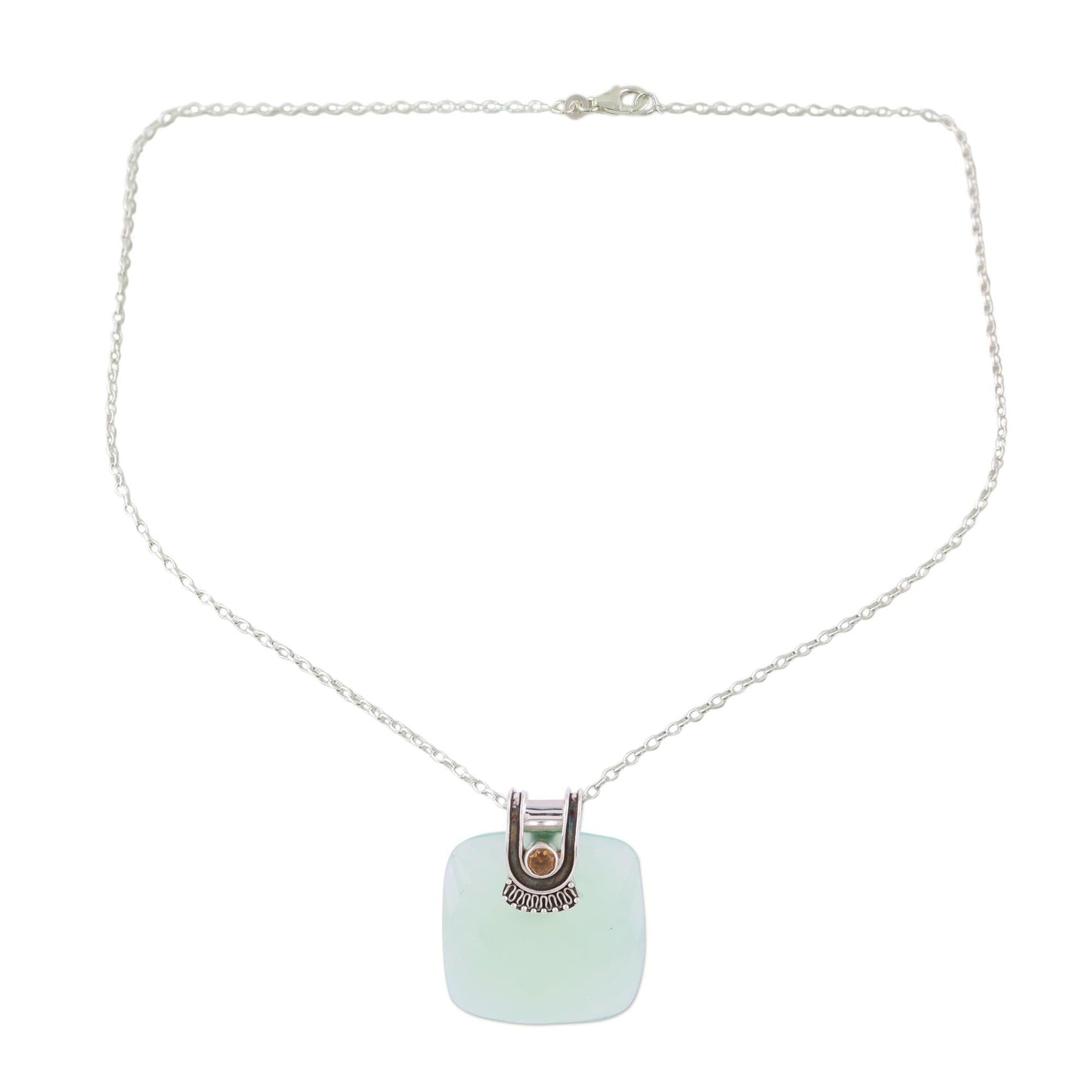 A square stone of faceted chalcedony, weighing over 70 carats, is combined with a petite citrine stone for the pendant of this Indian necklace. Designed by Babun Dey, the necklace is crafted with a sterling silver cradle that holds the stones, centering an adjustable length of rolo chain.
