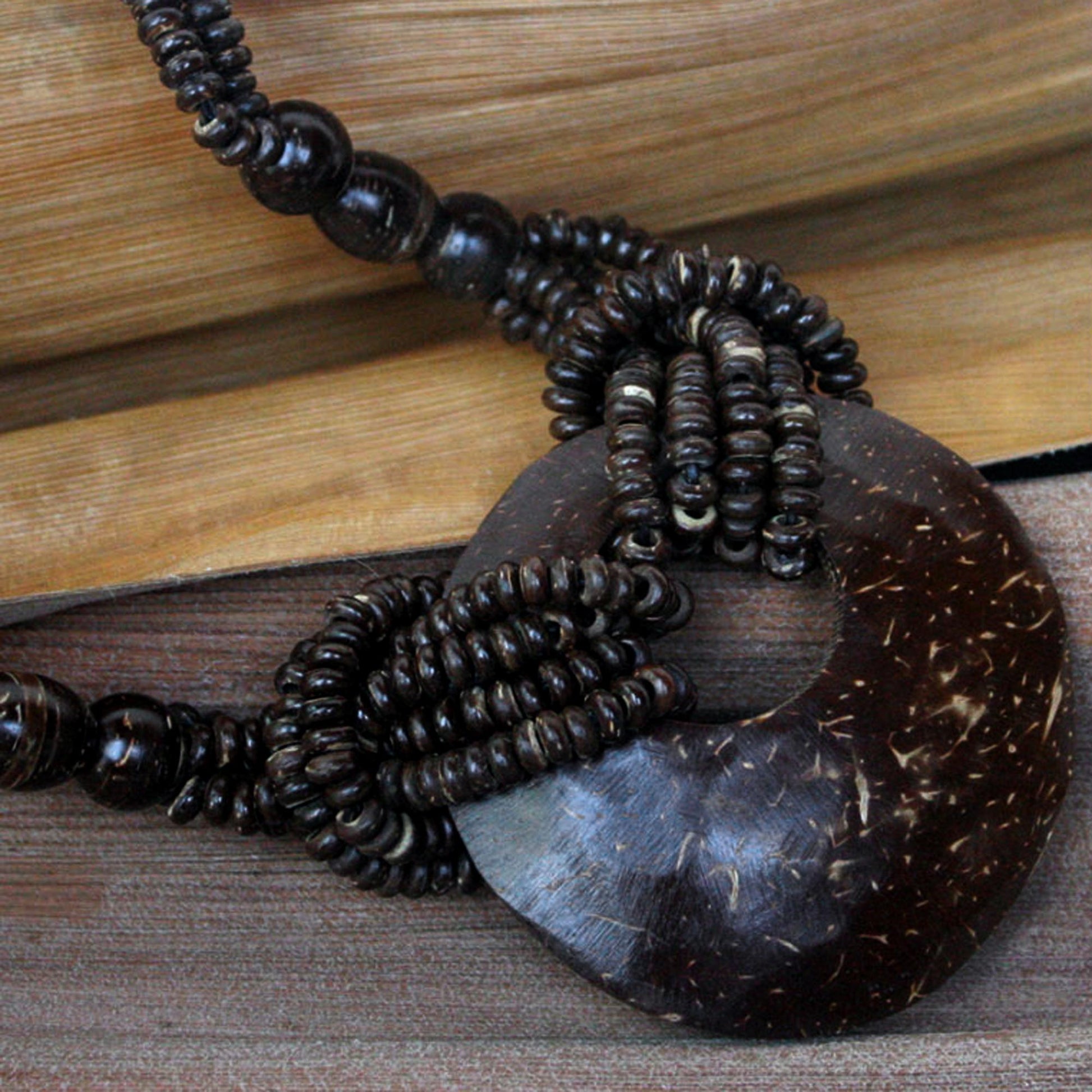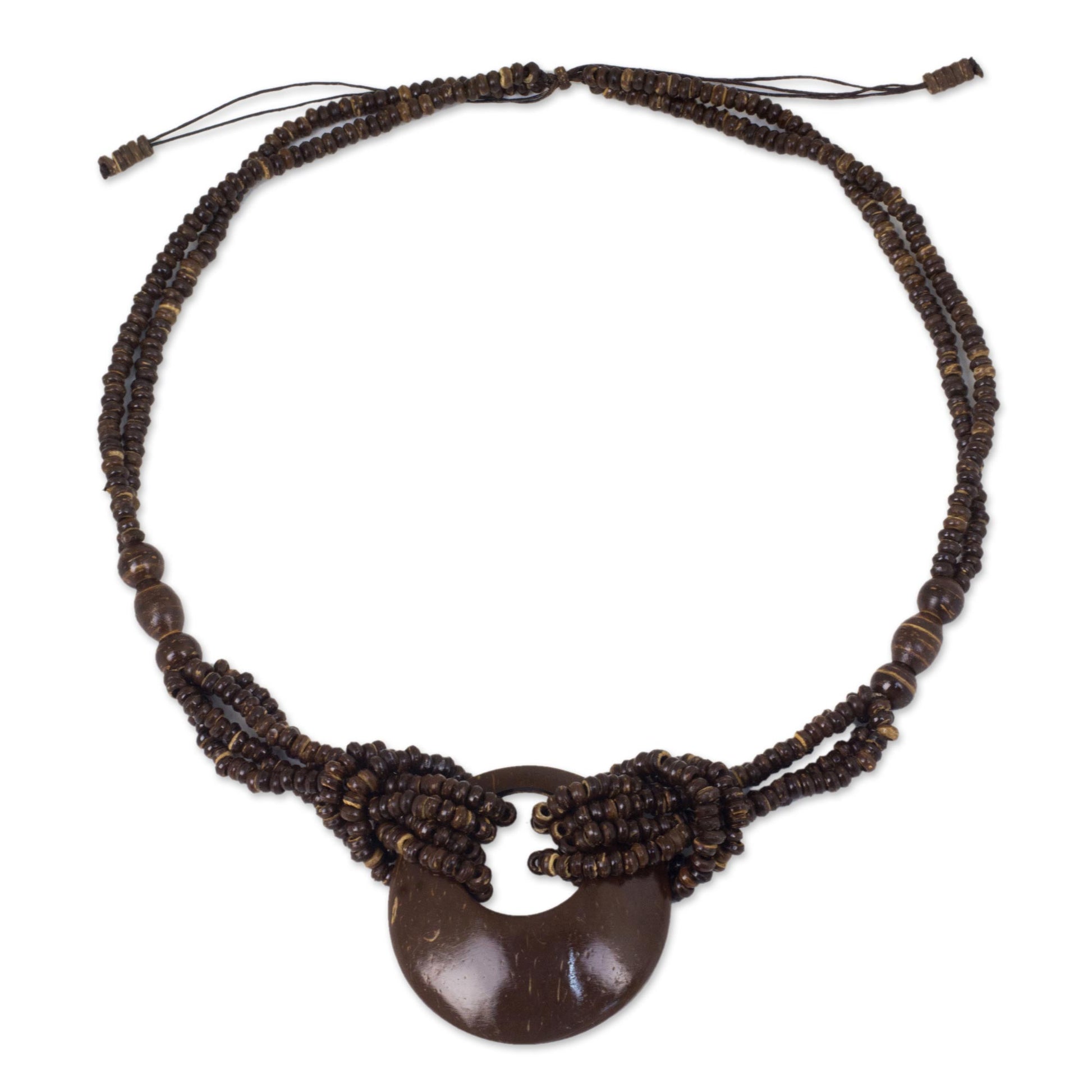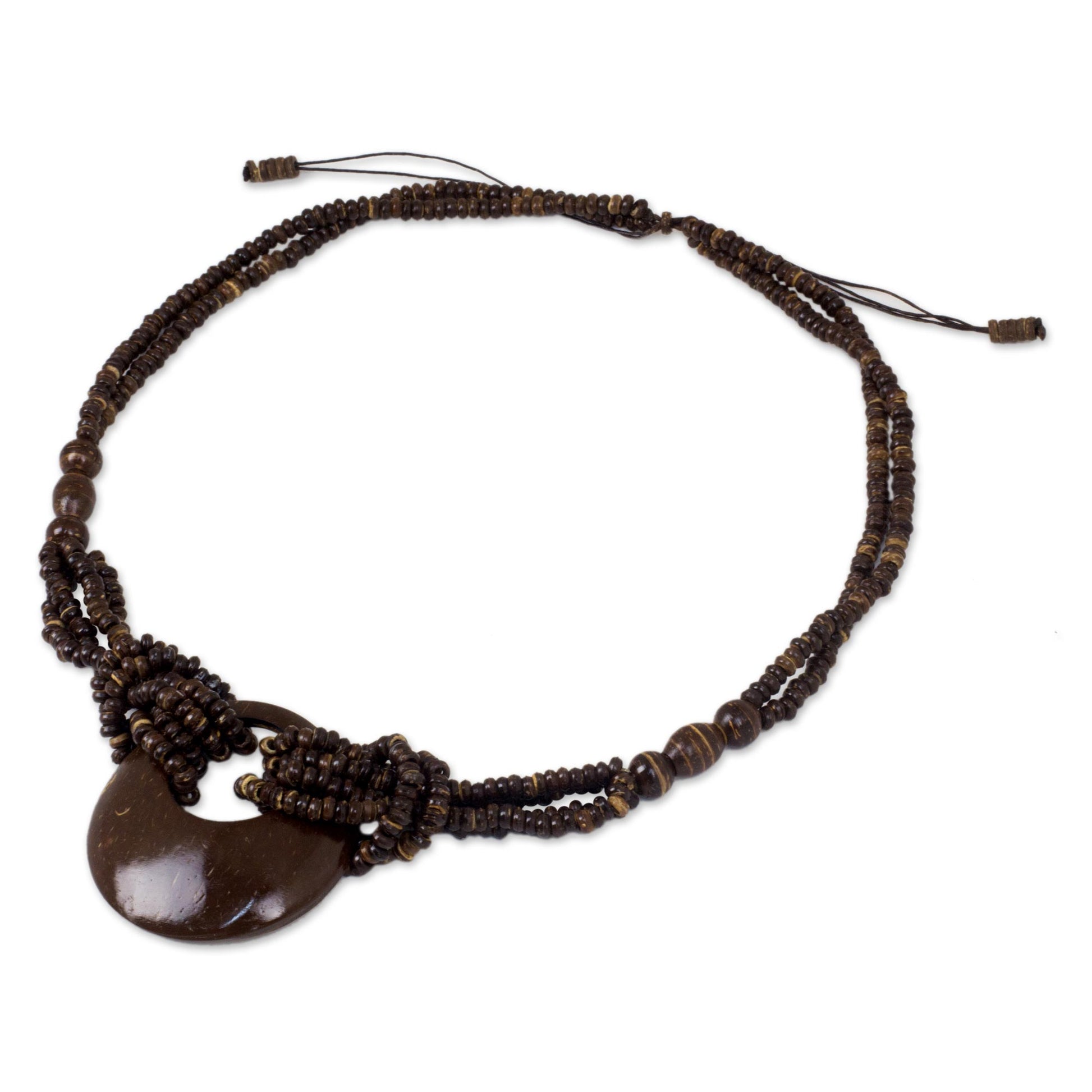 This beaded necklace is centered by a crescent moon pendant. Thailand's Sasithon Saisuk highlights the unique pigmentation of coconut shell through the fascinating design of this necklace. Entirely crafted by hand from coconut shell.