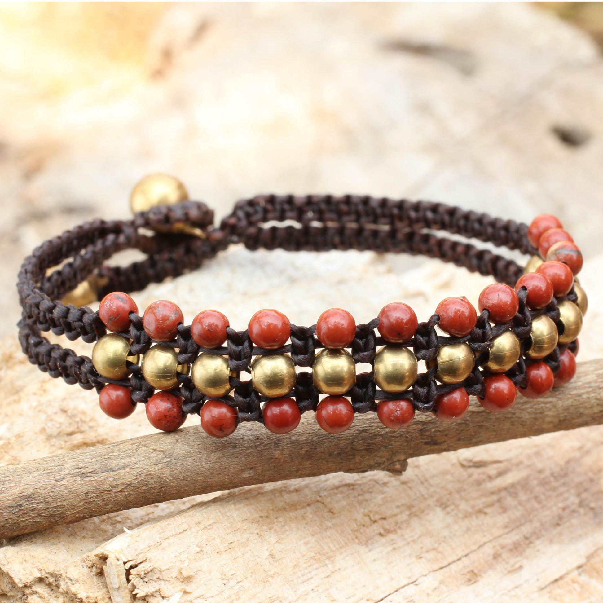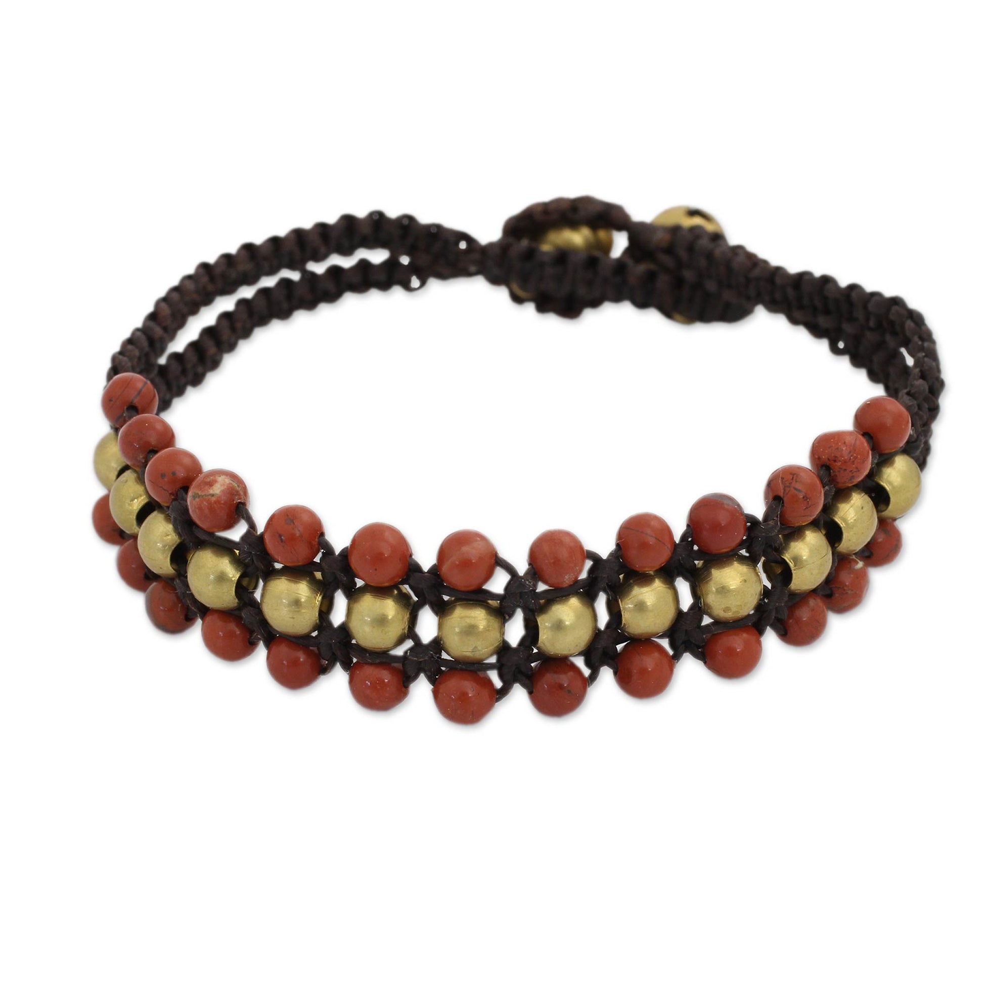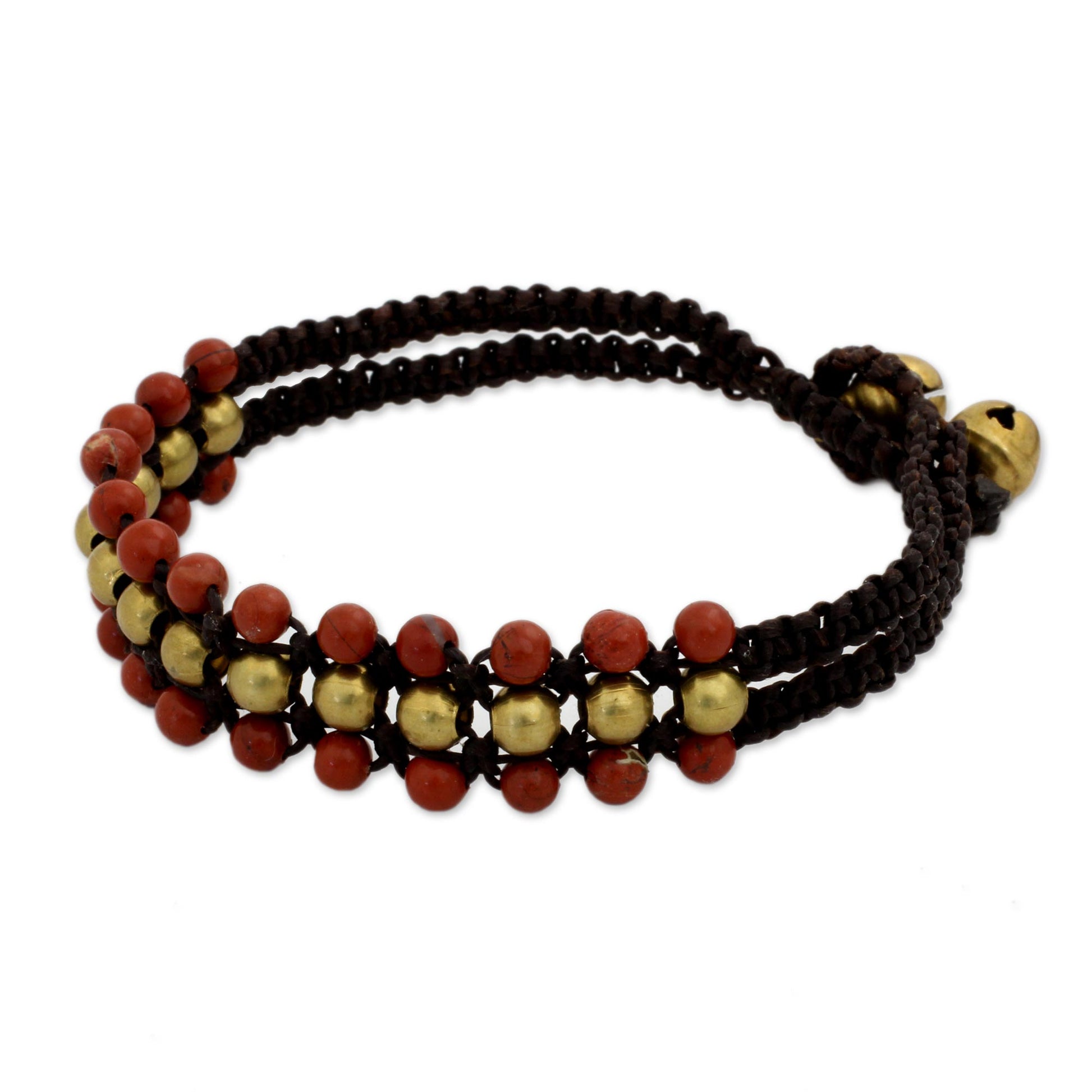 Thailand's Tiraphan Hasub finds inspiration in tribal fashions for this intriguing bracelet. Crocheted by hand, the wristband features enhanced red jasper globes flanking shiny brass beads. A tinkling brass bell becomes the clasp.