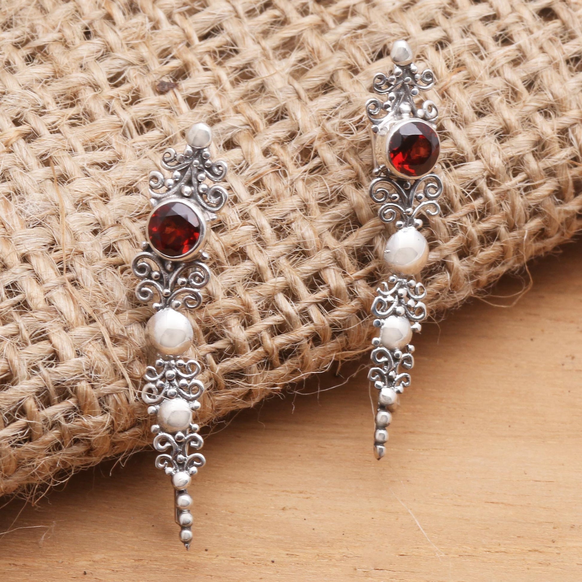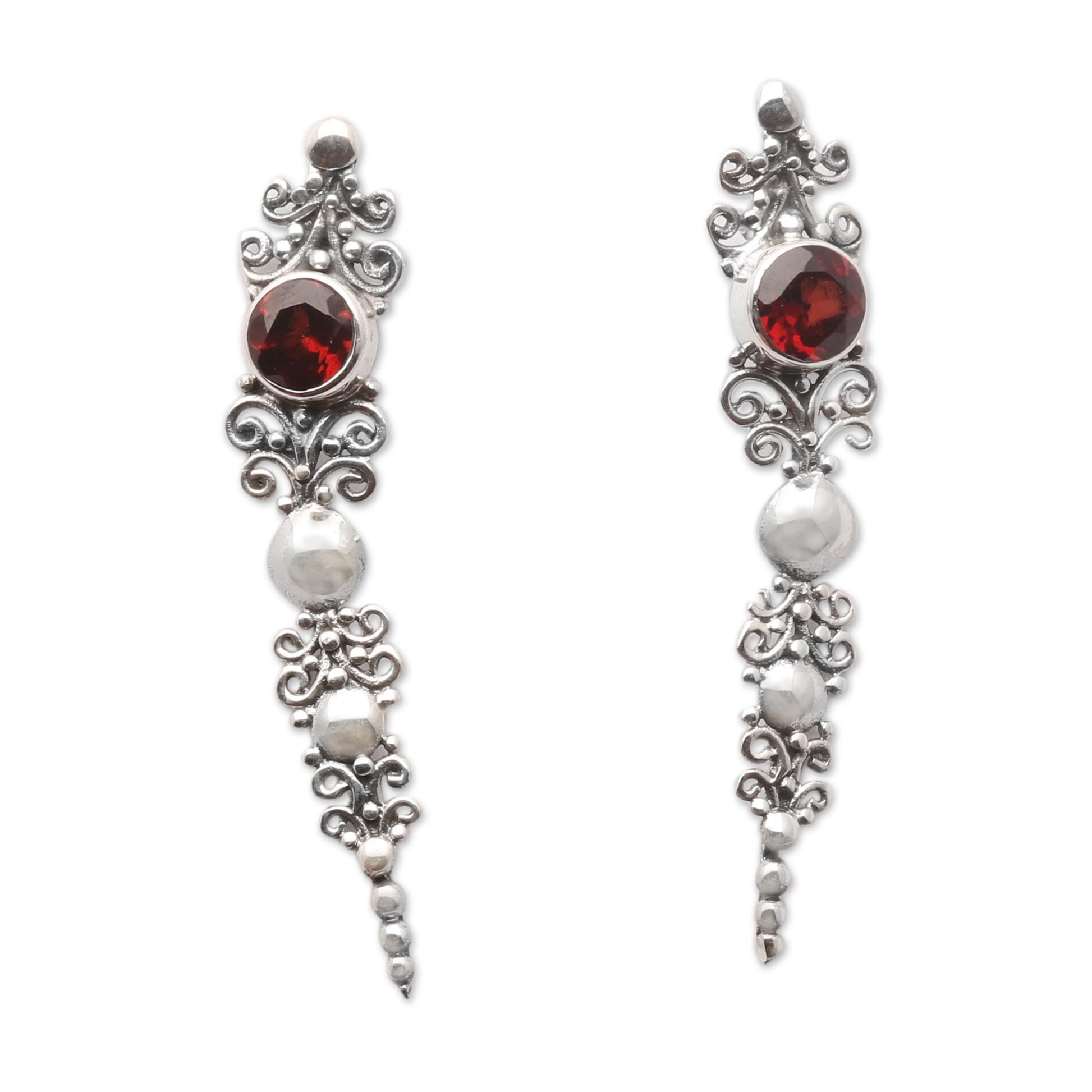 Artisan Eka Devi names her unique ear climber earring design after penjor, decorative bamboo poles used during ceremonies in Bali. The earrings are crafted from sterling silver and feature faceted round garnets that sparkle with crimson warmth.