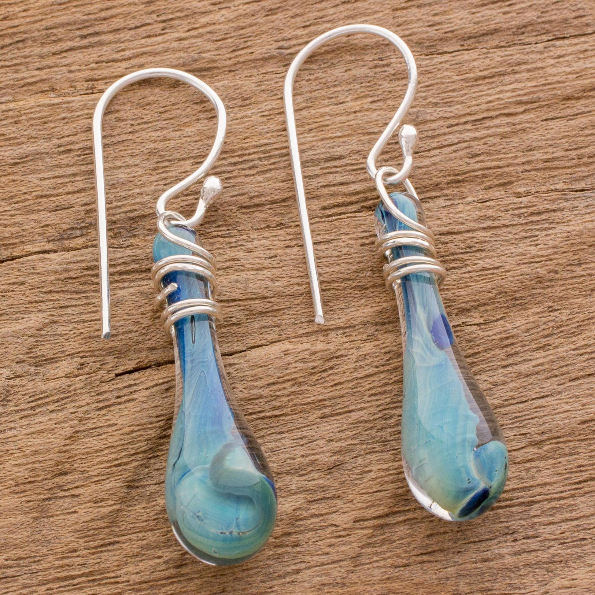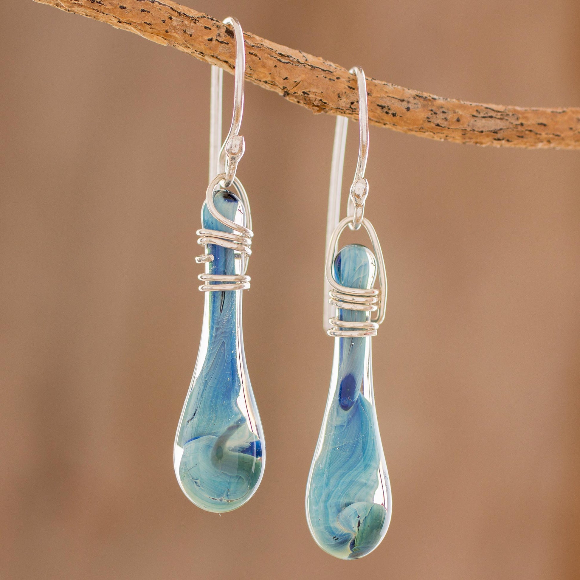 Inspired by the beautiful springs of Costa Rica, Guisselle Mora designs and crafts a pair of earrings that evokes a watery elegance. Two teardrops of glass are filled with aqua blue splashes, dangling from sterling silver hooks.