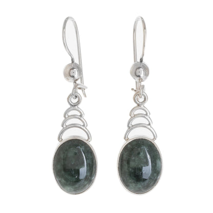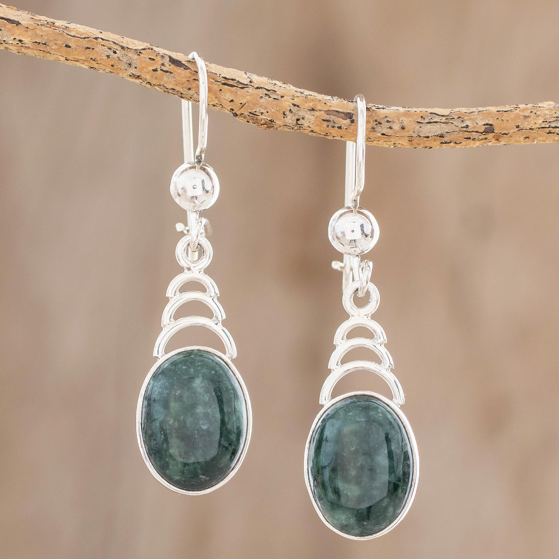 Crafted from sterling silver, gleaming arcs accentuate two ovals of natural dark green jade. Guatemalan artisan Zandra Lorena Sajbin creates a magnificent and versatile pair of dangle earrings.