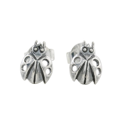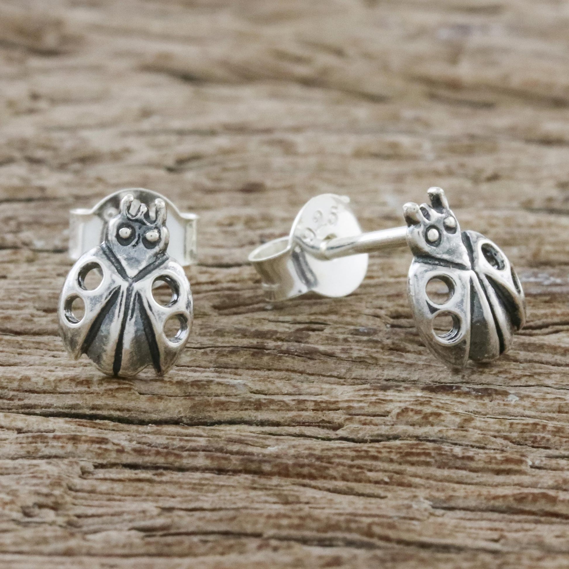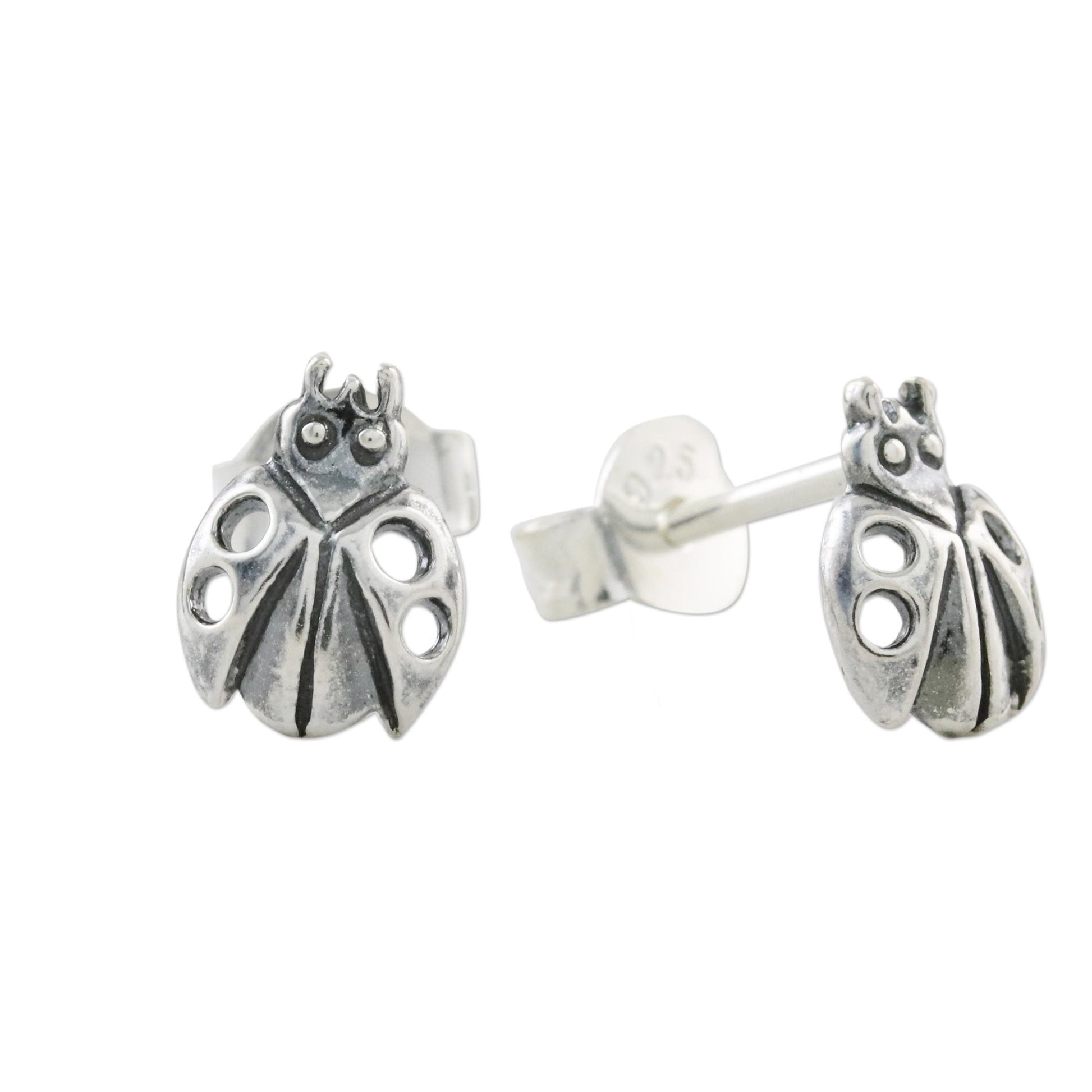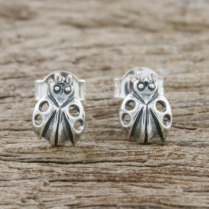 Crafted of sterling silver with openwork on their wings, two delightful ladybugs adorn the ears in a pair of stud earrings from Thailand. Wadarat Supasirisuk presents the earrings.