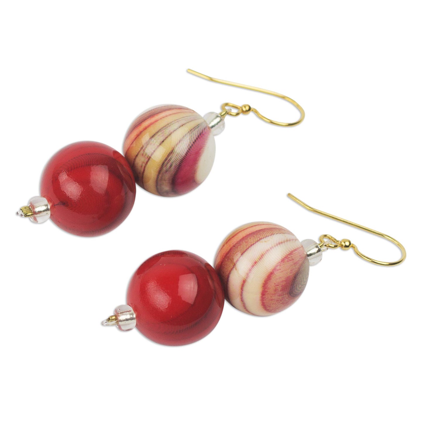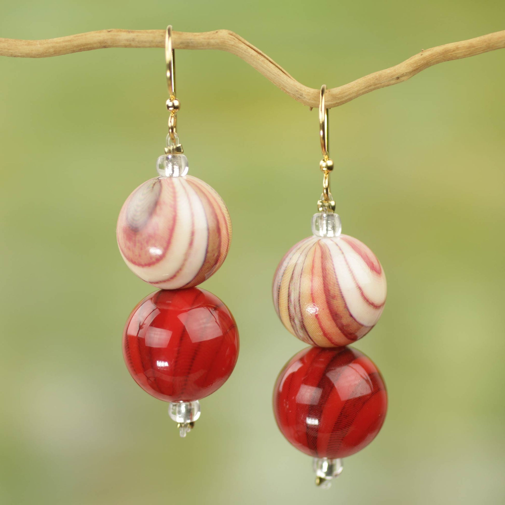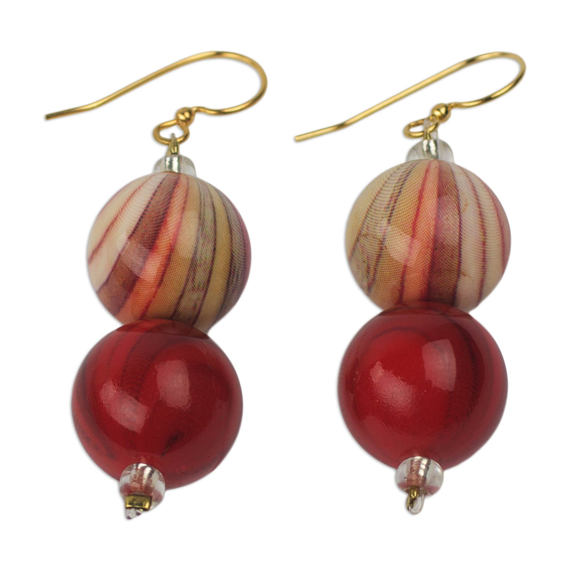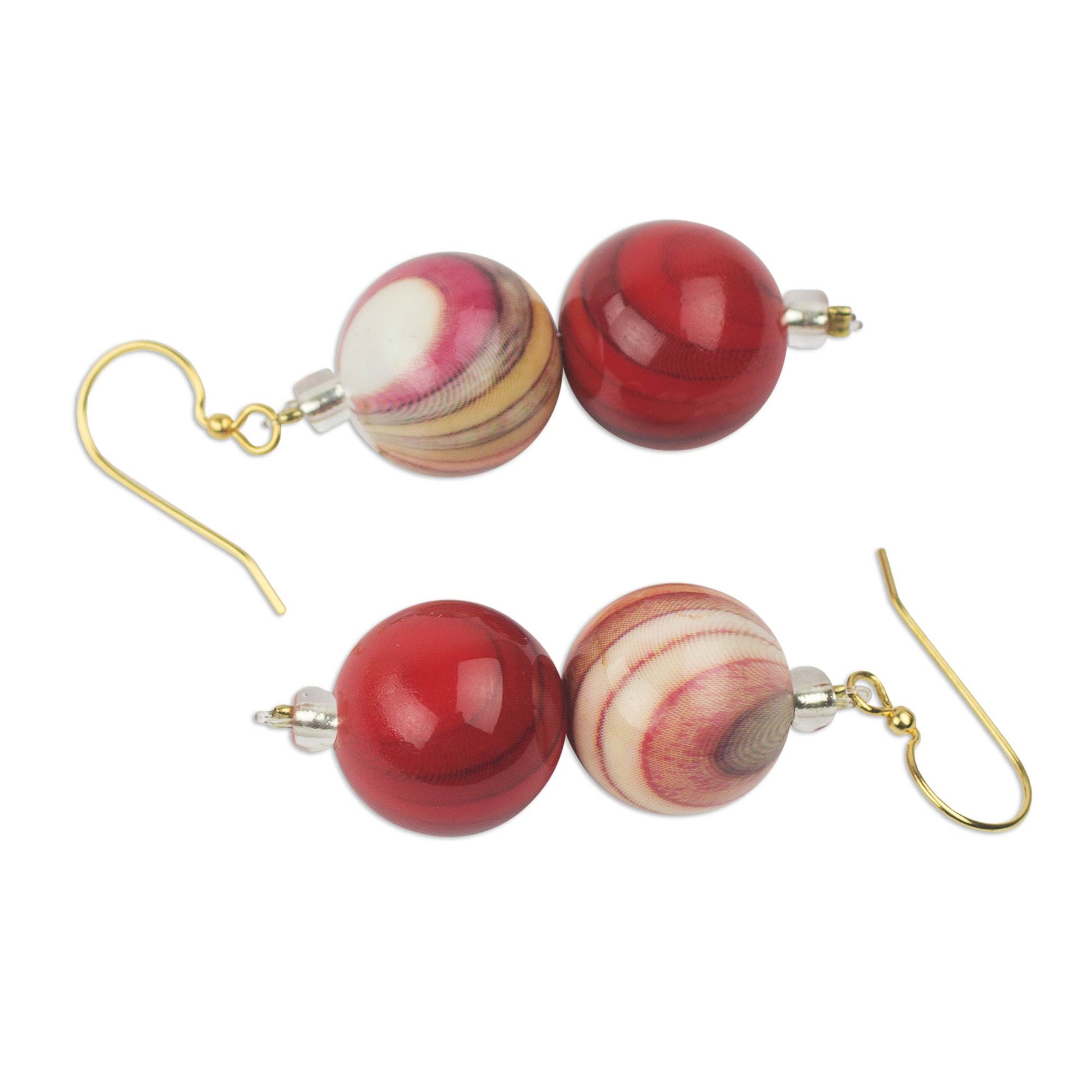Glistening and multi-colored, these beautiful dangle earrings are designed by Rita Addo Zakour of Ghana. Plastic from recycled drinking bottles is melted into liquid form and then poured into sphere-shaped molds, creating a unique marbled effect that is sure to impress.