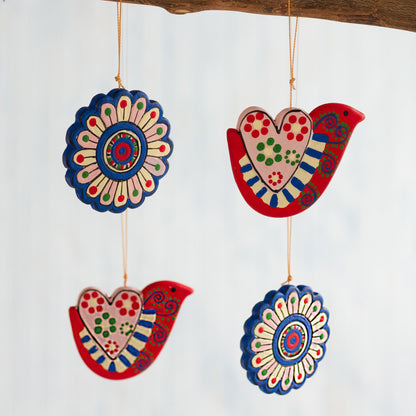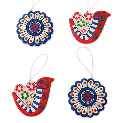 Crafted entirely by hand, these four ceramic ornaments are designed by Peru's Anita Contreras. This set of ornaments includes two flowers and two doves with hearts, each painted by hand with vibrant motifs.