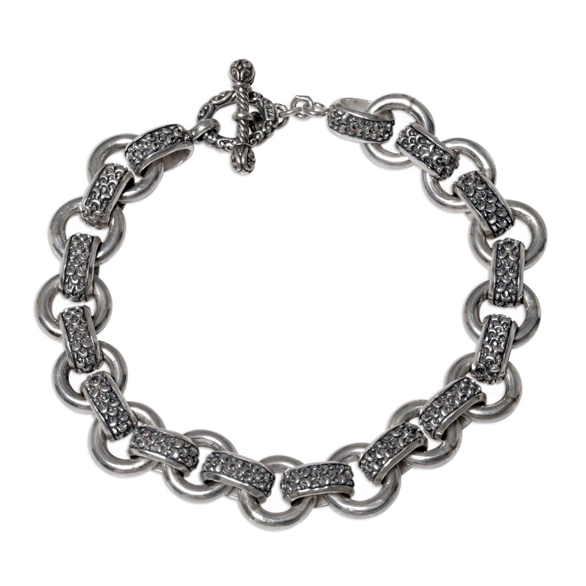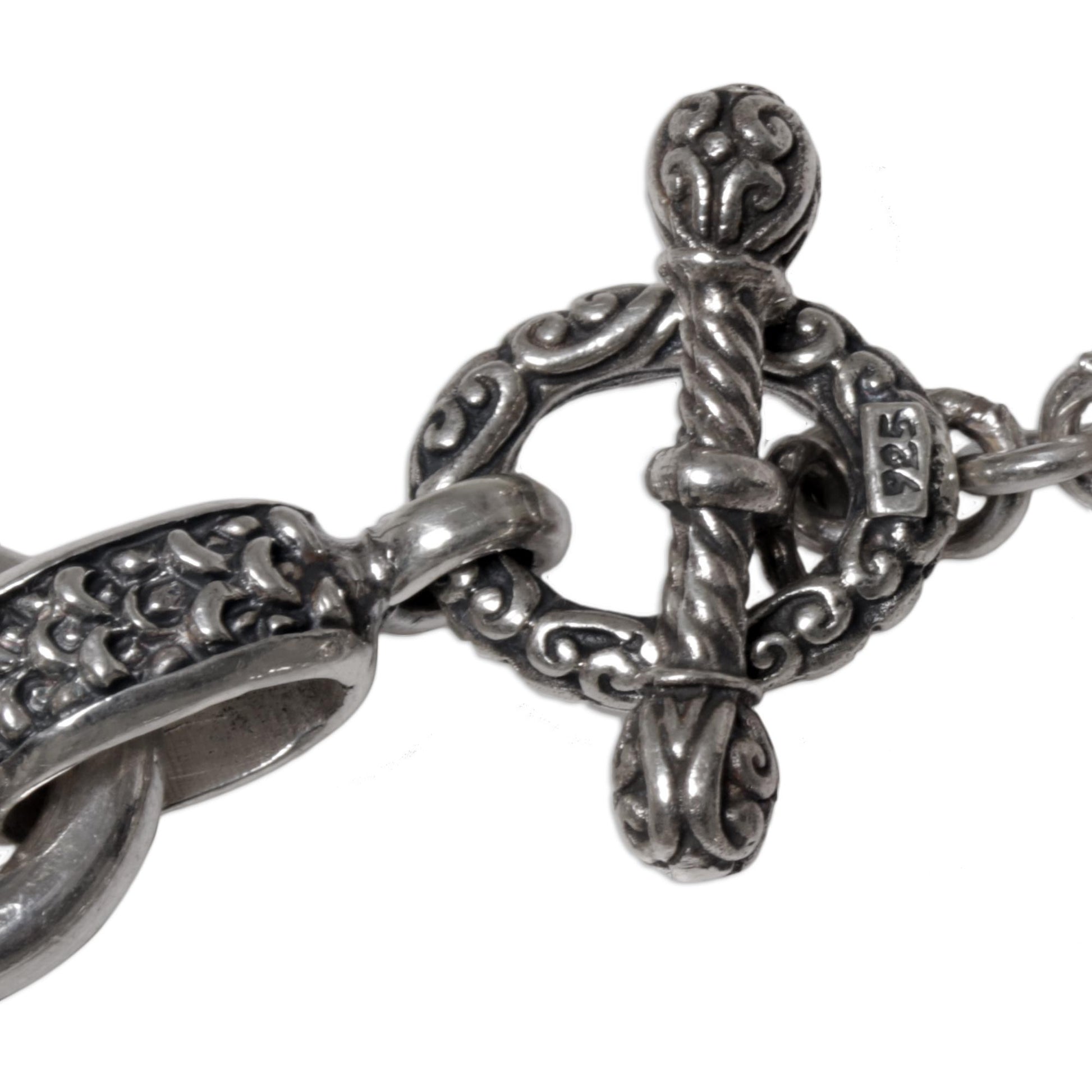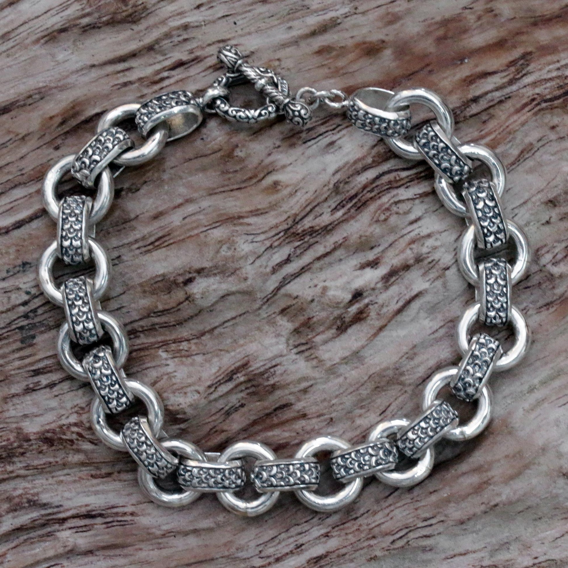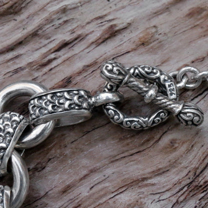 Sterling silver rings with scale motifs adorn the length of this link bracelet, crafted by local Indonesian artisans. Presented by Wayan Asmana, the elegant bracelet features a detailed toggle clasp.