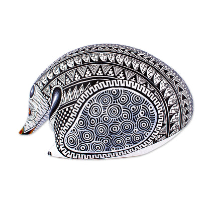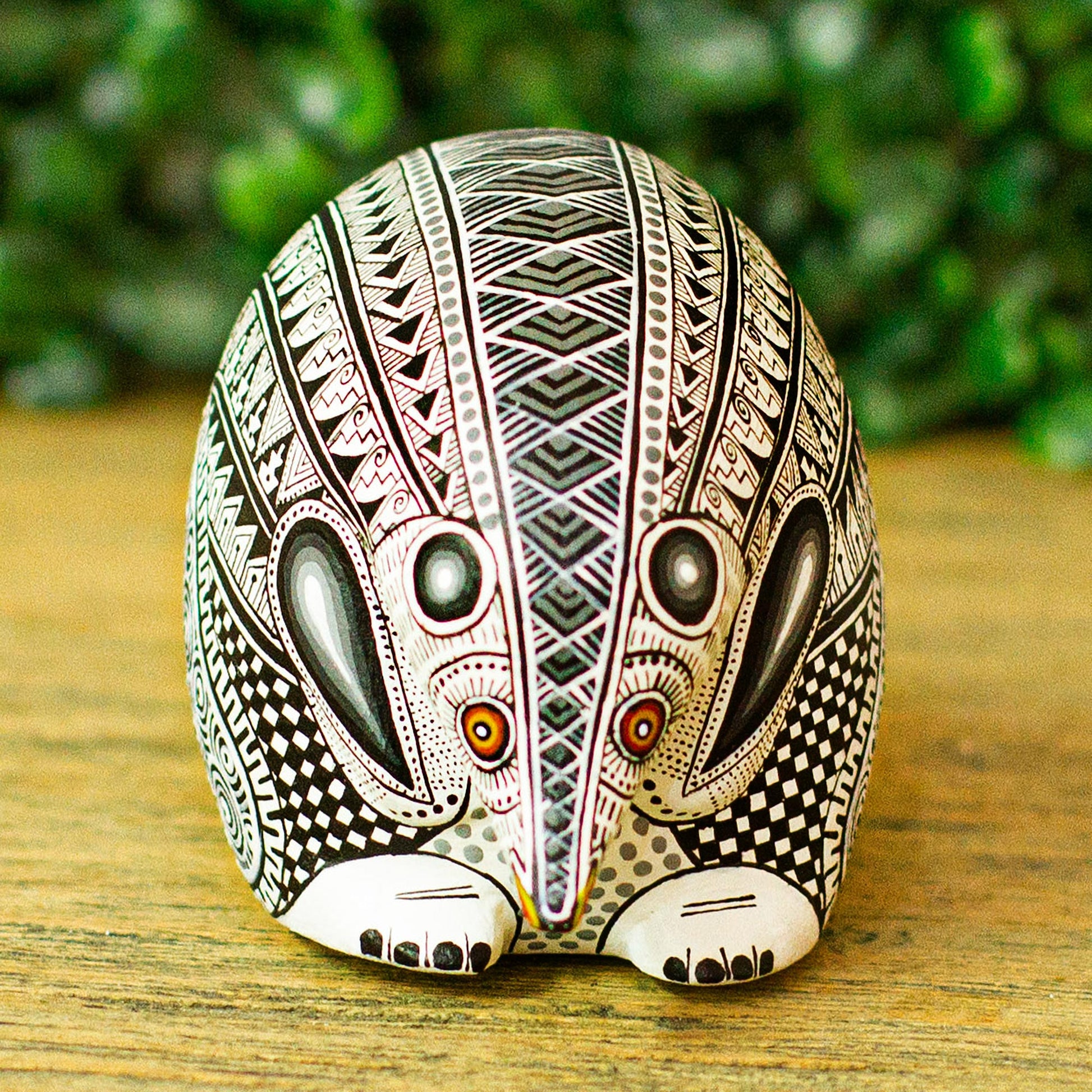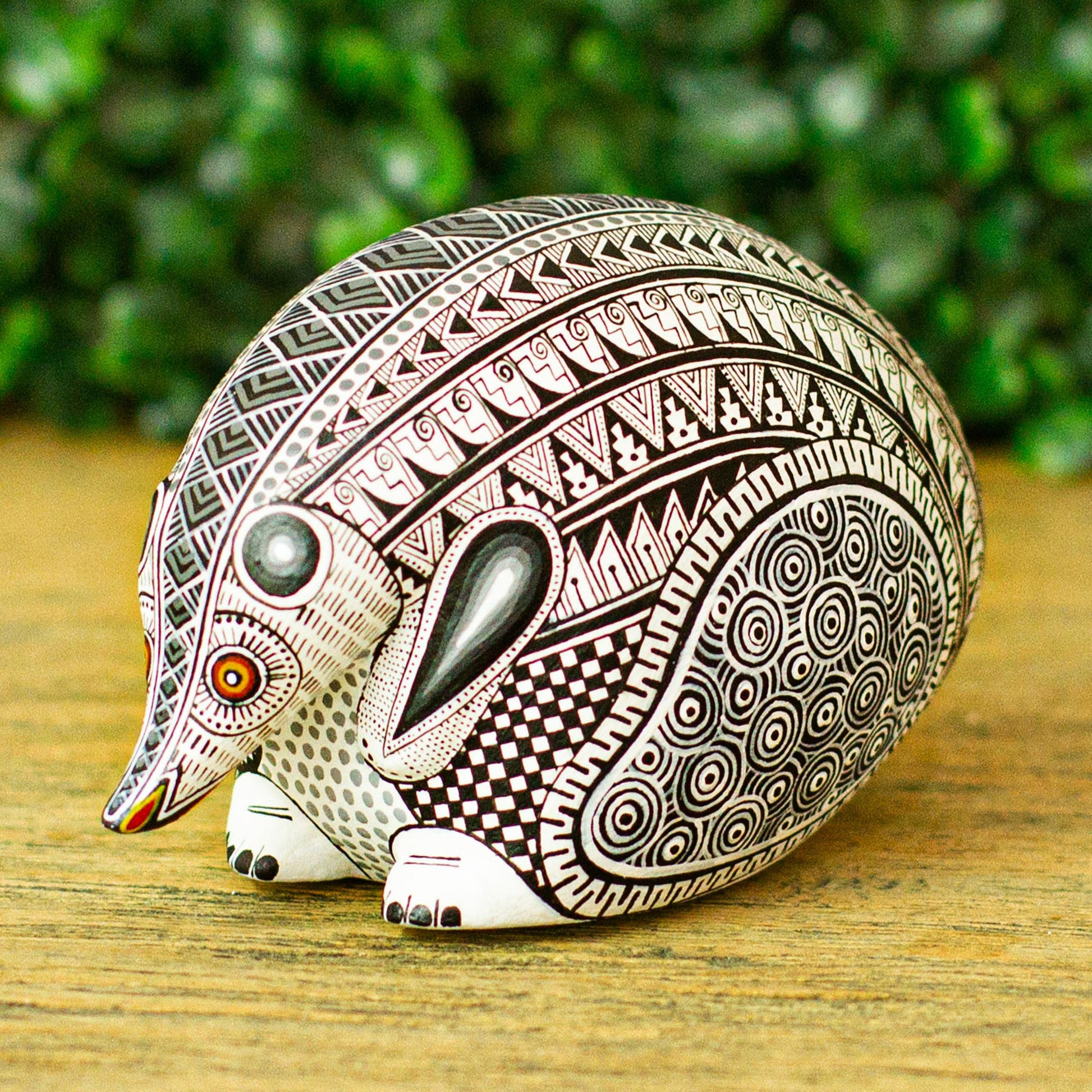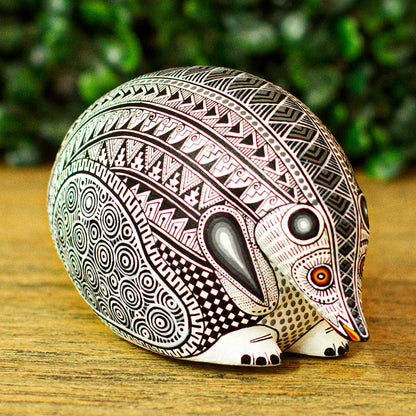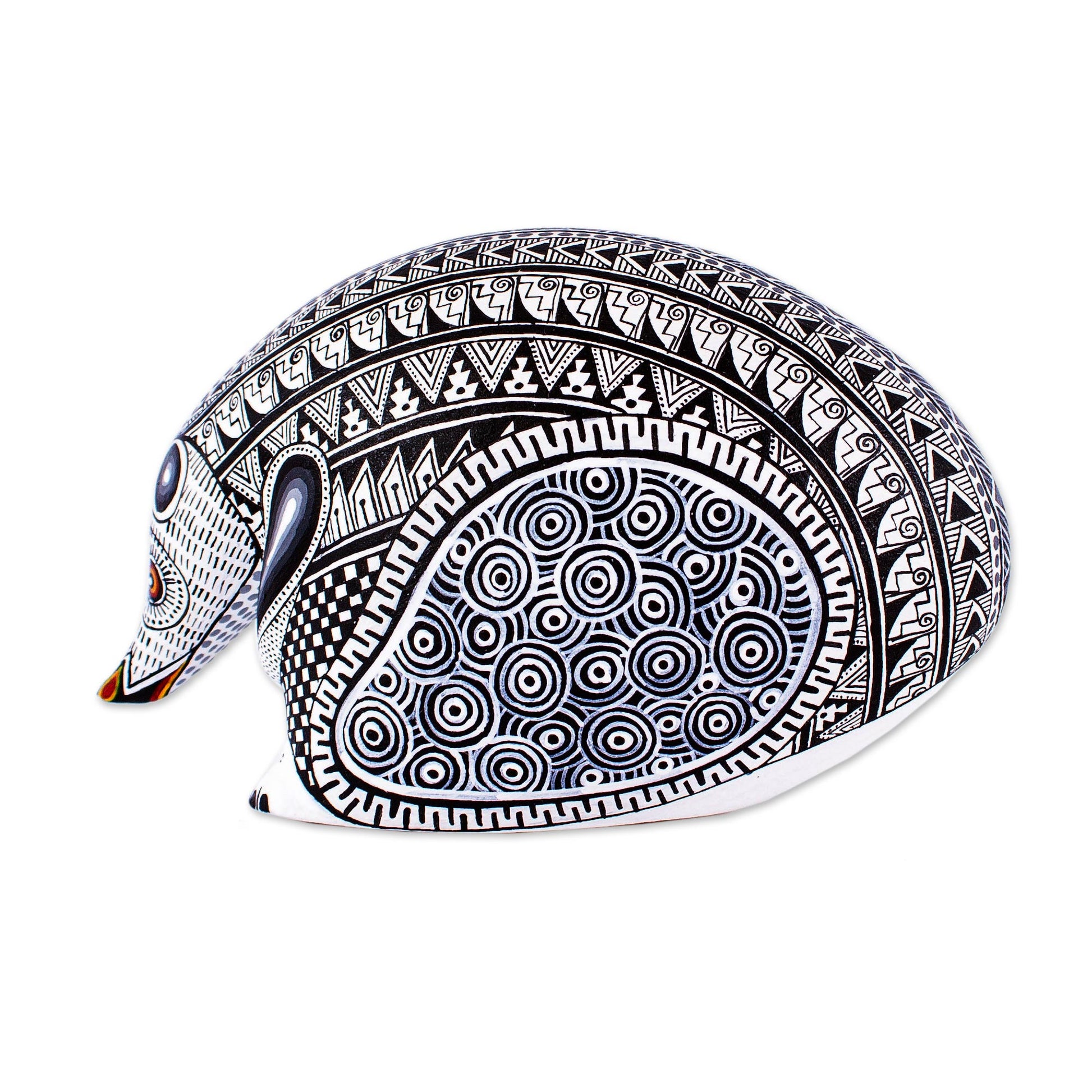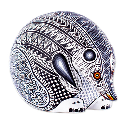 This unique hedgehog alebrije figurine is the design of artisan Manuel Cruz. The small figurine is hand carved from copal wood and delicately hand painted in black and white with tones of grey, using a maguey thorn for finer details. Symmetrical lines, triangles and stepped fretwork give this alebrije its unique design.
