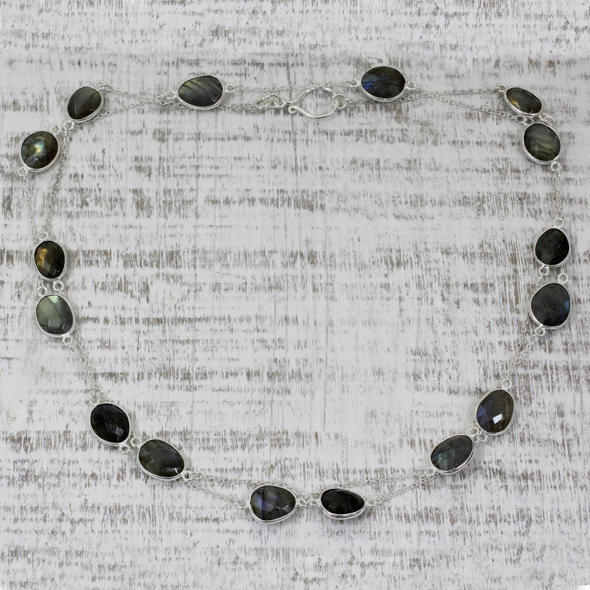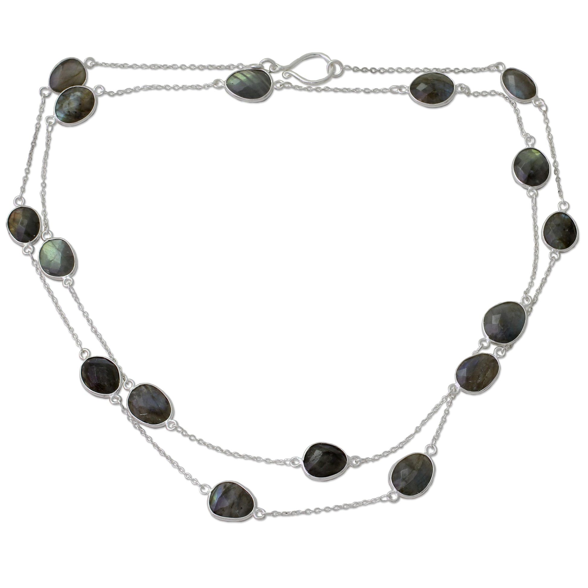 Aparna handcrafts the long sterling silver bracelet with faceted labradorite. This necklace by Aparna mirrors the crystalline majesty of the Duduma waterfall, in the verdant lands of Orissa. The necklace can wrap around twice.