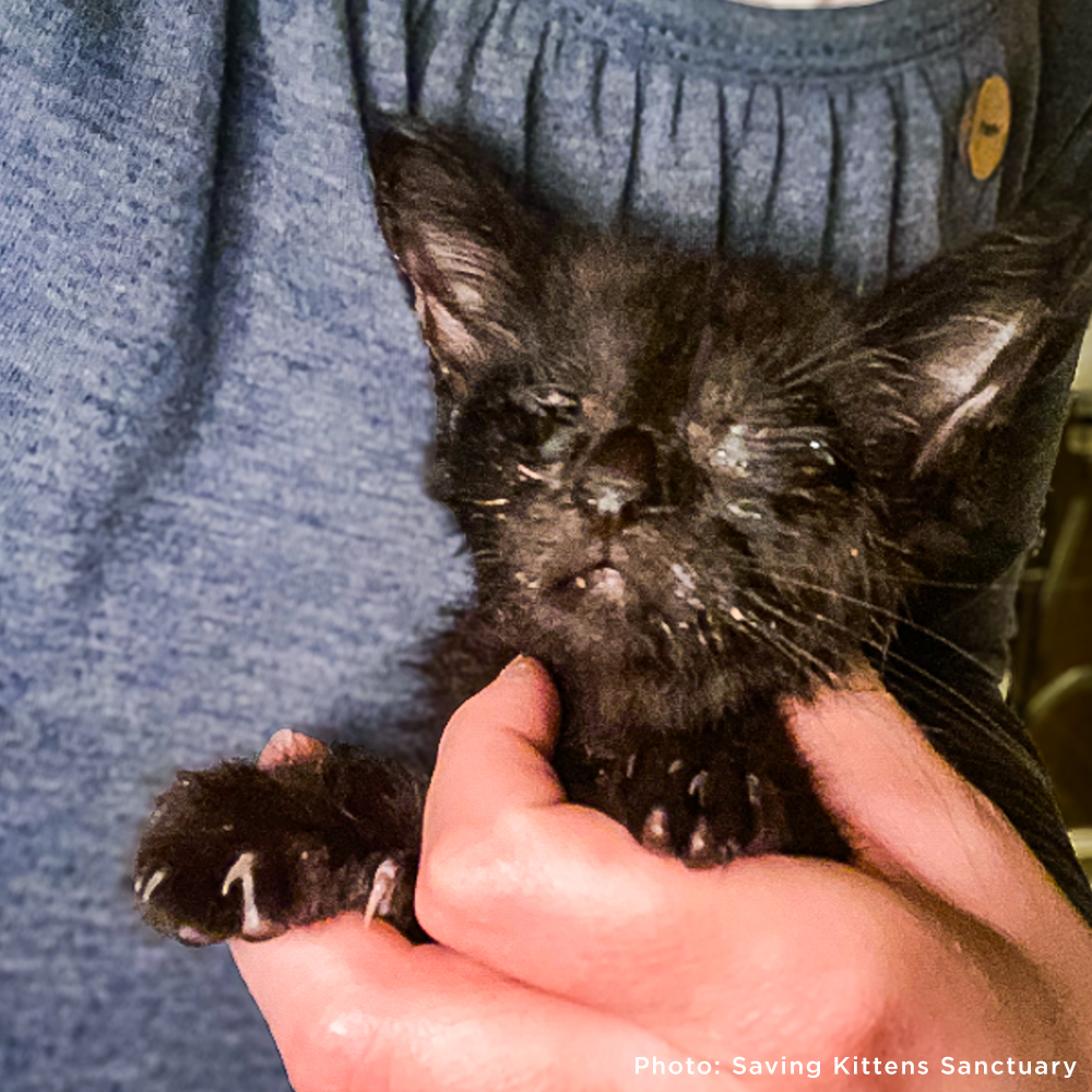 UPDATE: Aemond had surgery to remove his infected eye and is doing well. The rescue shared, "This baby not only retained vision in his good eye, but found a home in the arms of his foster mum and dad permanently. After they worked so hard to pull him through the other side, they couldn't bear to let him go. This sweet bean has never known hunger, pain, sadness, or suffering since the day we pulled his crippled body from the pavement while he sat in the rain praying for a quick death."