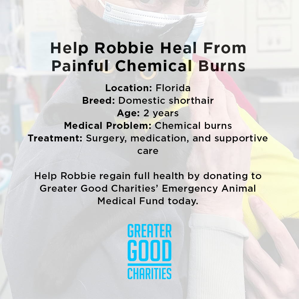 Robbie was brought to a shelter after his rescue from the streets. He was found with severe chemical and acid burns across his body, the result of abuse. Shelter staff transferred him to a vet hospital in hopes they could treat this sweet boy.