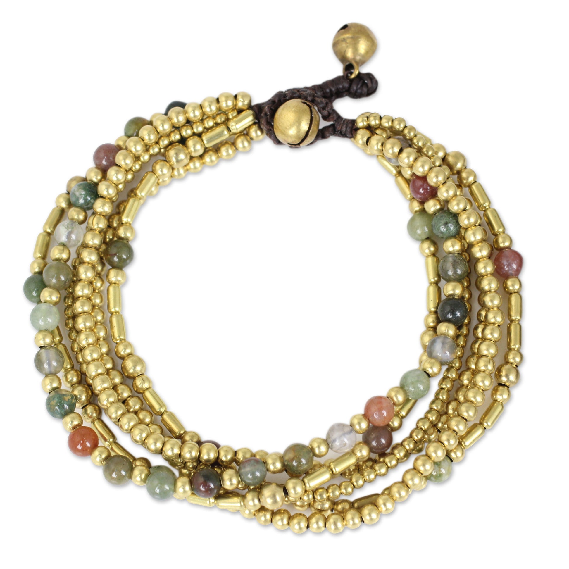 Accents in shades of green and brown cast a harmonious contrast to a glistening bracelet from Thailand. Tiraphan Hasub crafts the bracelet by hand with strands of enhanced agate and brass beads. The bracelet fastens at one of two lengths.