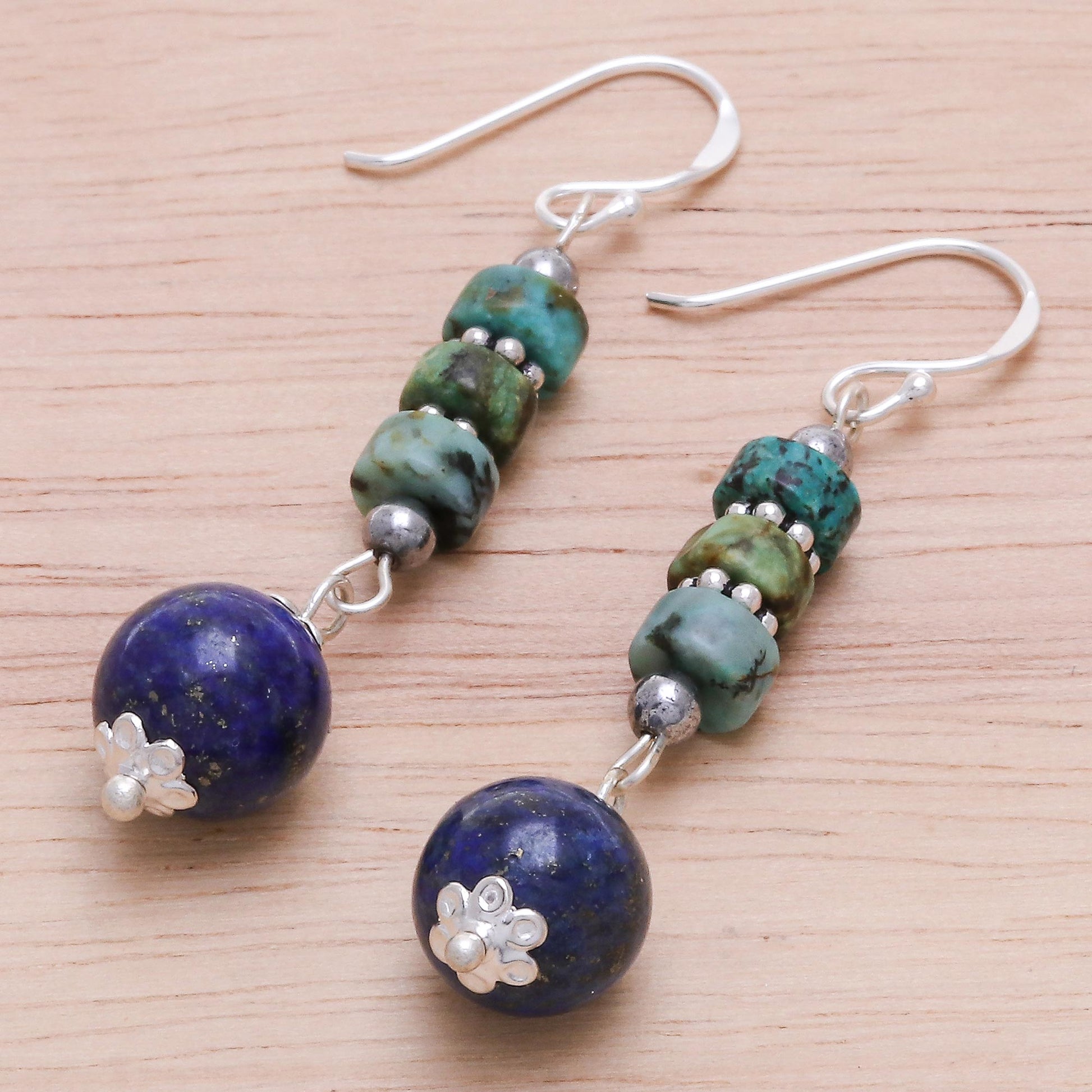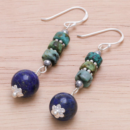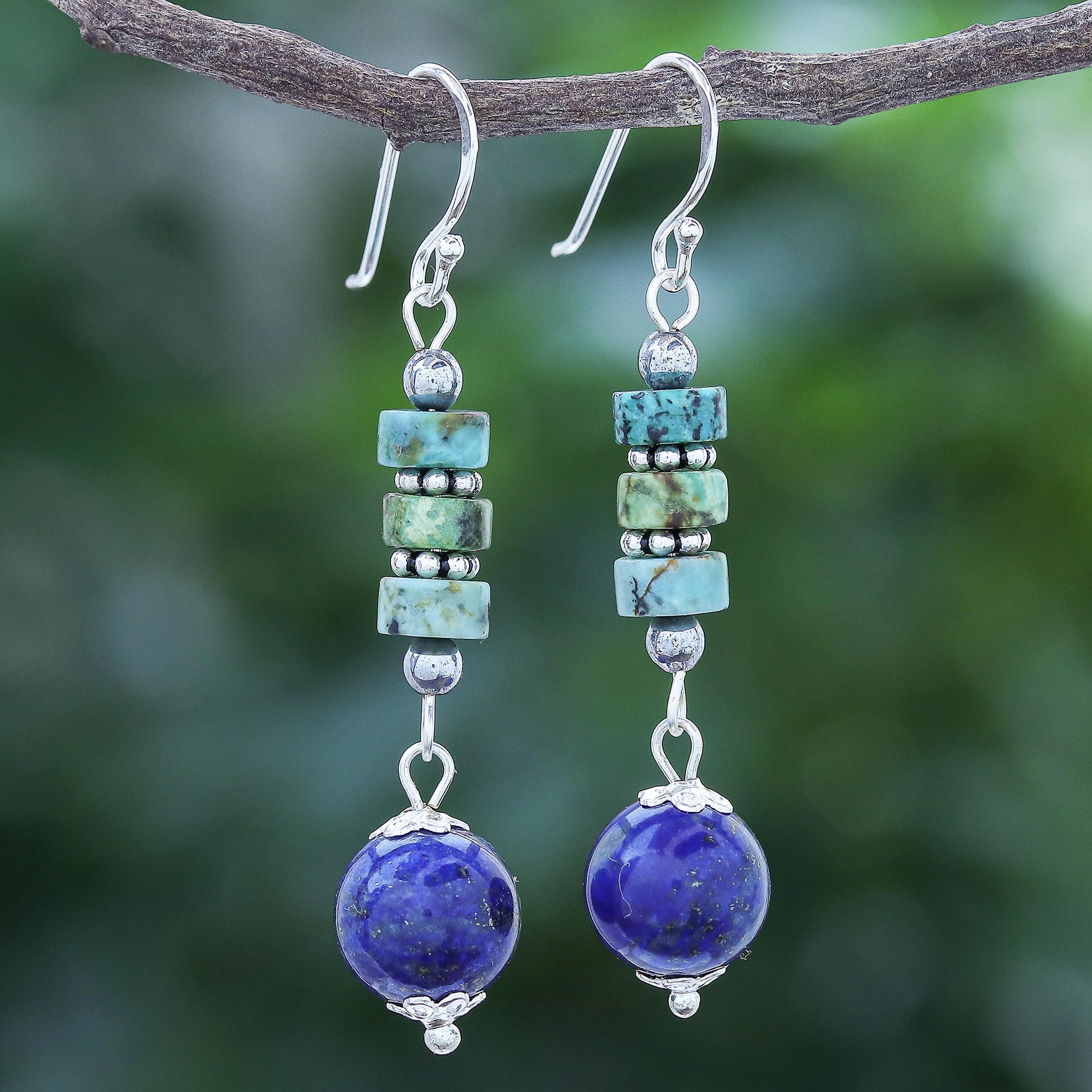 A deep blue lapis lazuli orb dangles from a gleaming hematite bead in these cool-hued dangle earrings designed by Thai artisan Tipa. A row of reconstituted turquoise disks sits above the lapis, flanked by hematite and interspersed with sterling silver beads. The earrings are finishing with shining sterling silver hooks.