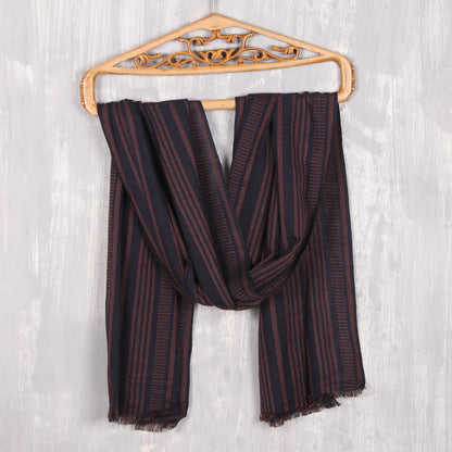 Combining solid navy with dotted stripes of peach, this woven cotton shawl is created by Danish Ansari in India. This lovely, fringed accessory can be draped over the shoulders or worn as a wrap scarf.
