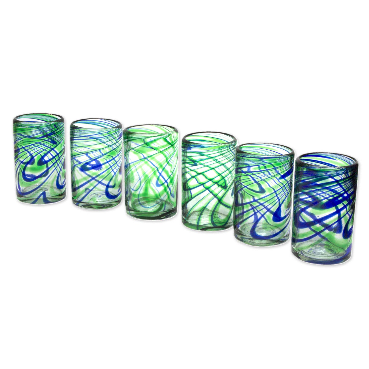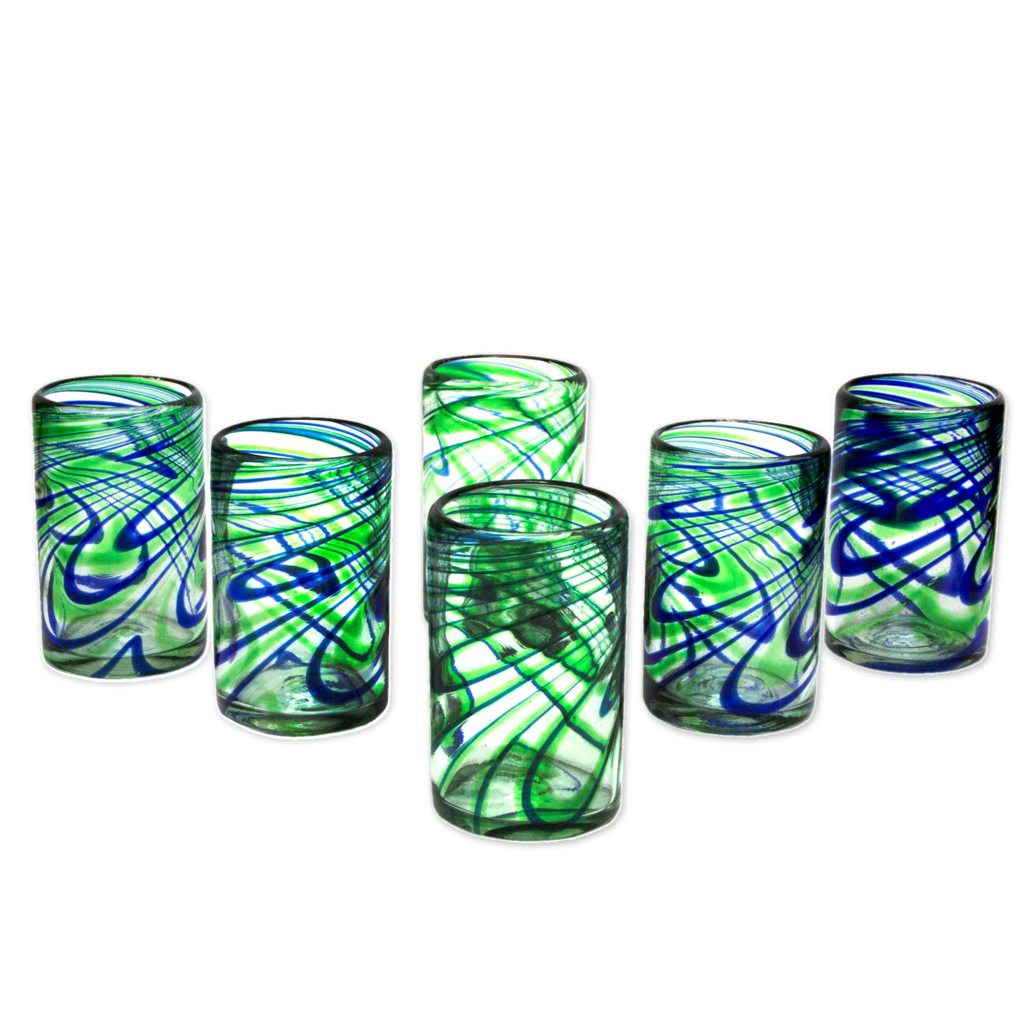 Streams of emerald green and cobalt blue bring elegant energy to a set of six tumblers from Mexico's Javier and Efrén. Each glass is individually crafted by hand with millenary blown glass techniques.