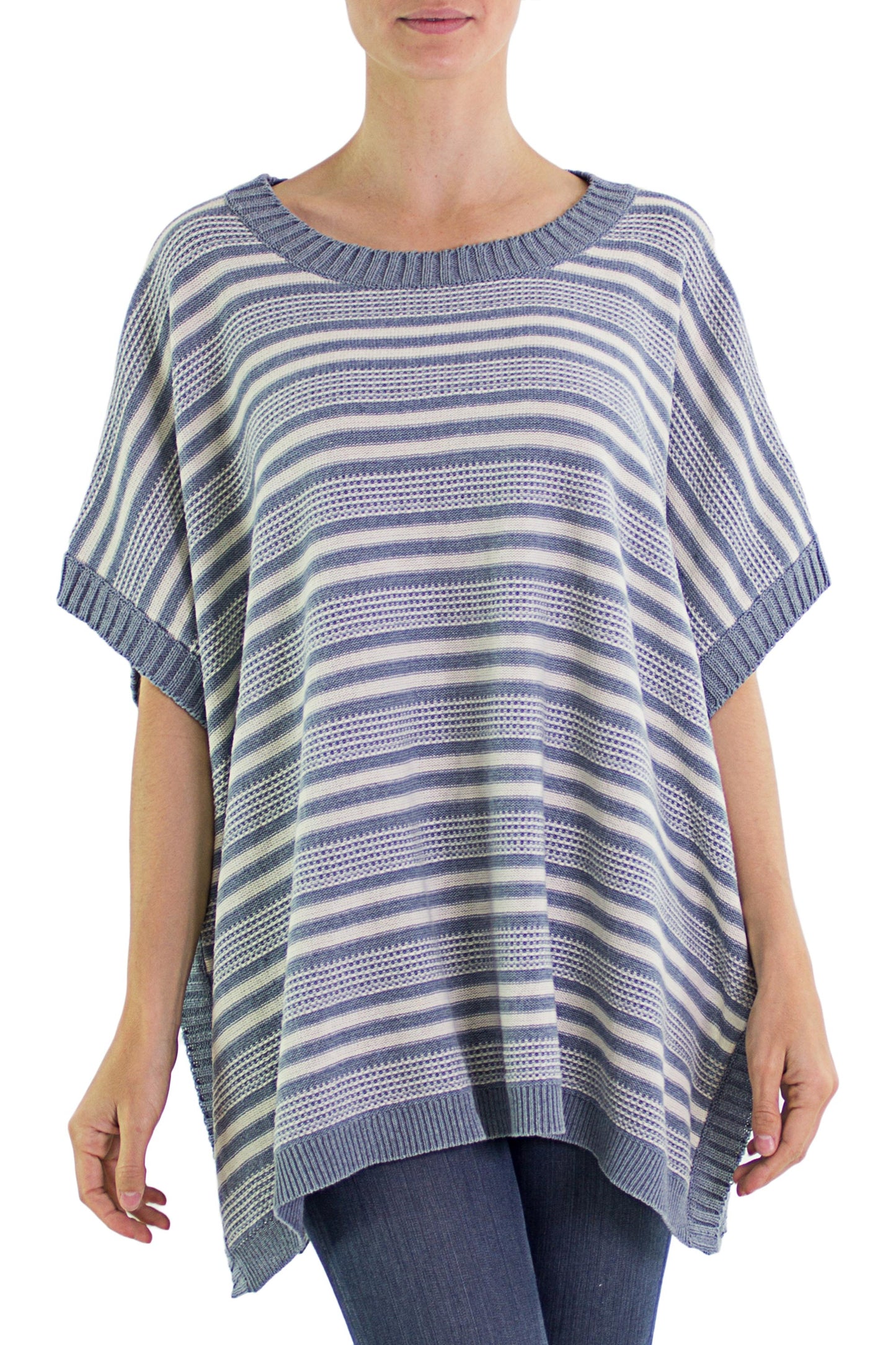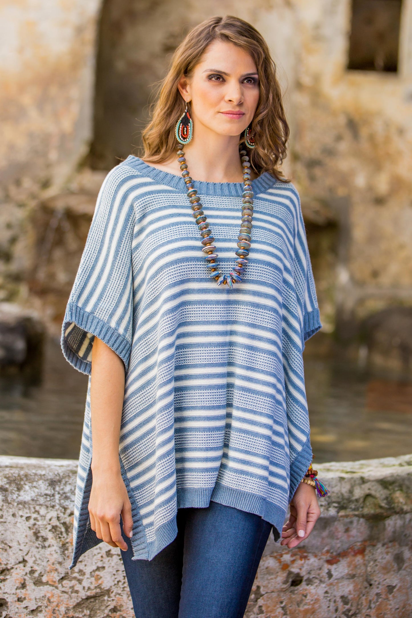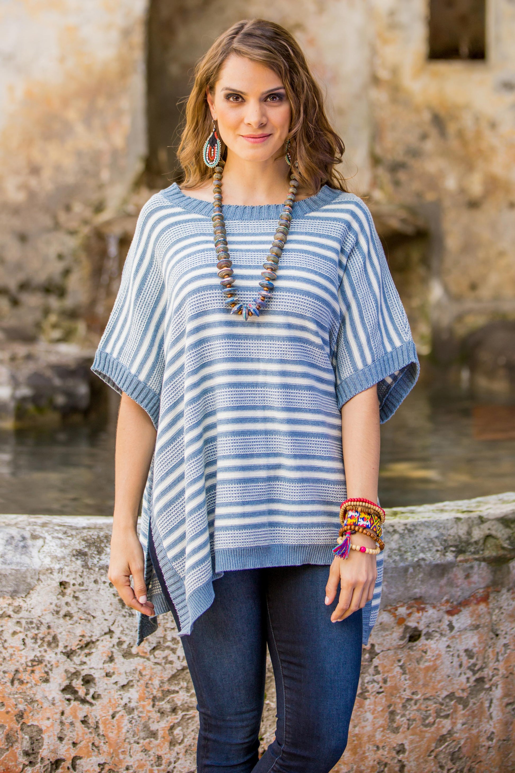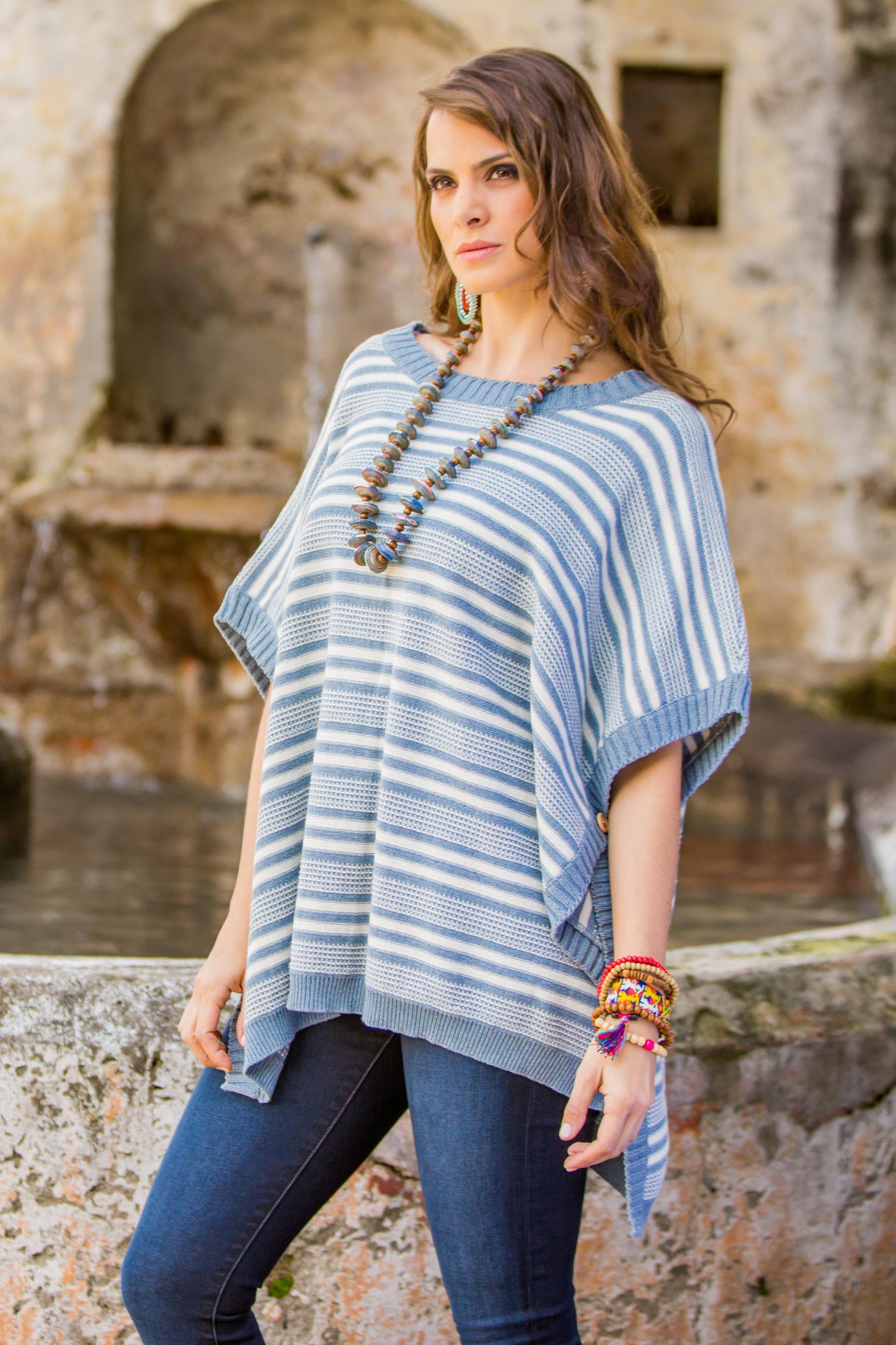 Luisa Villavicencio is an artisan from Guatemala who uses natural cotton from her family's farm to create wonderful attire. She designs this poncho, knit from 100% cotton and recycled denim with stripes in natural cadet blue and champagne colors. Pinewood buttons fasten the sides of this striped wrap.