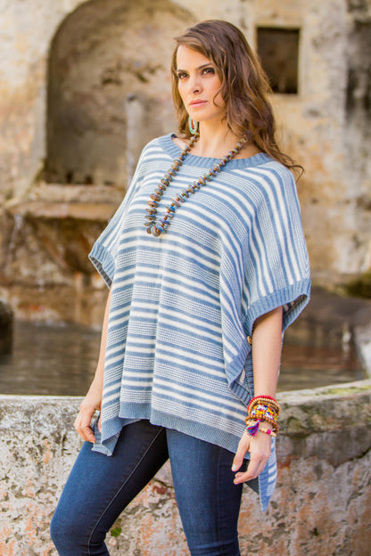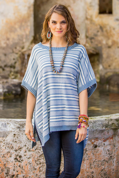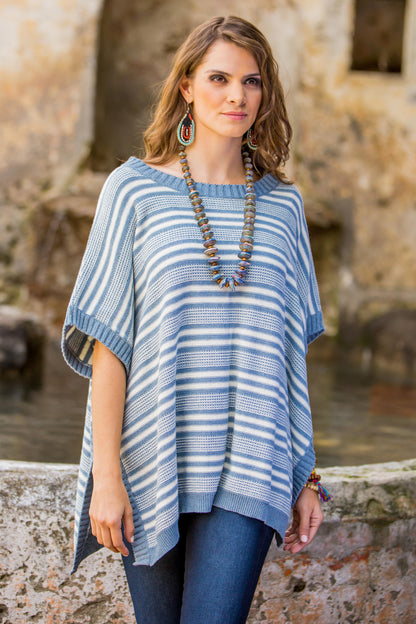 Elegant Stripes Cotton Poncho Blue Stripes Wood Buttons from Guatemala