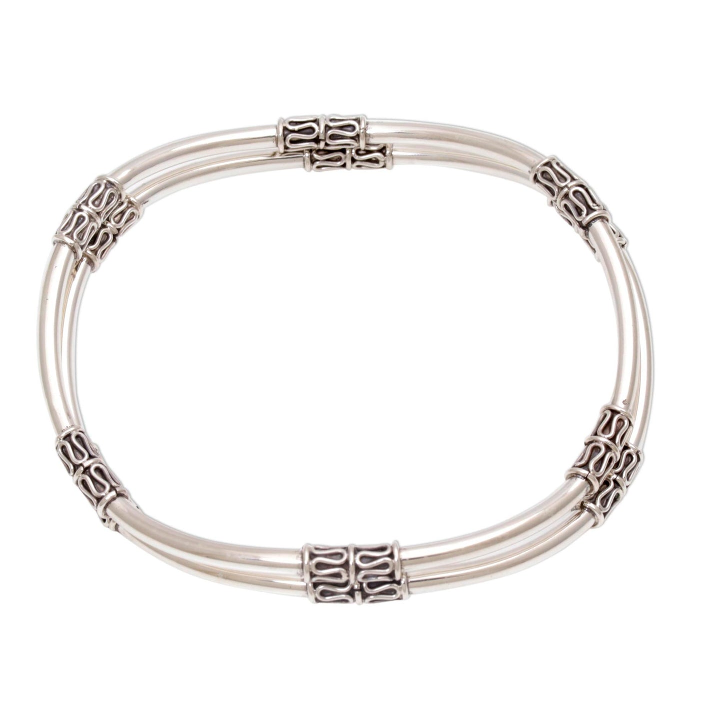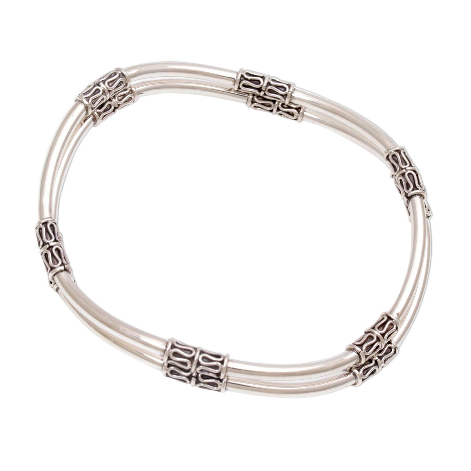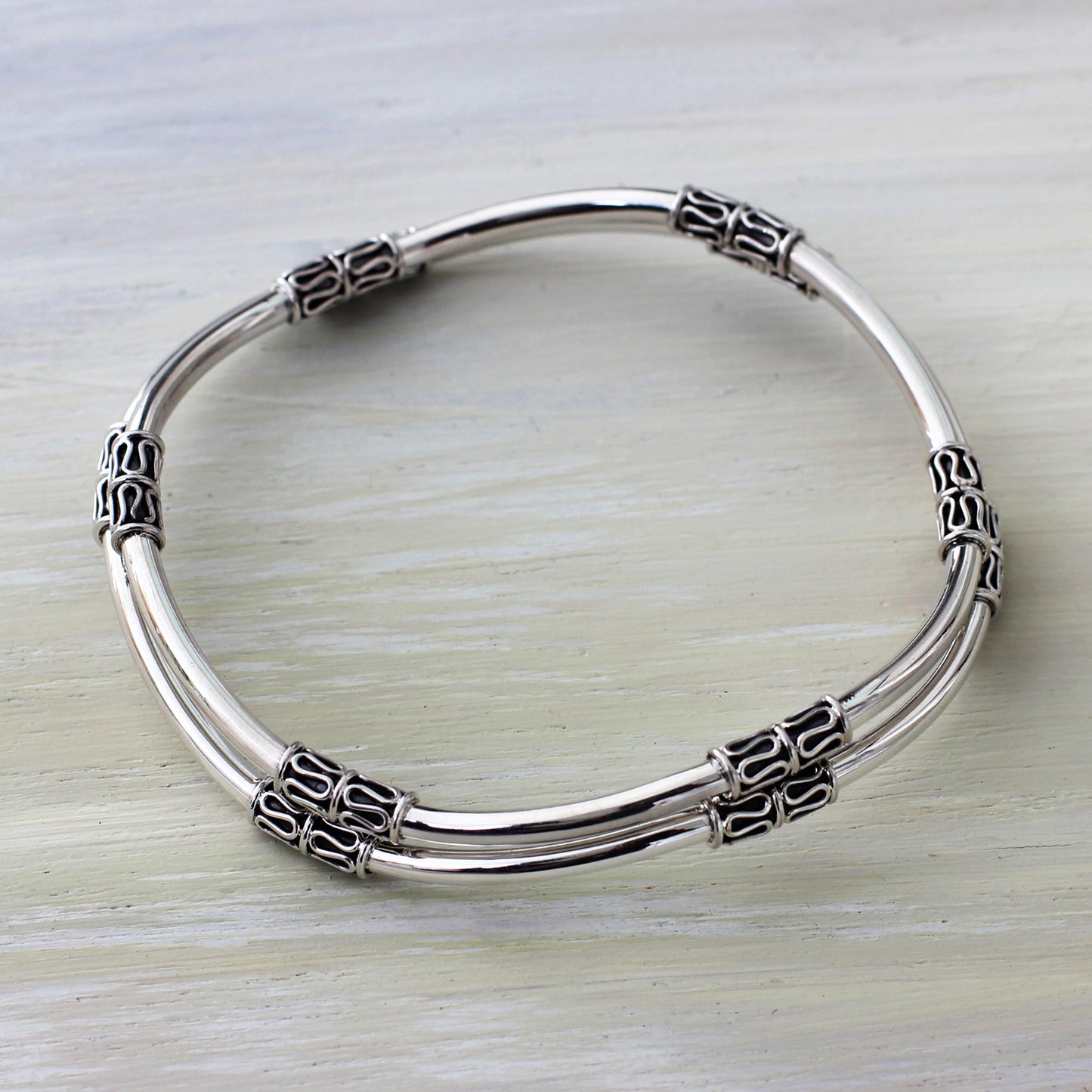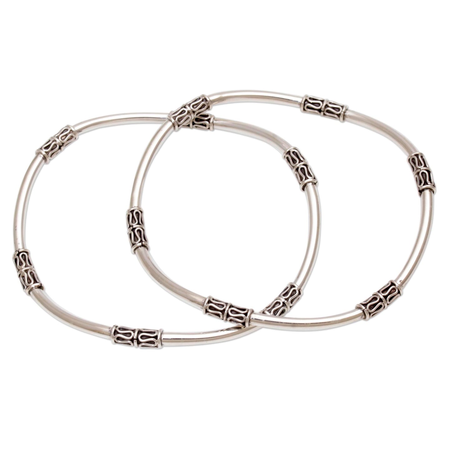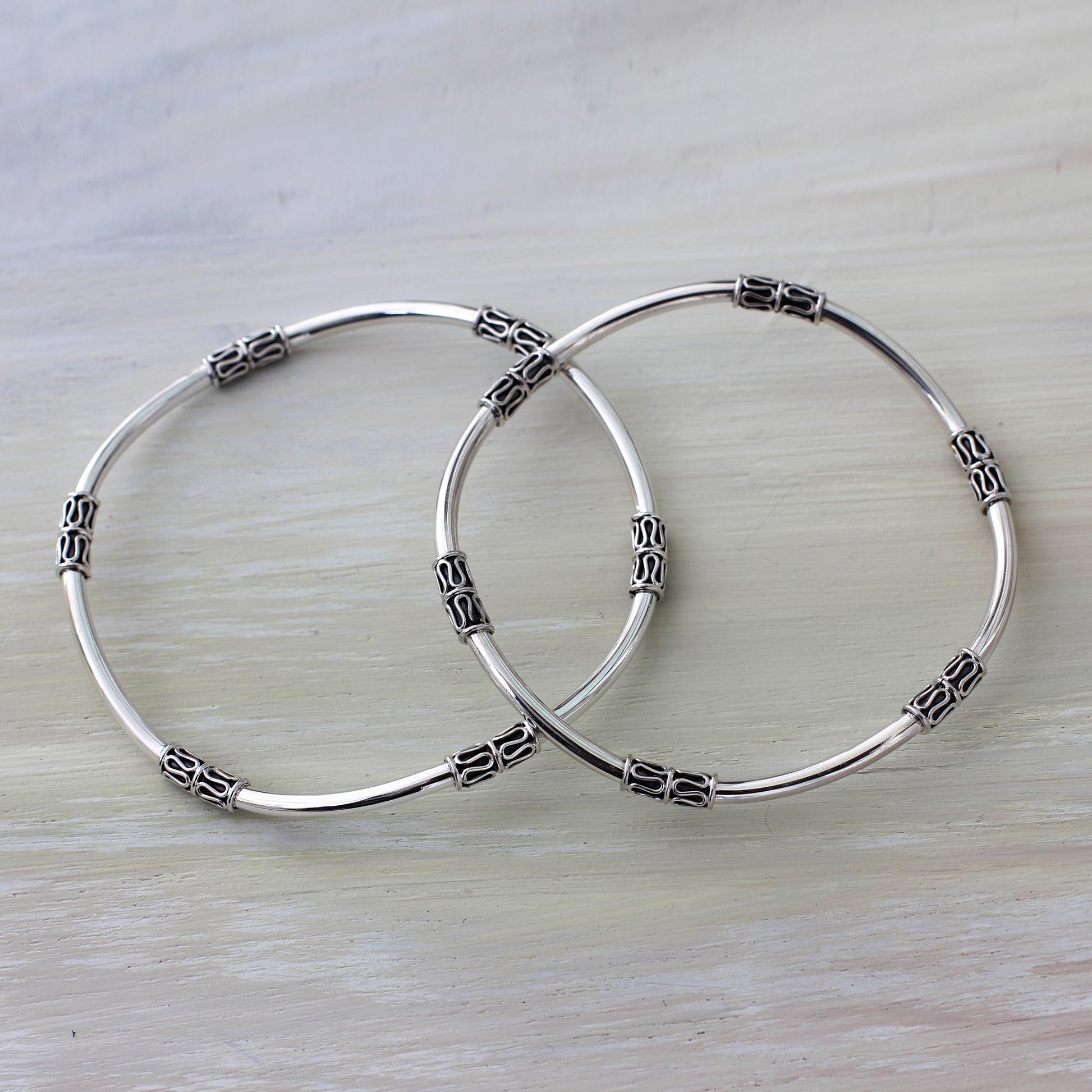 A modern Indonesian motif styles these two slender braceletes from Komang Suastra. Crafted by hand, the sleek circlets are embraced by textured silver ribbons.