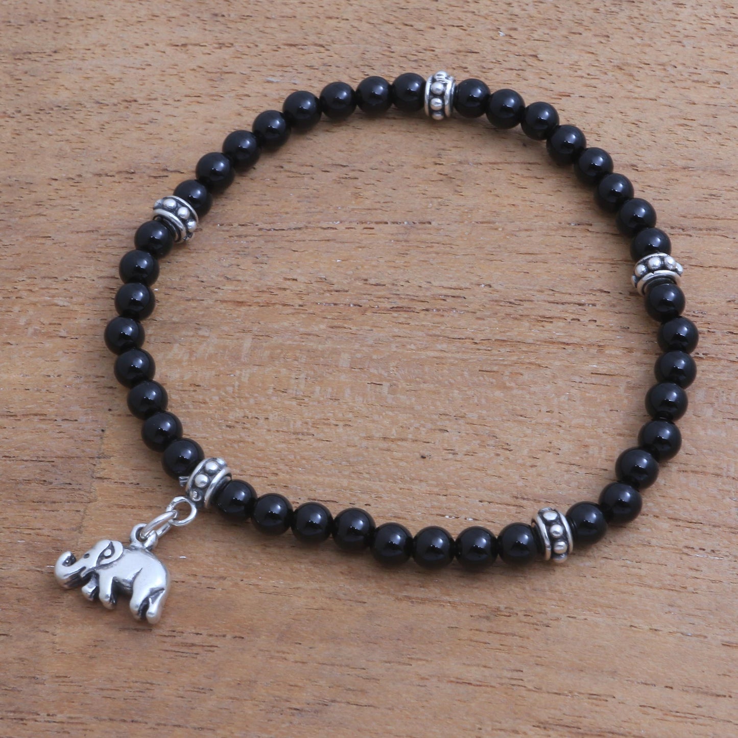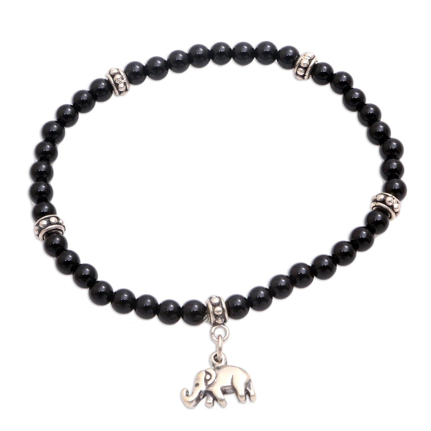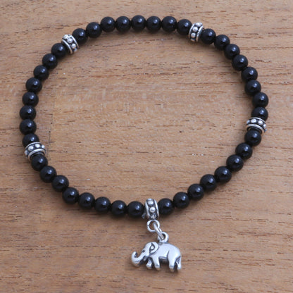 Dangling from this elegant stretch bracelet, an elephant charm is crafted of sterling silver. Balinese artisan Asmara Putra designs the bracelet, which circles the wrist with dark onyx and sterling silver beads.