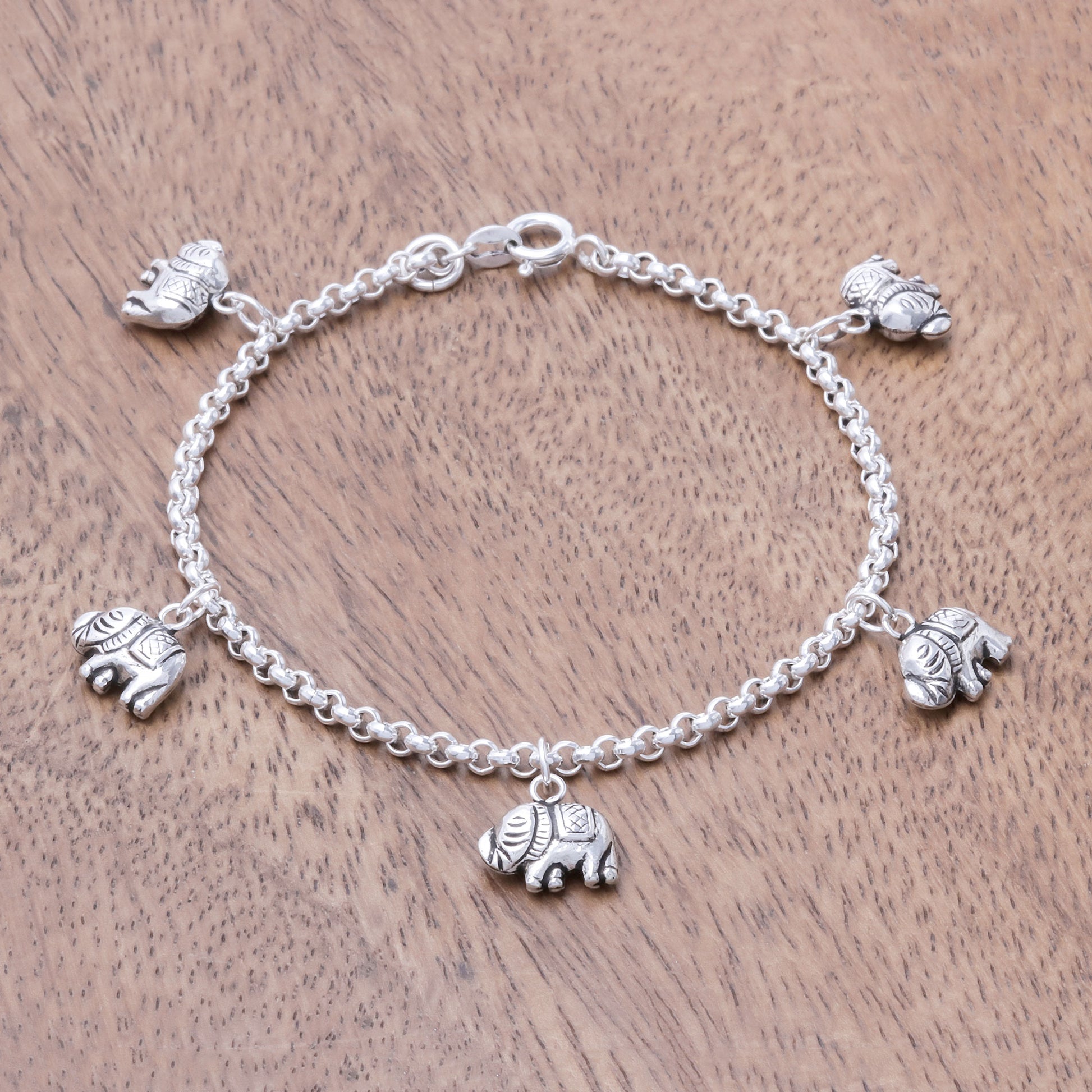 For a marvelous accessory, this bracelet is presented by Thailand's Wadarat Supasirisuk. A sterling silver rolo chain circles the wrist, decorated with five sterling elephant charms that dangle.
