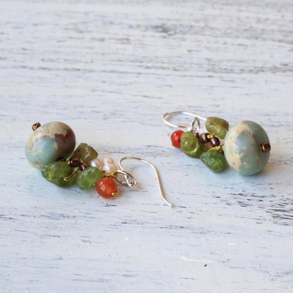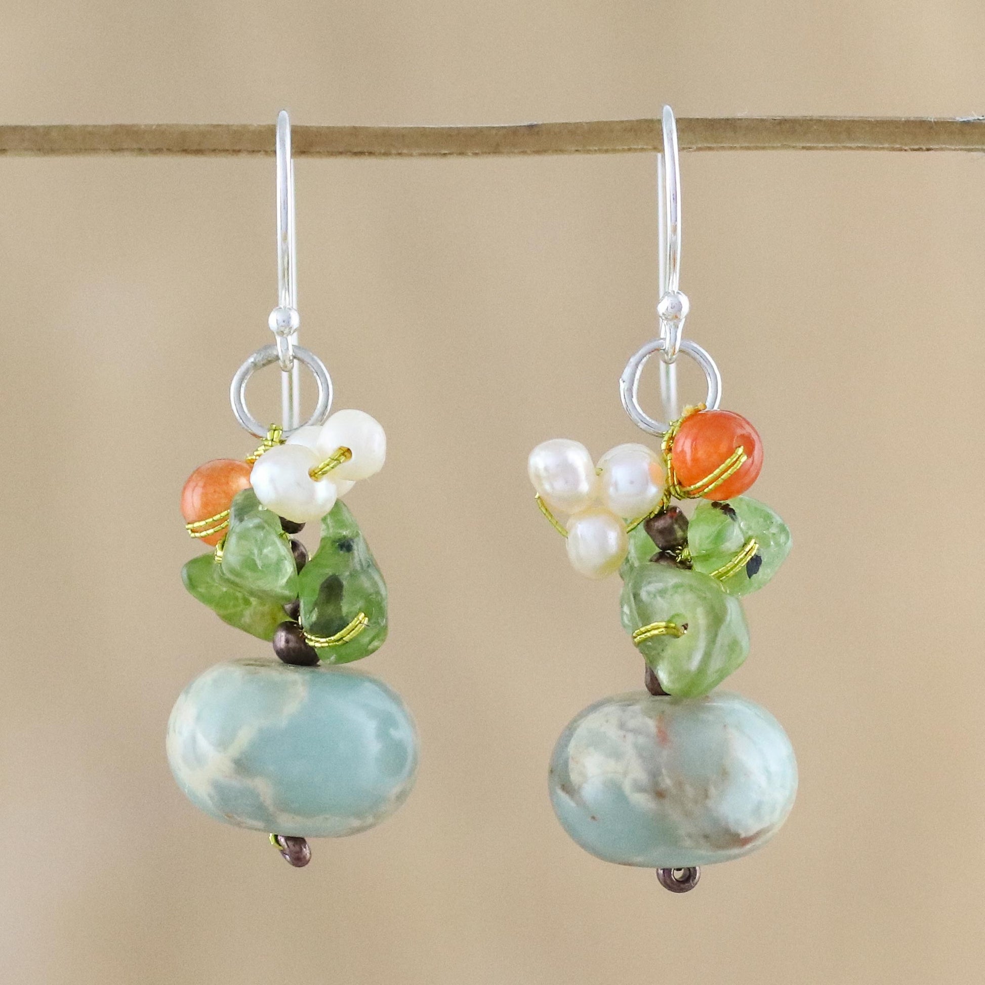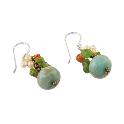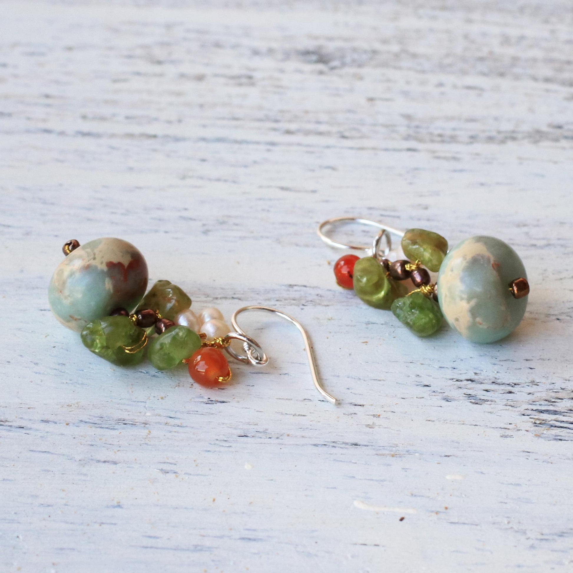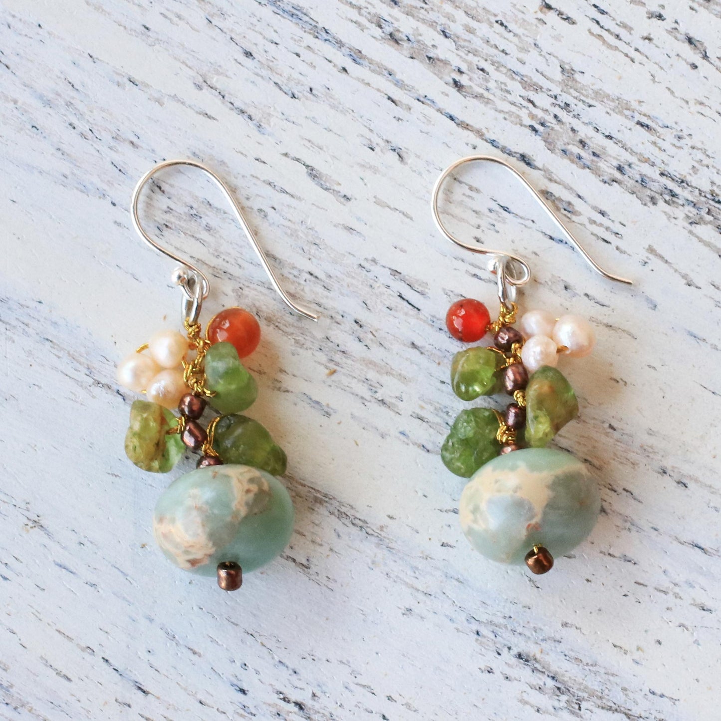 Two large stones of aqua terra jasper fall below clusters of carnelian, peridot, cultured pearl, and glass beads strung on silk thread. Thai artisan Nareerat designs this exotic pair of dangle earrings, completing them with hooks of sterling silver.
