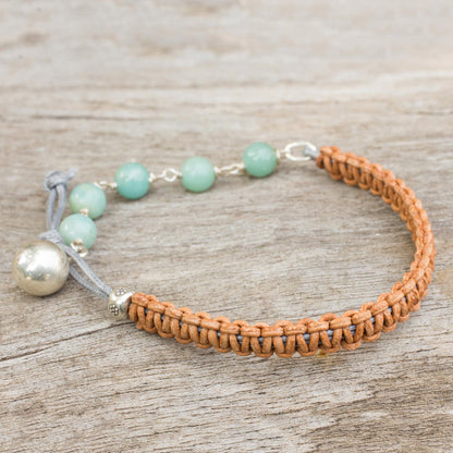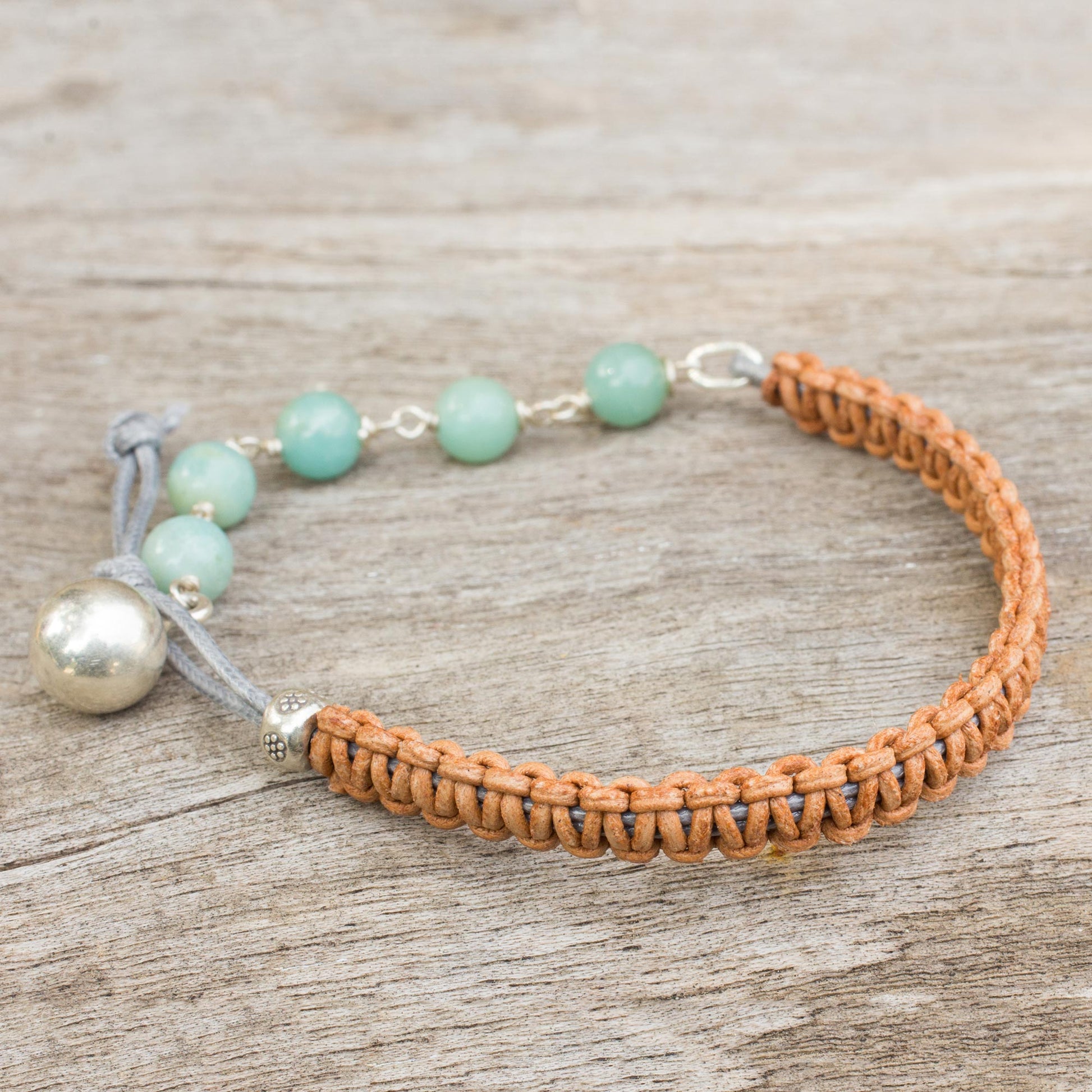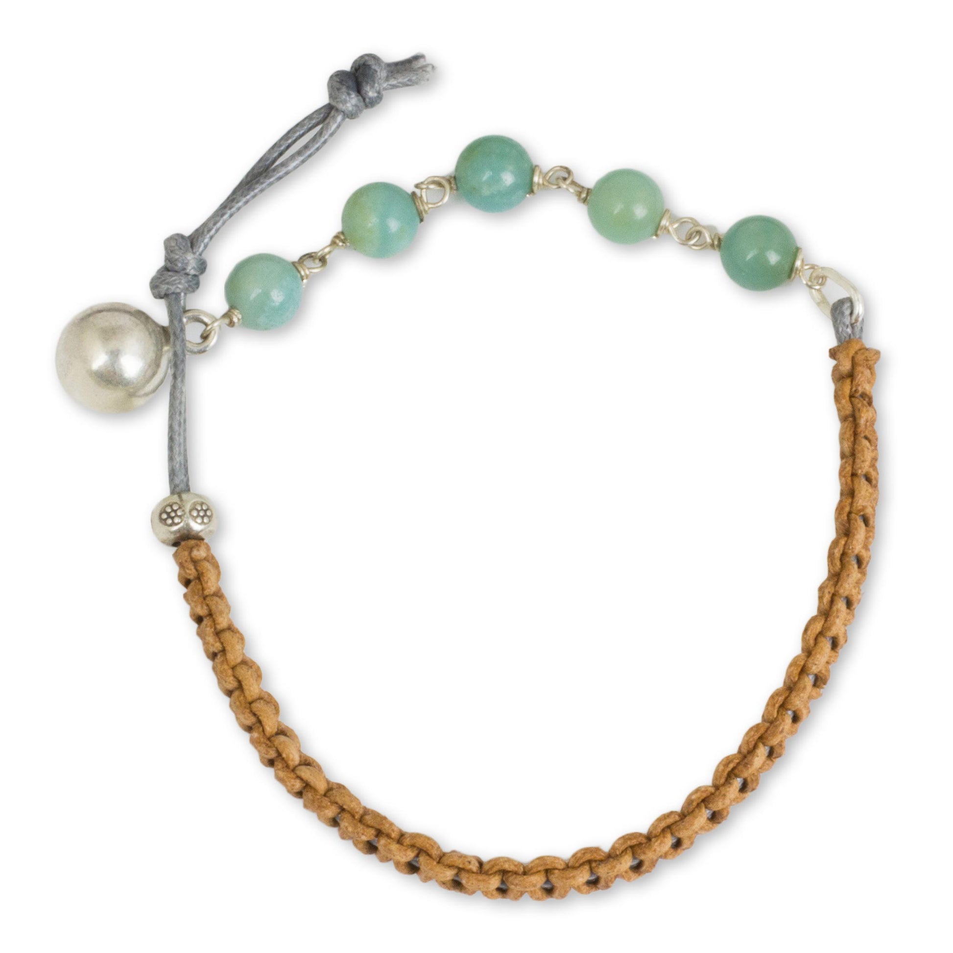 Thailand's Siriporn exalts the beauty of contrasts for the design of this bracelet. She braids half of the bracelet with tan leather over grey cords with macramé techniques. The other half is crafted with an amazonite and silver chain. The handcrafted bracelet is designed to fasten at one of two lengths with a silver bead.