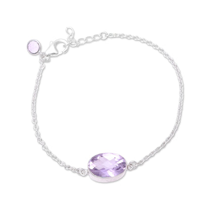 Weighing an impressive five carats, a single amethyst gemstone sparkles at the center of this fashionable pendant bracelet from India. Designed by Neetu Barathi, the bracelet is crafted by local artisans, who use sterling silver cable chain. A smaller amethyst gem forms a charm at the clasp.