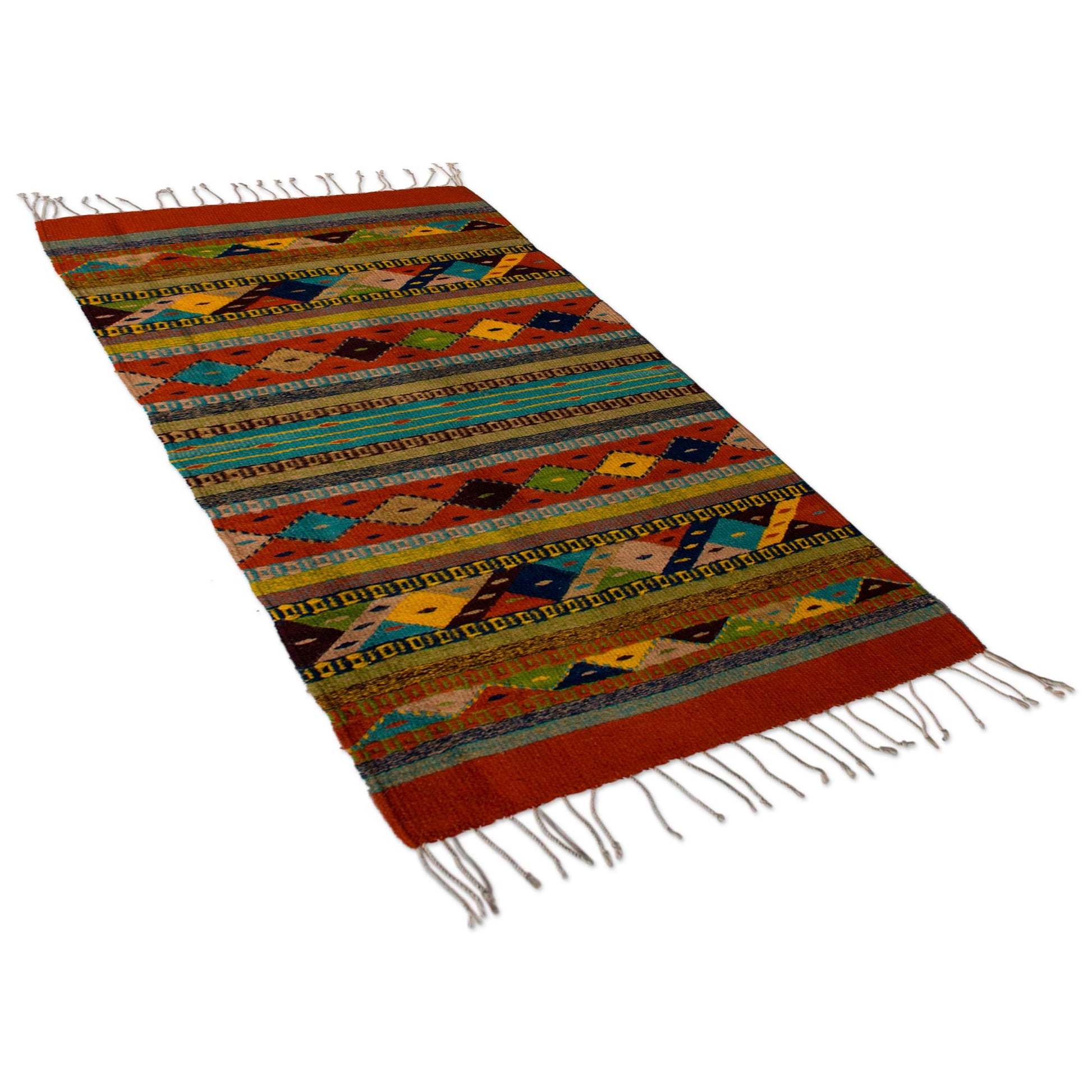 Filled with the spirit of Oaxaca, this colorful Zapotec rug is inspired by the Sierra Madre, embracing ancestral diamond motifs. Alfredo Ruiz demonstrates Mexico's Zapotec artistry and his own weaving skills with this dazzling wool rug. Created of virgin wool on a traditional handloom, the accent rug takes its colors from natural dyes.