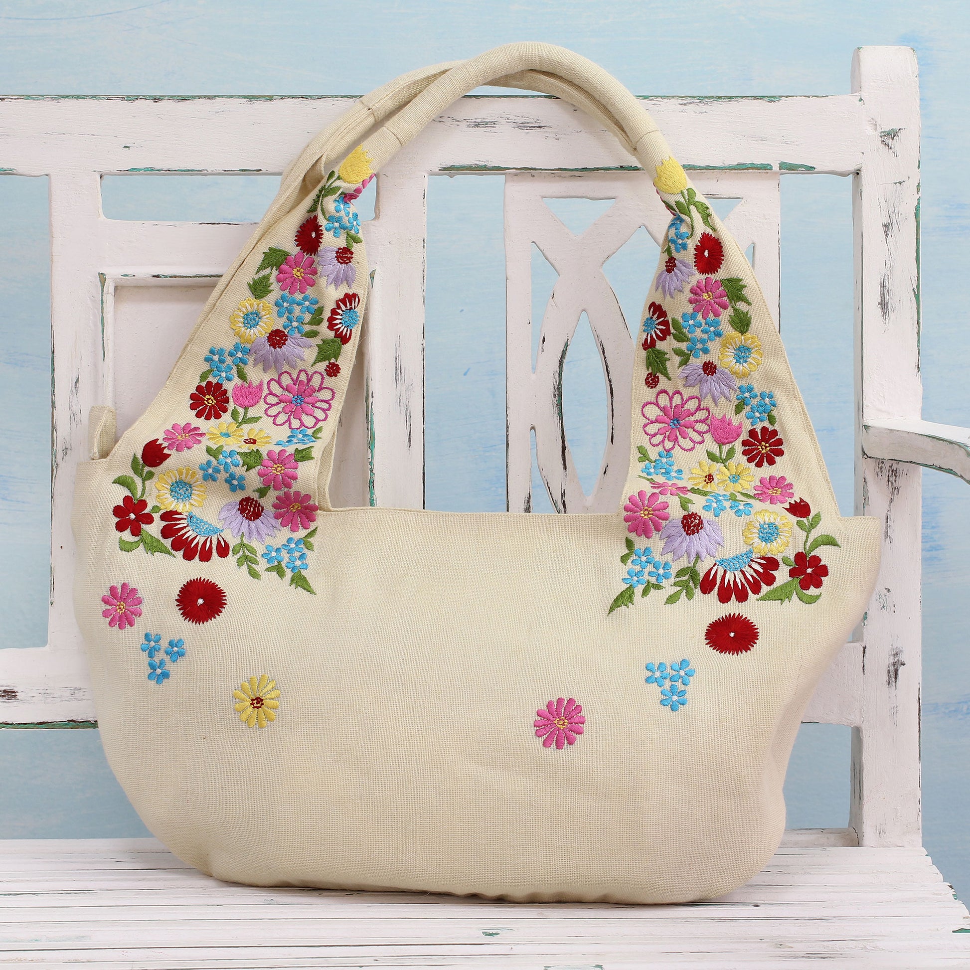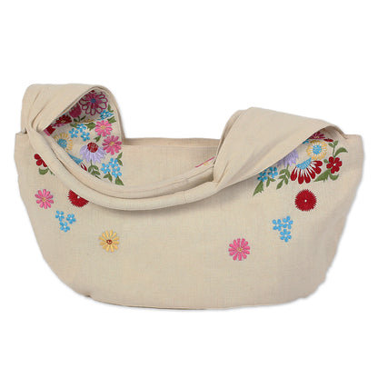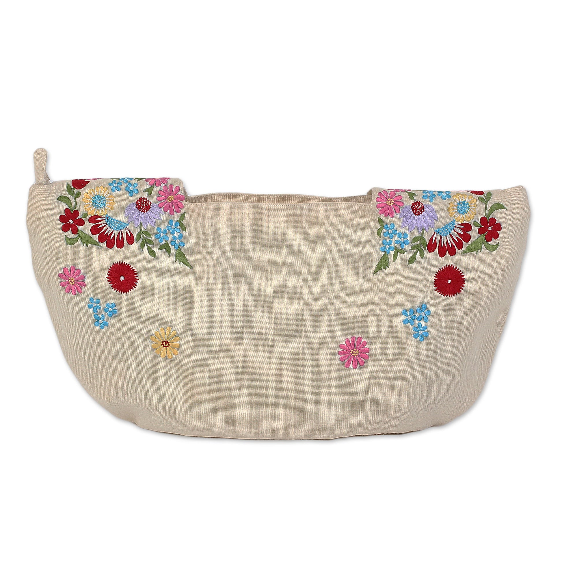 Crafted from a blend of jute and cotton, this hobo bag designed by Indian artisan Sumita Ghosh is a cheerful accessory. An array of multicolored flowers are embroidered onto the wheat-colored bag, which features a cotton lining and one interior zip pocket.