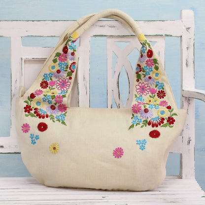 Field of Flowers in Wheat Wheat Colored Floral Jute Blend Hobo Bag from India