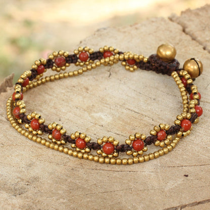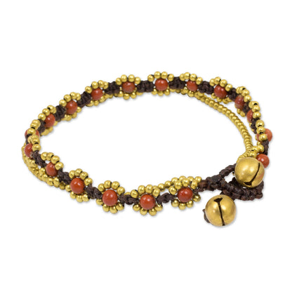 Fiery jasper mingles with gleaming beads in a beautiful hand knotted bracelet. Adding joyous sound, diminutive brass bells adorn the bracelet and form the clasp. The design is crafted by Tiraphan Hasub in Thailand.