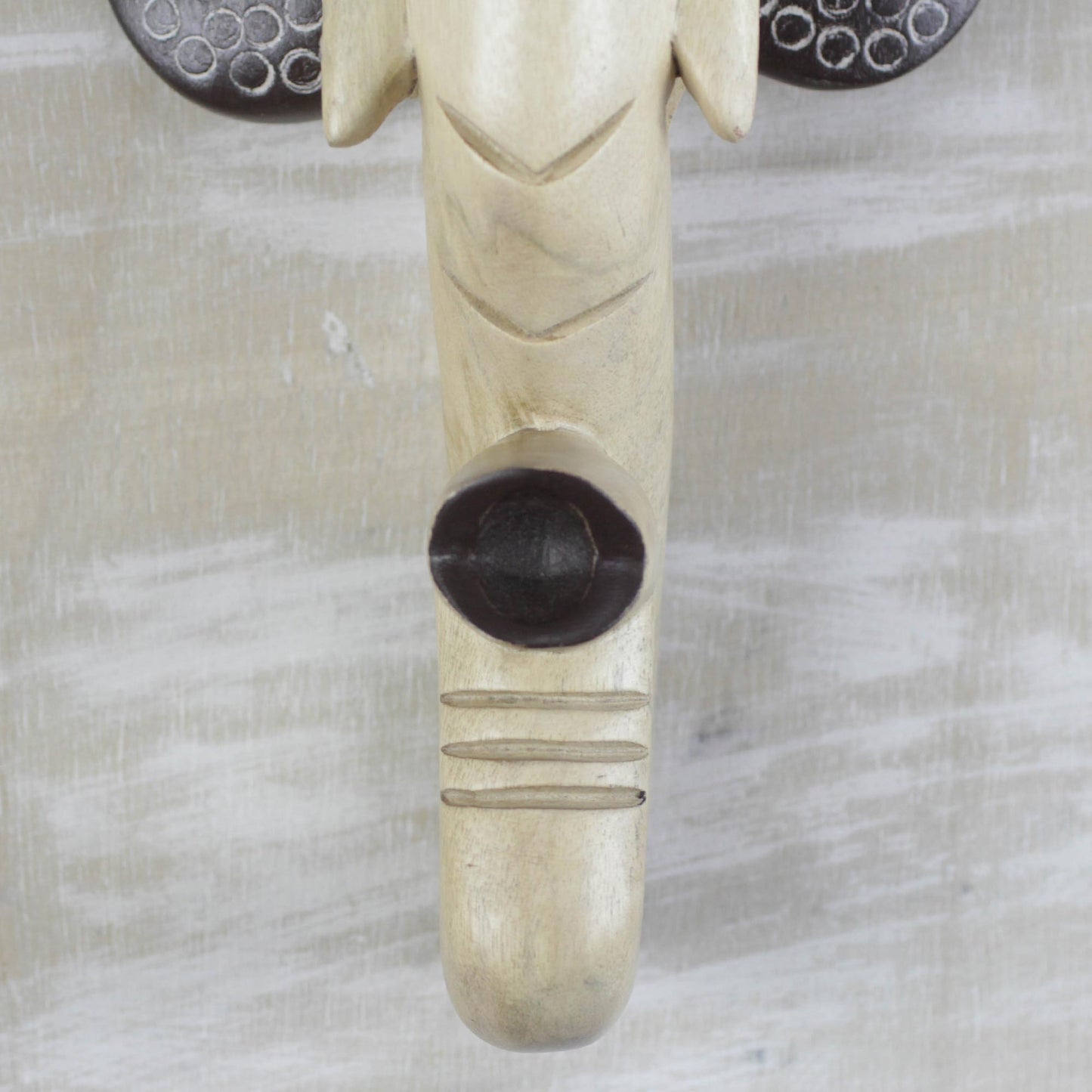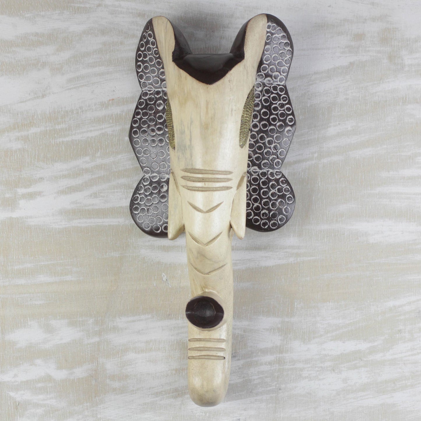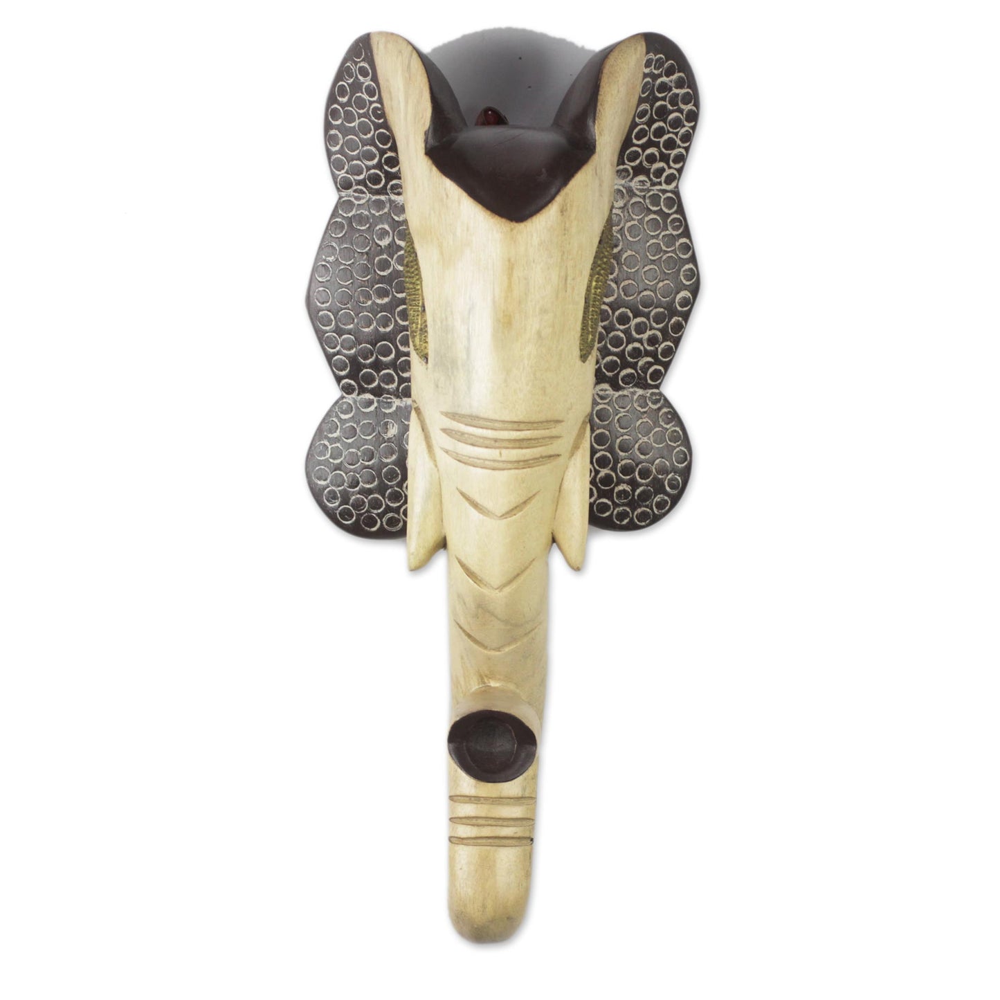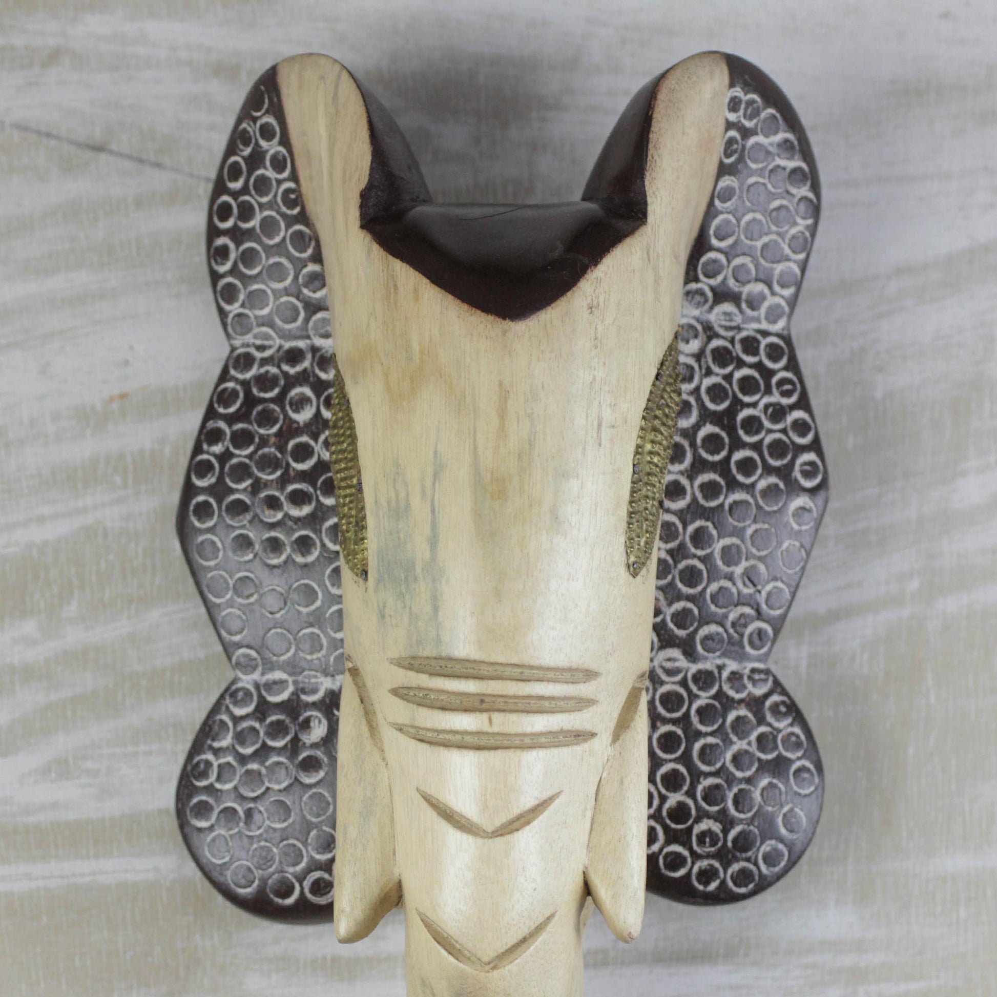 Flaring its dark brown ears, an elephant is hand-carved of sese wood in this wall mask from Ghana. Theophilus Anum designs this striking addition to your home decor, given a beige finish. The elephant's eyes are made of embossed brass.