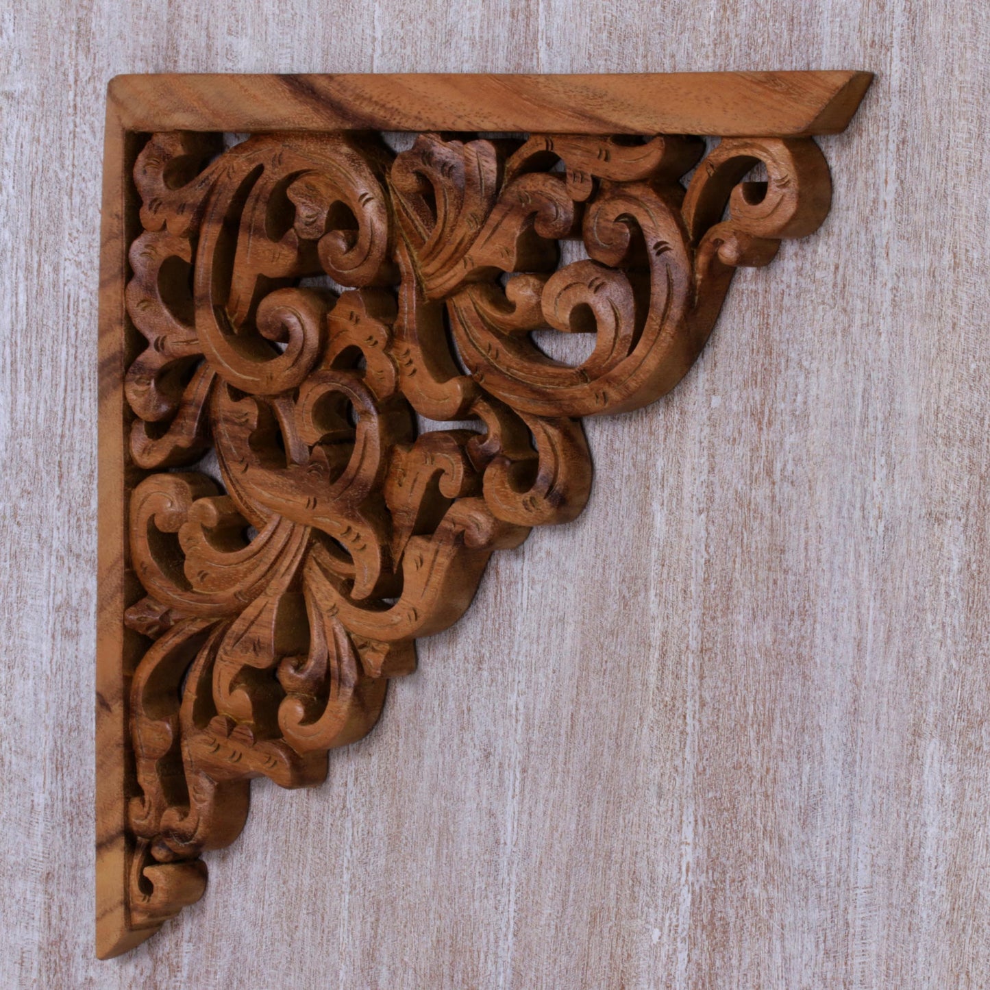 Bring a corner of the forest to your home with this relief panel from Bali, carved by hand from suar wood in a triangular shape. Made Mulyani designs the relief panel with spiraling vine motifs and a finish that accentuates the natural grain of the wood.