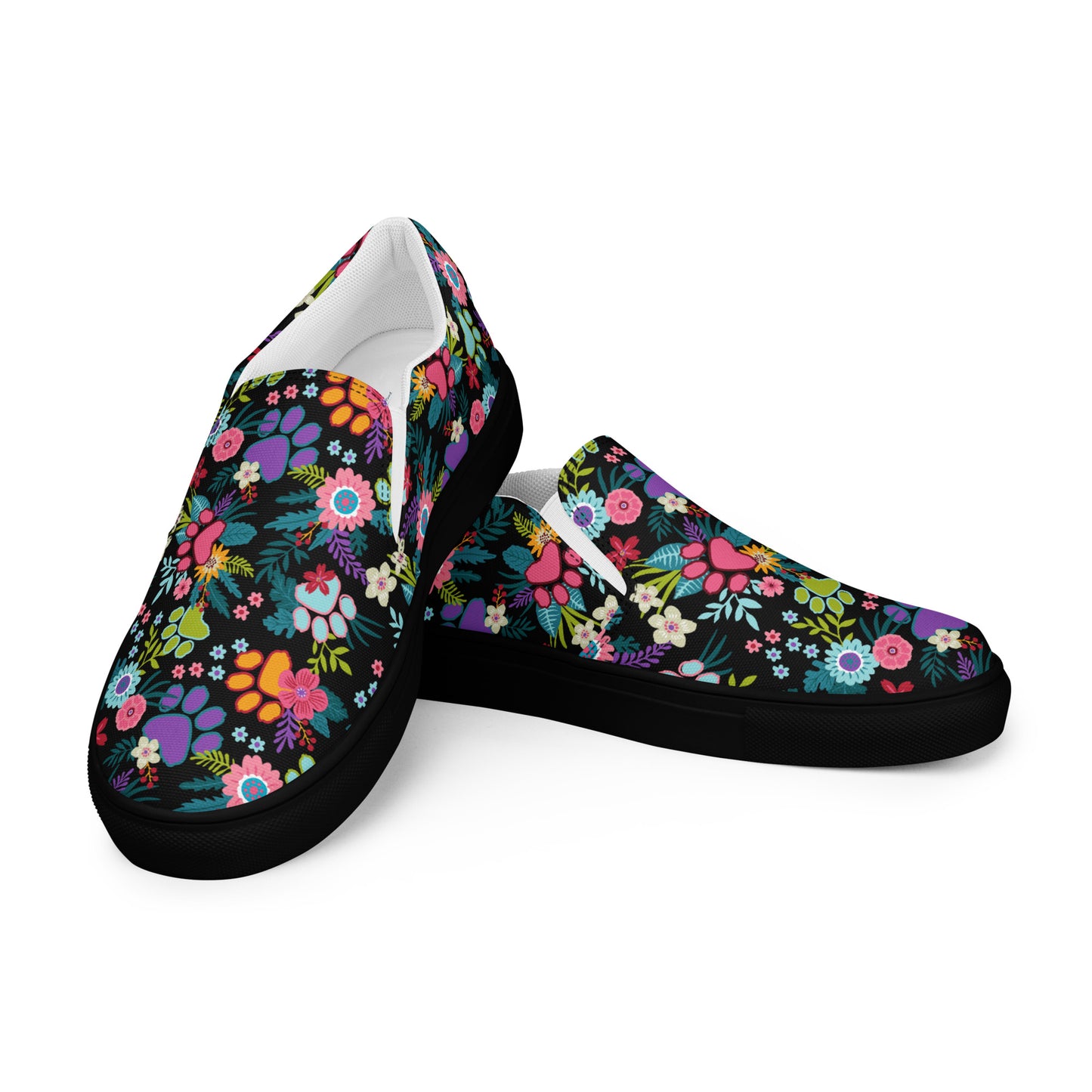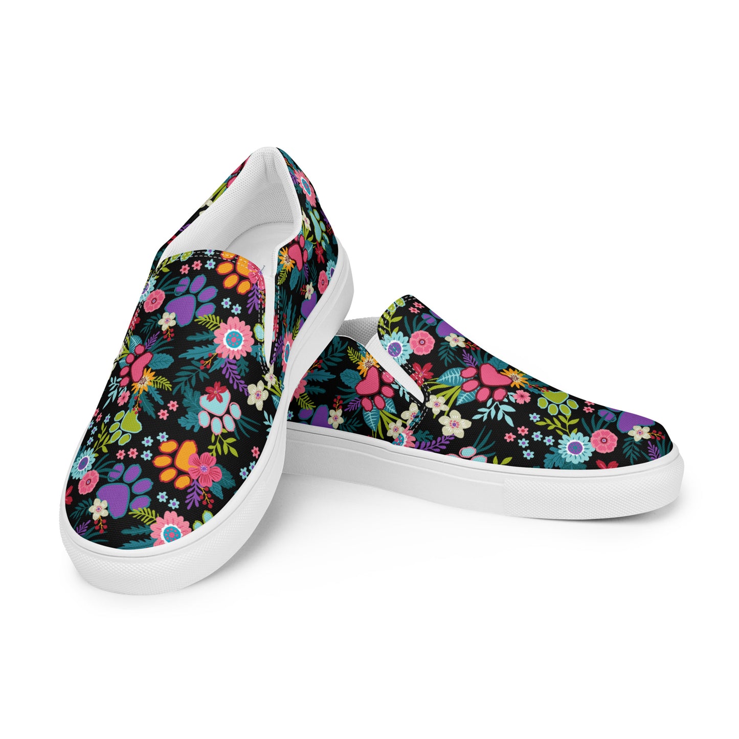 Made for comfort and ease, these Women’s Slip-On Canvas Shoes are stylish and the ideal piece for completing an outfit. Equipped with removable soft insoles and rubber outsoles, this colorful pair is easy to slip-on and step out the door! Featuring a vibrant, colorful paw print pattern layered with lush tropical florals, these shoes are the perfect blend of playful design and practical comfort.