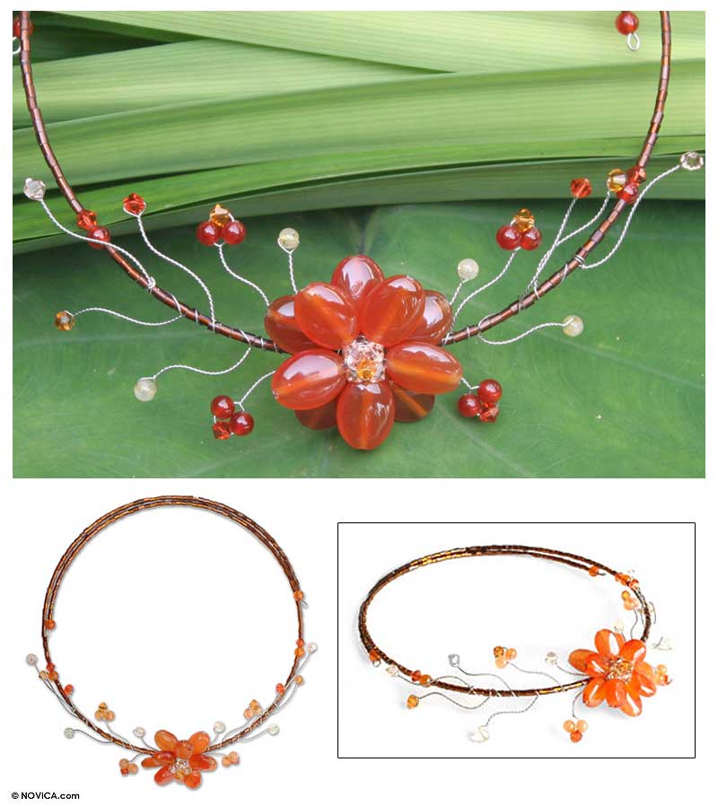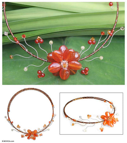 Handcrafted of carnelian and citrine, it blooms on a circlet of glittering glass crystal. Busarin's feminine design includes beads of Japanese glass. Bright petals center a bouquet of tender buds and tendrils.