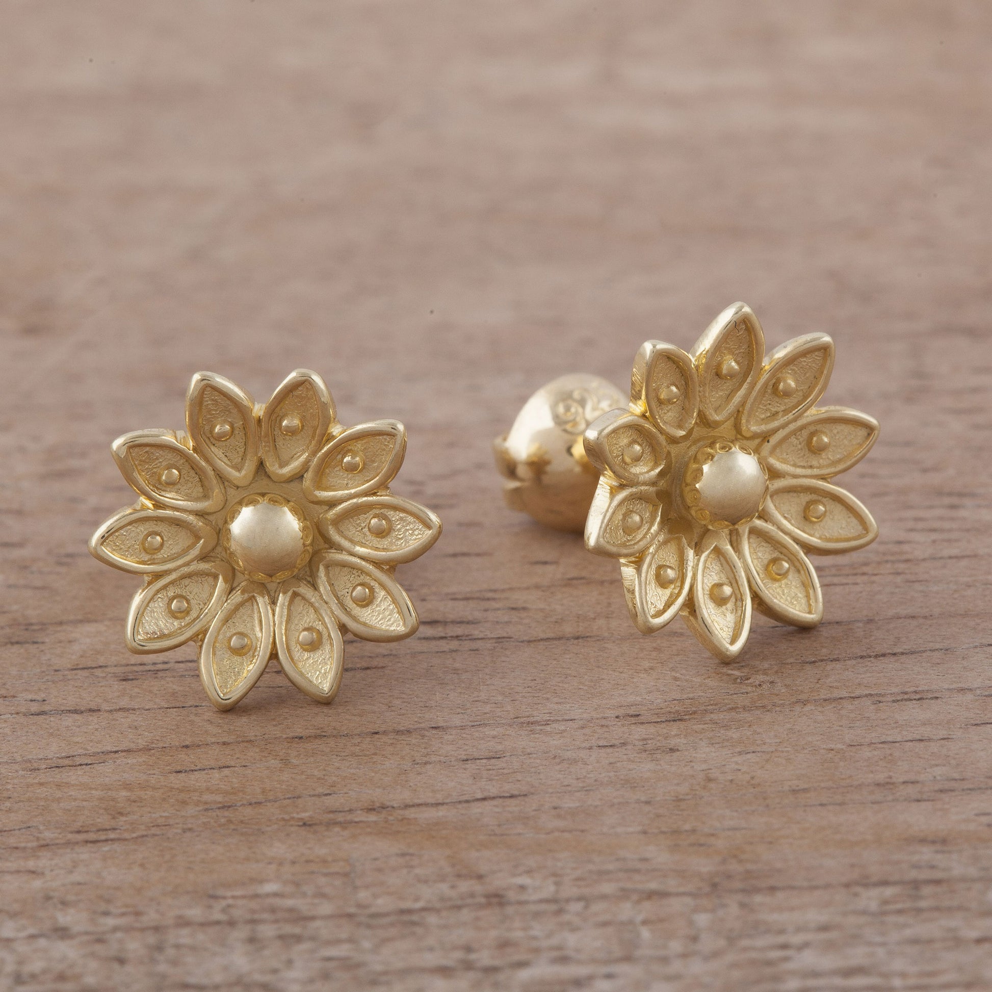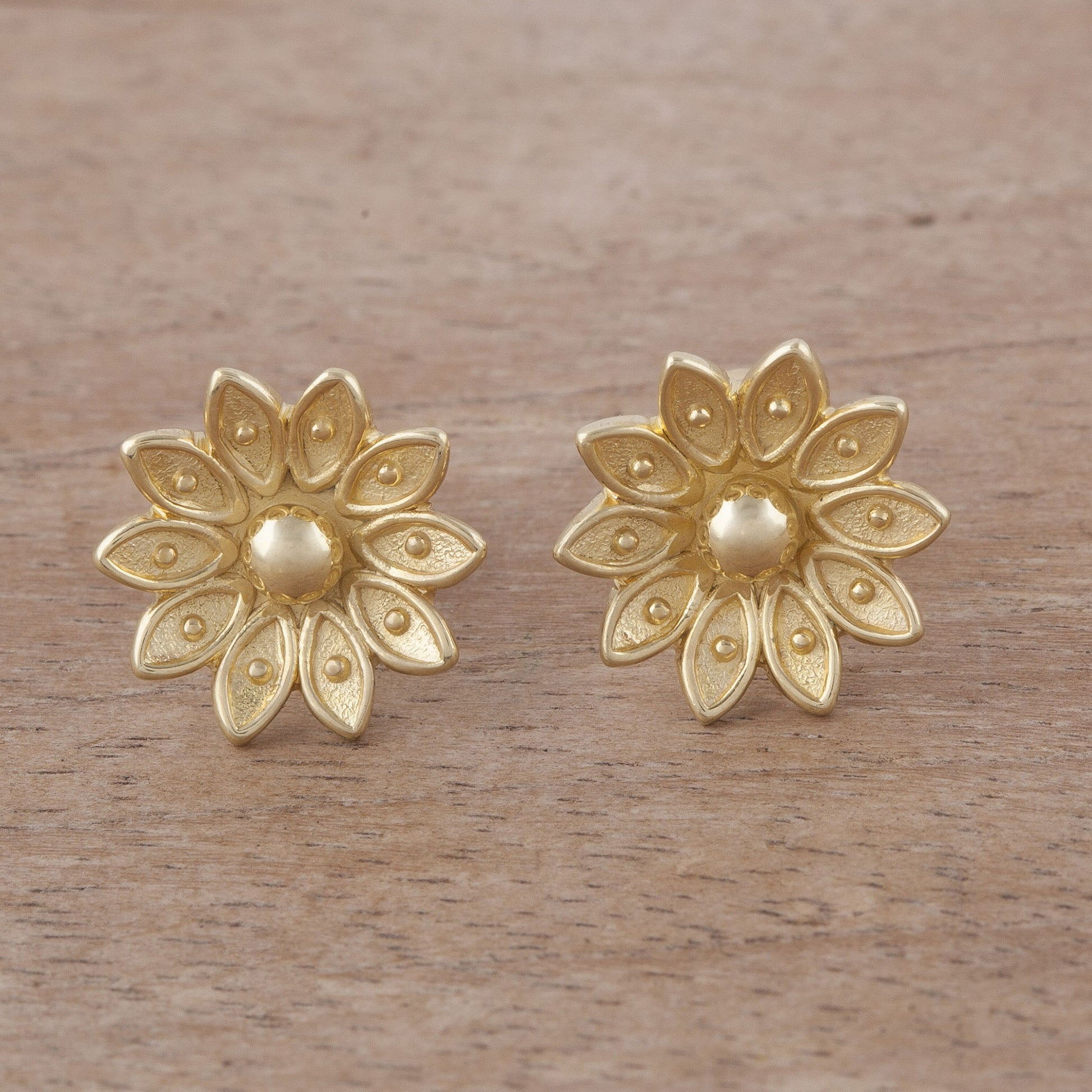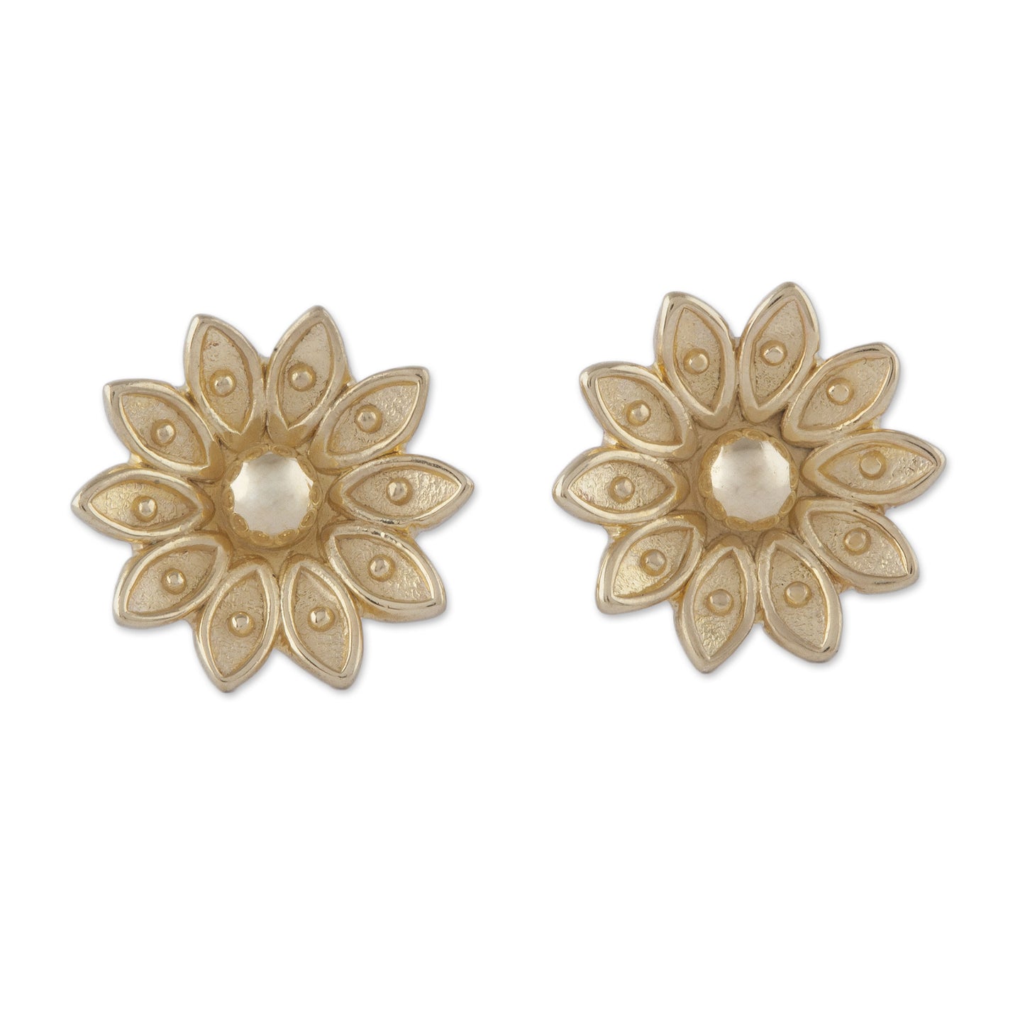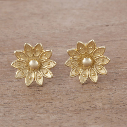 Gleaming Lotus Floral Gold Plated Sterling Silver Stud Earrings from Peru