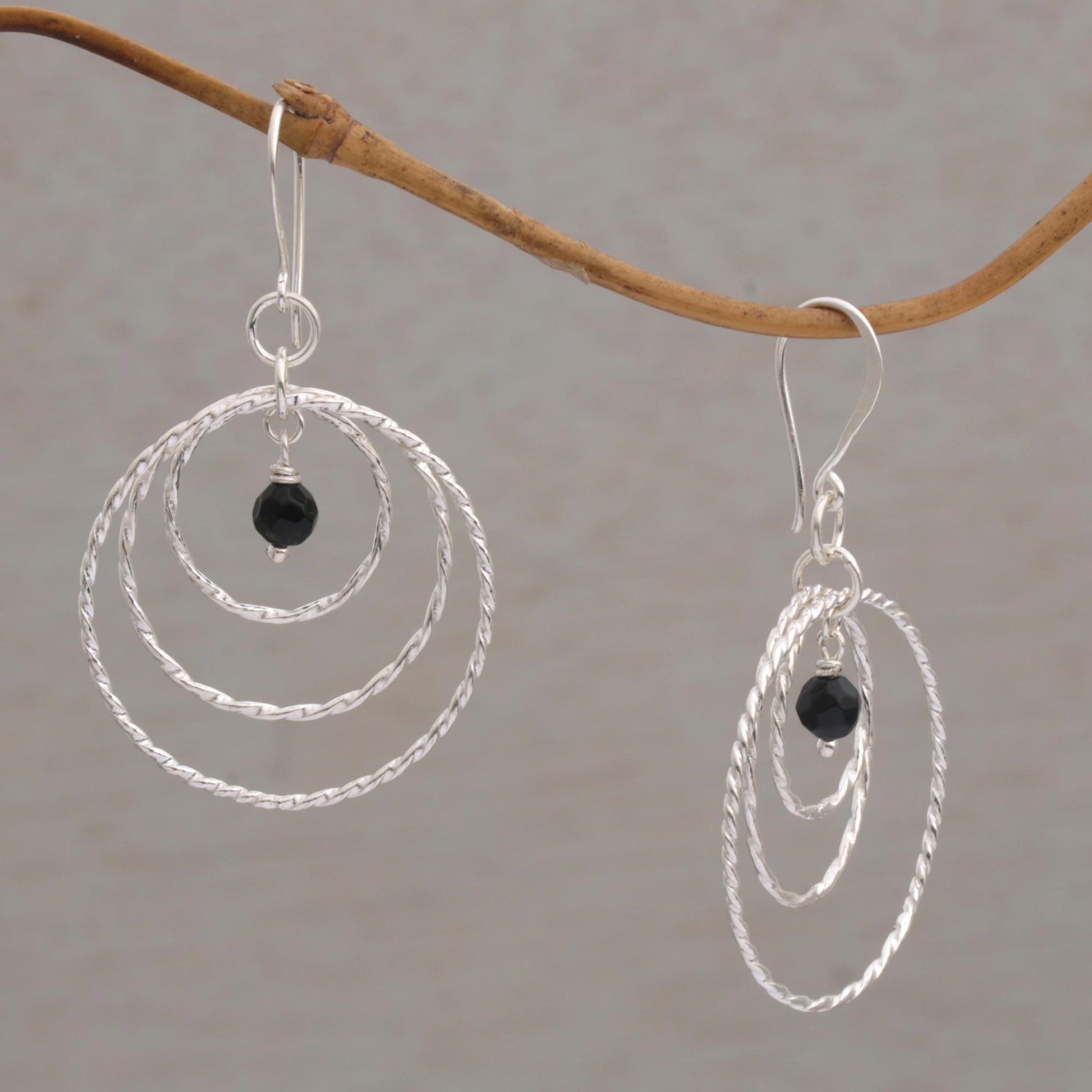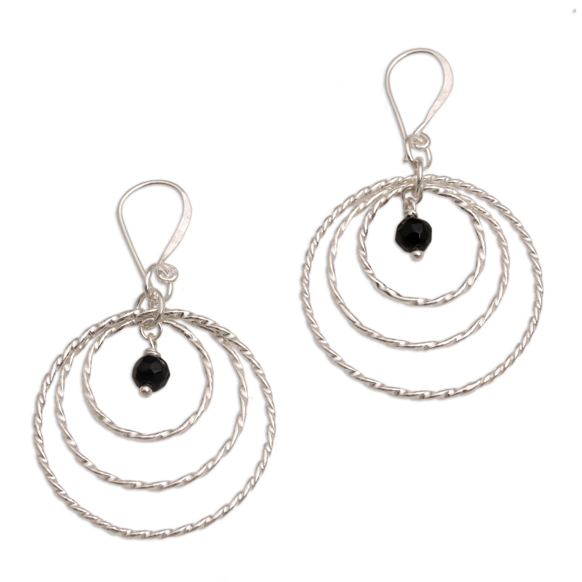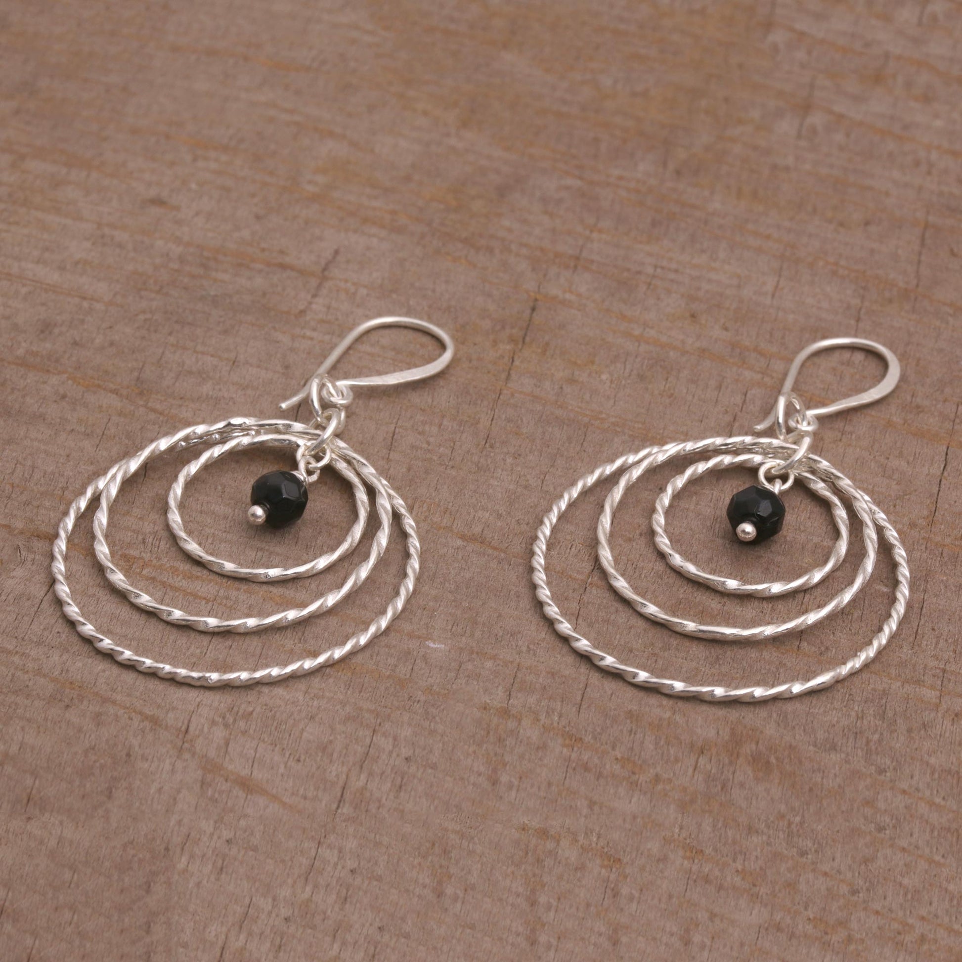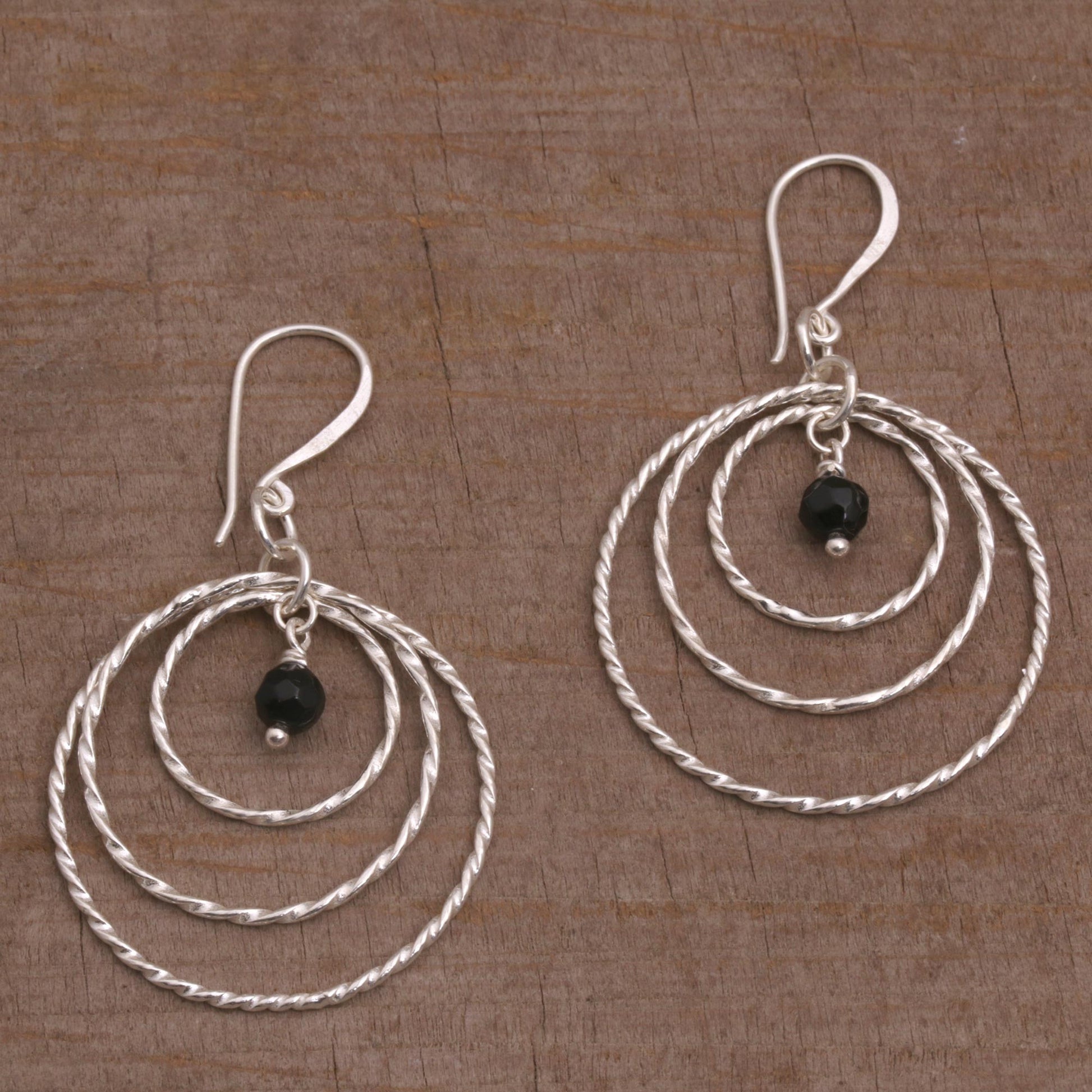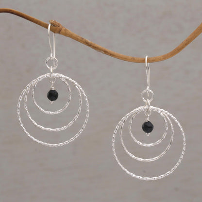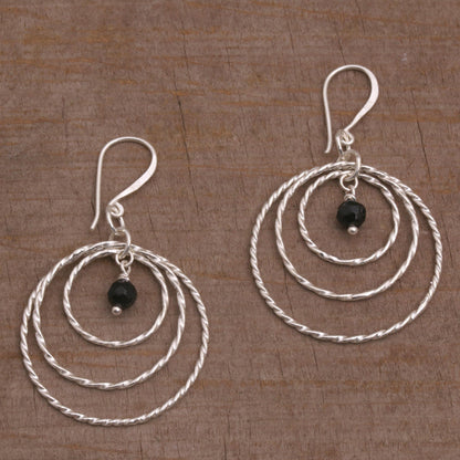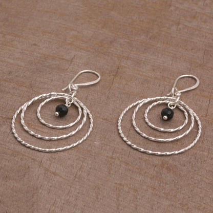 Gleaming, twisting rings are crafted by hand of sterling silver to frame petite stones of black onyx. This pair of Balinese dangle earrings is designed by Cahya Krisna, working with local artisans.