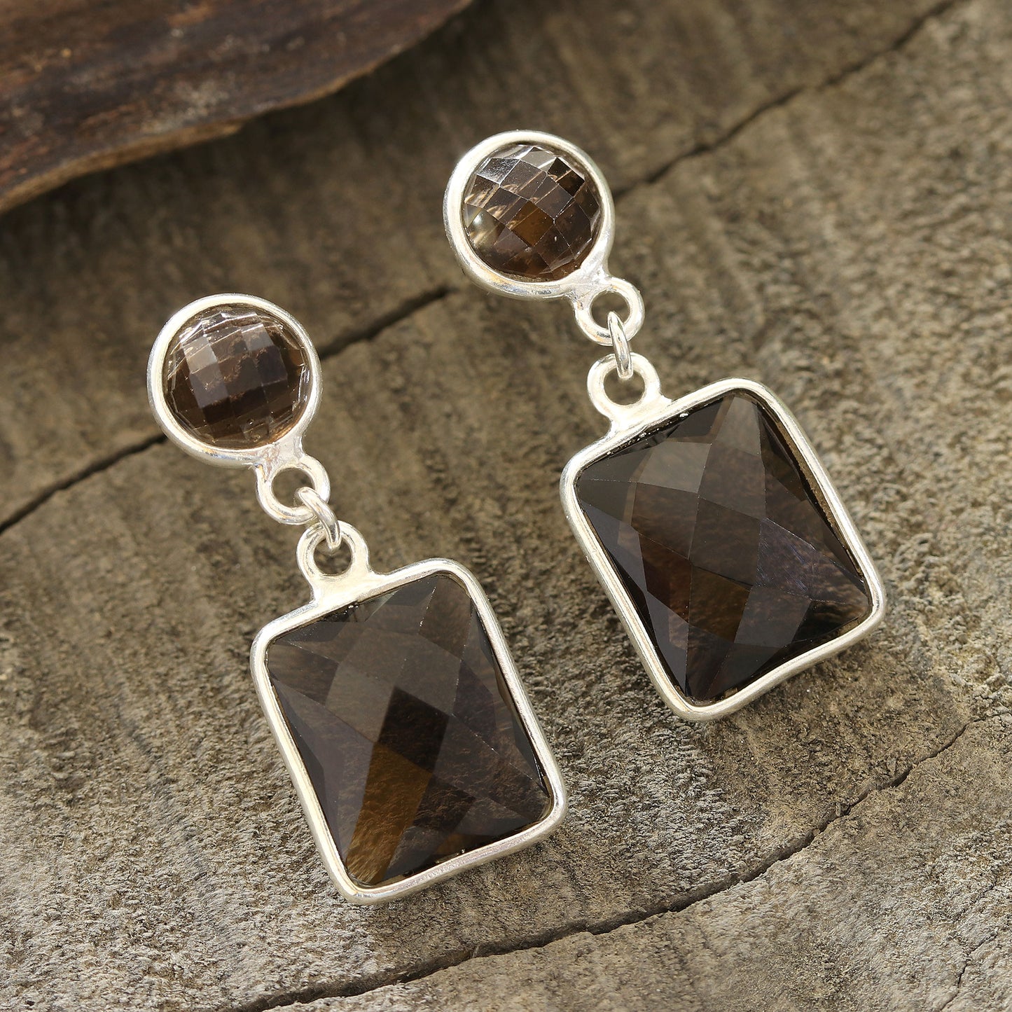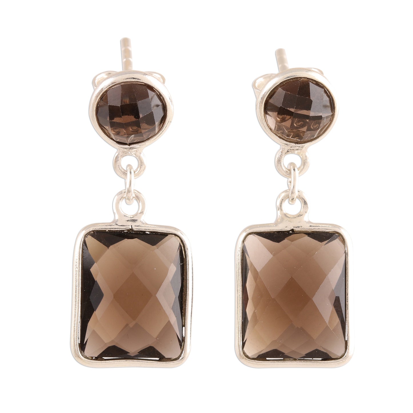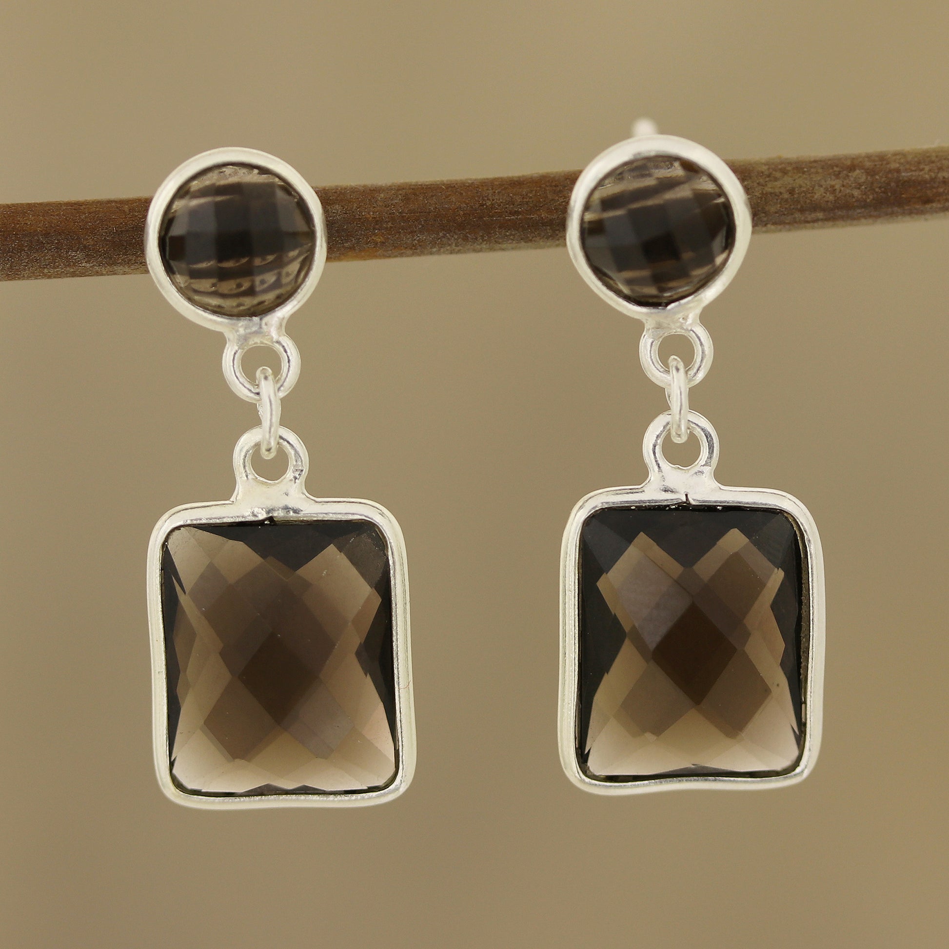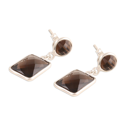 Totaling an impressive 13.5 carats, two faceted rectangles combine with round gems of smoky quartz that sparkle in the light. Indian artisan Pawanesh Gupta creates these dangle earrings, which feature frames of high-polish sterling silver.