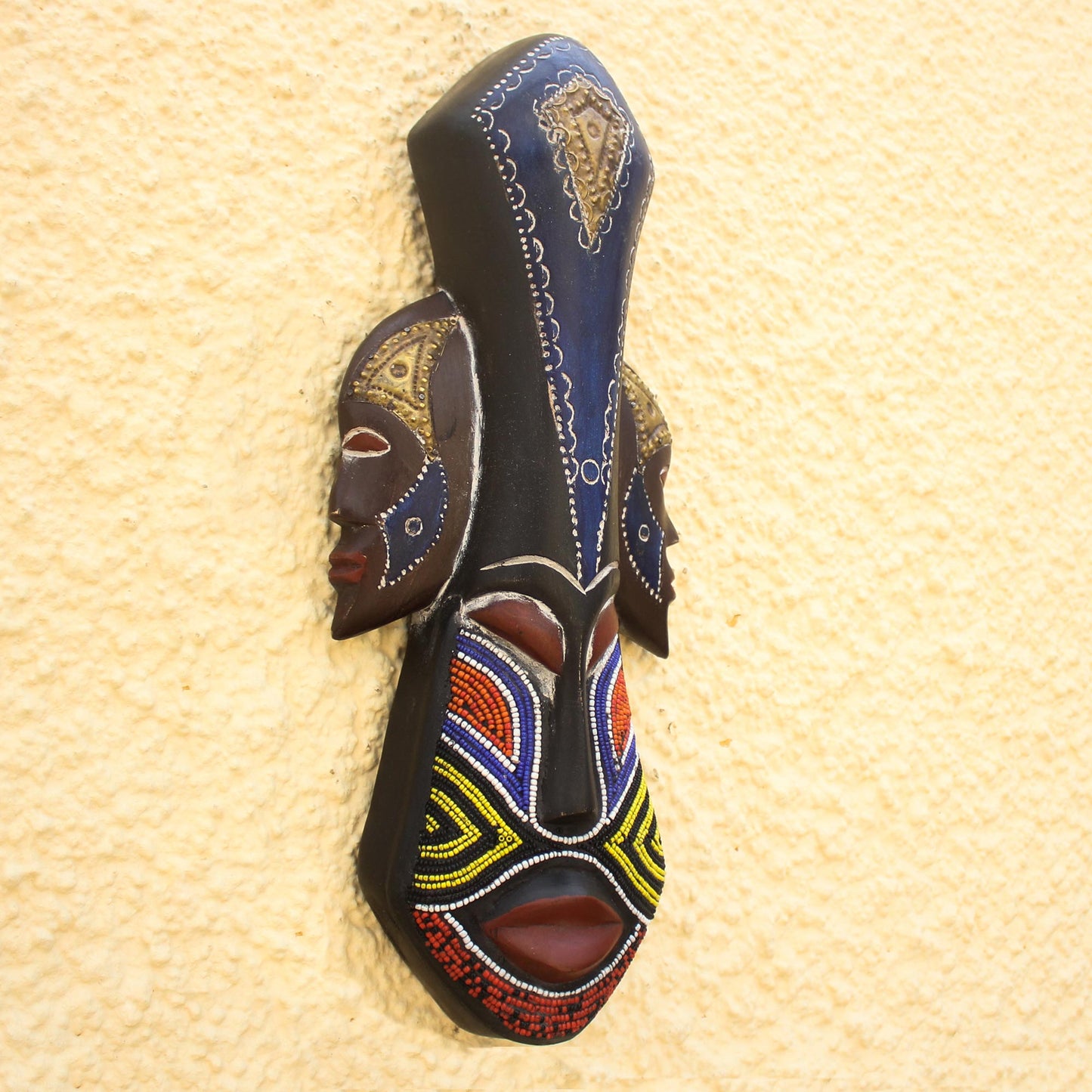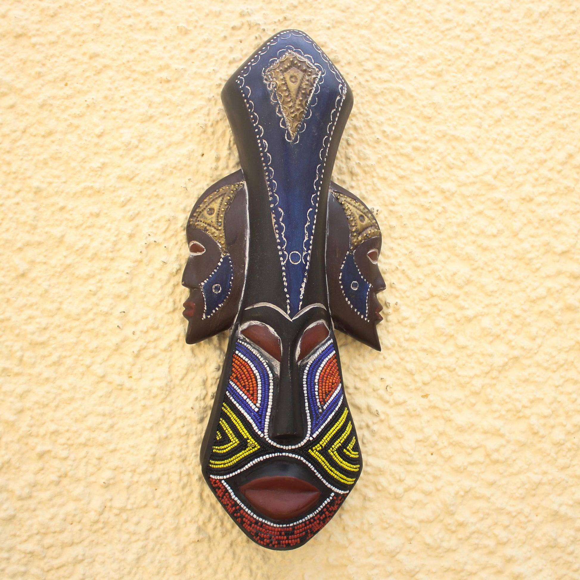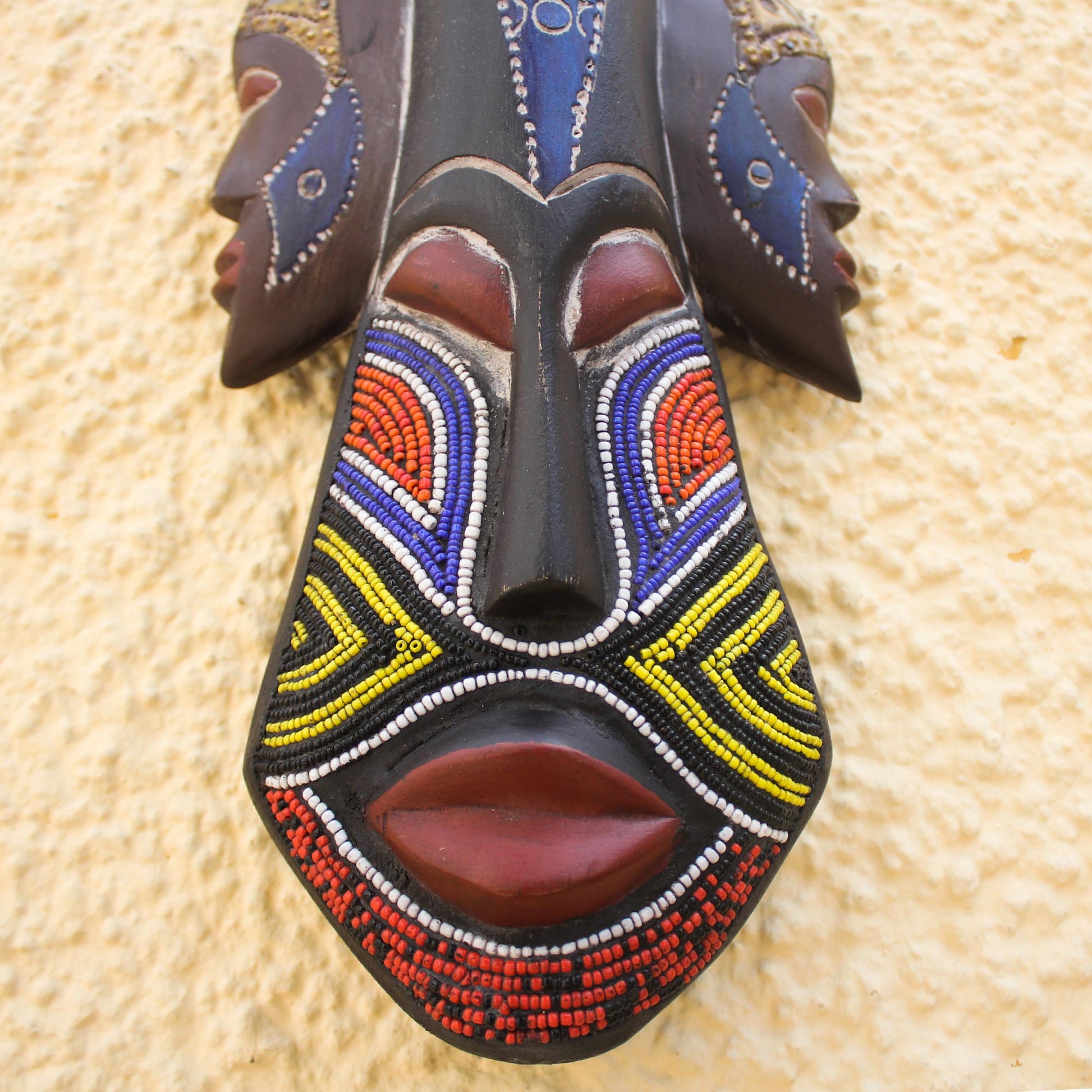 Glorious Work Beaded Wood Three Faced African Wall Mask Crafted by Hand