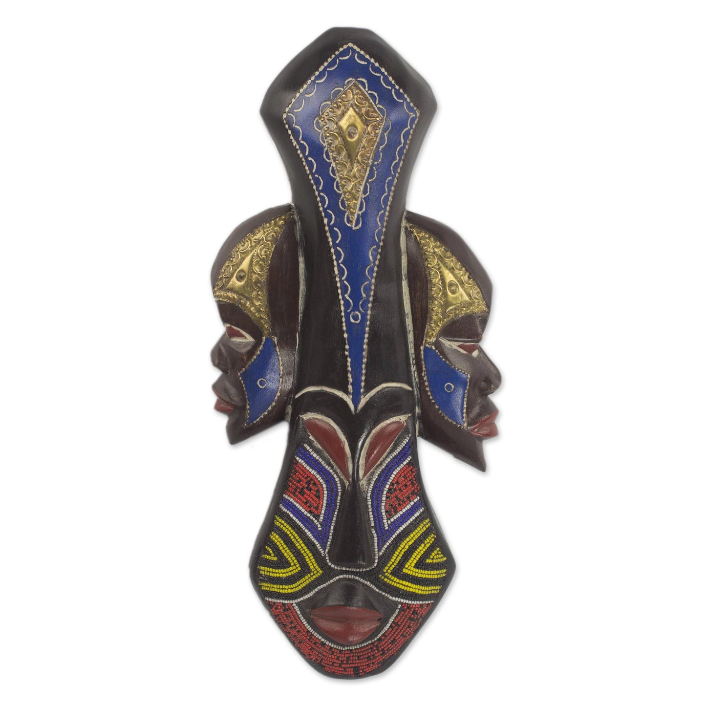 Two faces emerge from the sides of this spectacular wall mask, testifying to the admirable artistry of Awudu Saaed. He crafts his original design with sese wood, adorning the many faces with colorful recycled glass beads and embossed brass. The Ghanaian artisan names this wall mask Oluebube, meaning 'Glorious Work' in the Igbo language.