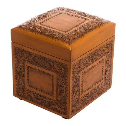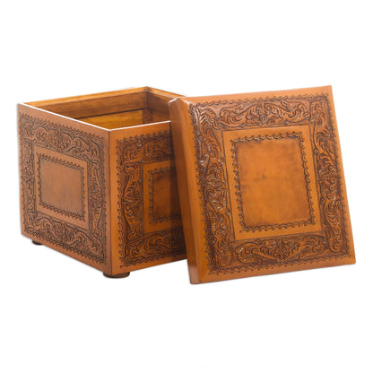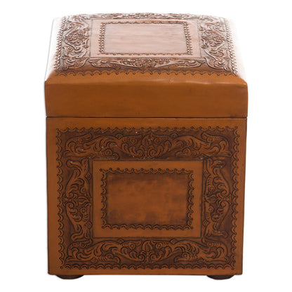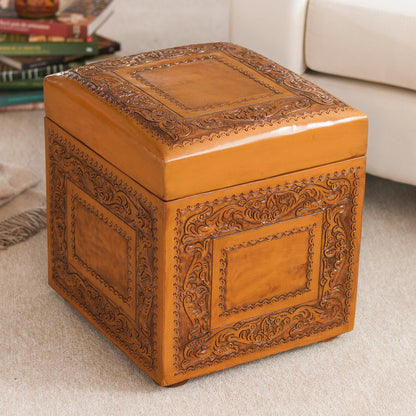 Ivy twines in lavish garlands across smooth tooled leather. Crafted by hand, this colonial style ottoman features a foam-padded seat and opens to provide out-of-sight storage. The beautiful design comes from the talented Ríos Family.