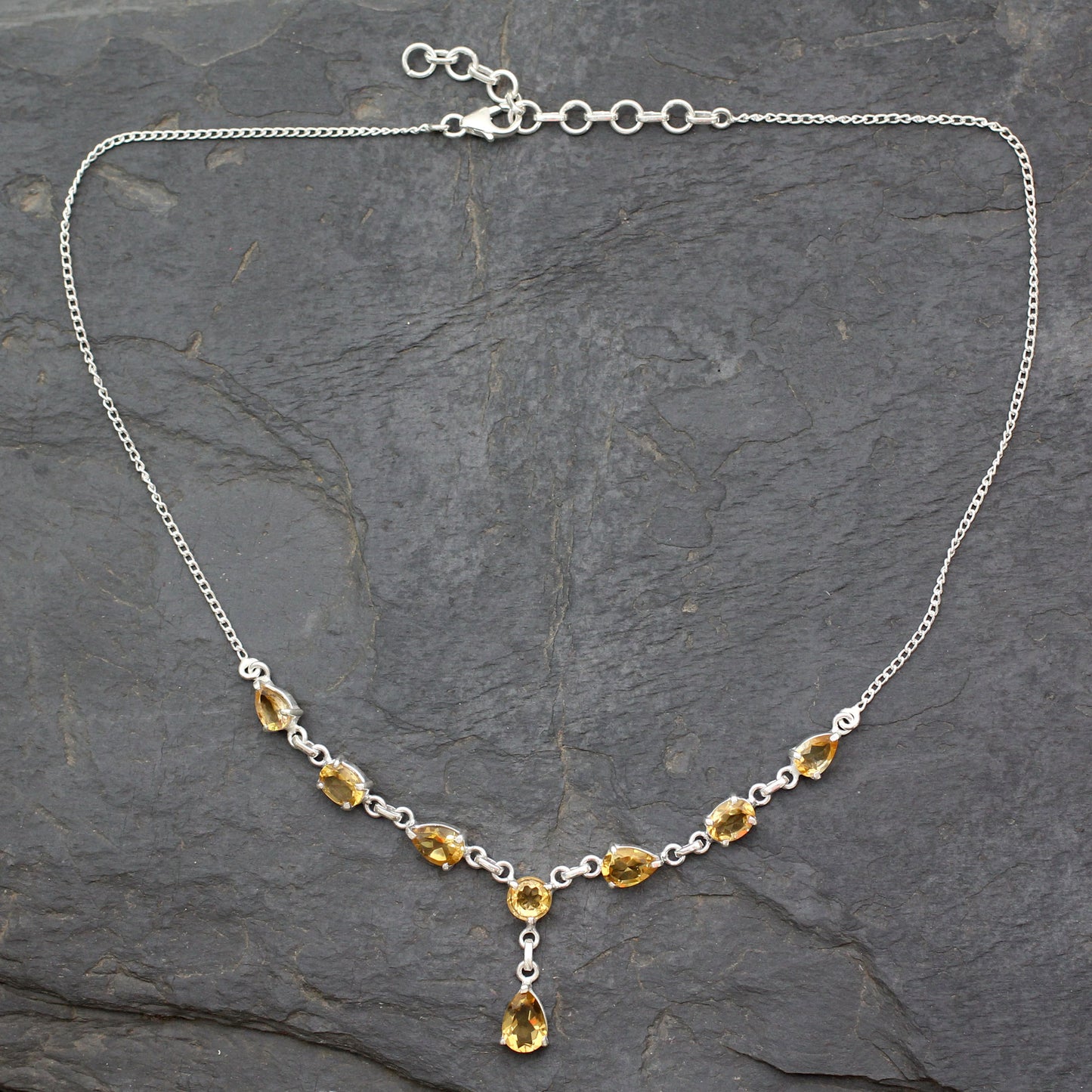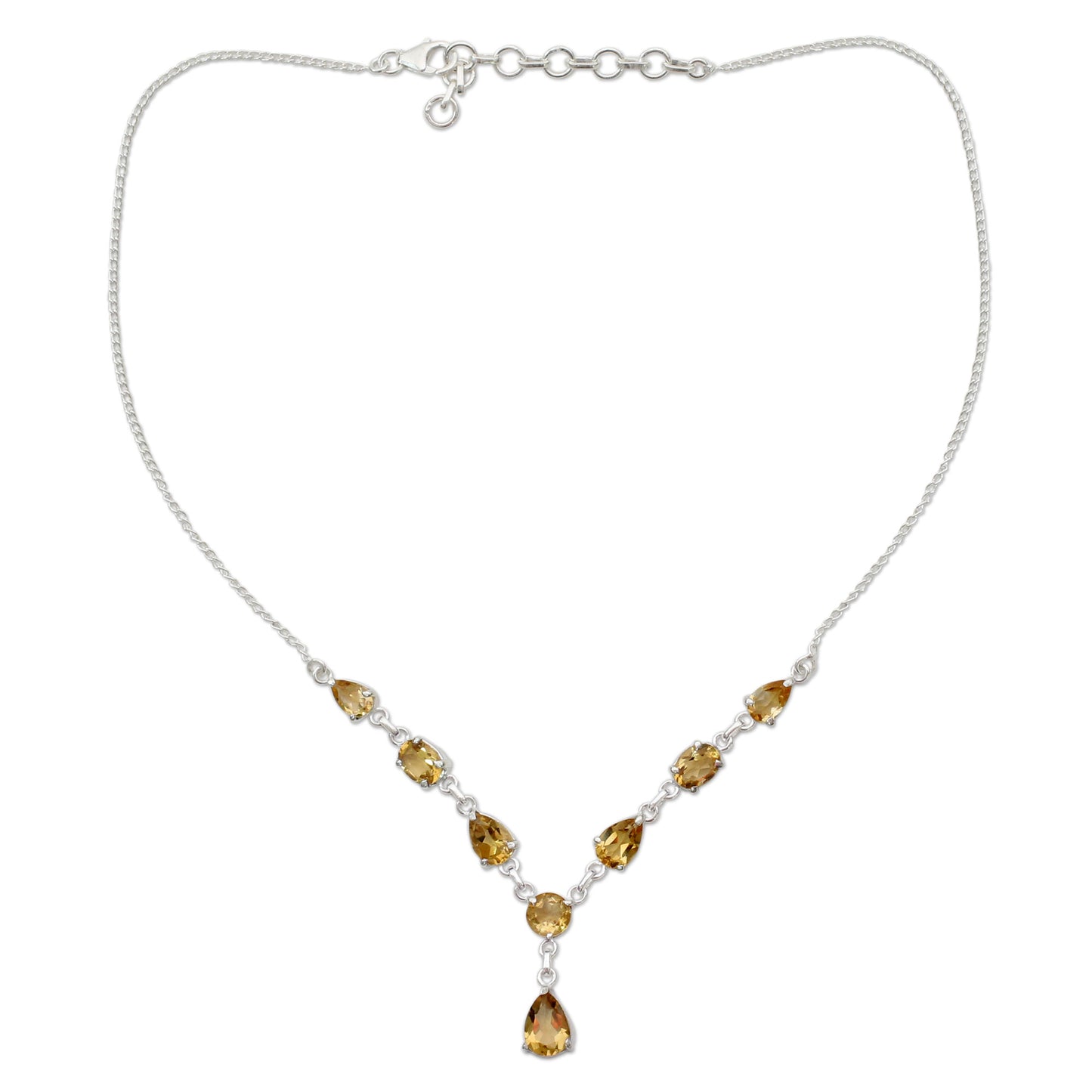 Suitable for royalty, this citrine Y necklace from Alok Jain in India is truly breathtaking. The artisan sets over 6 carats of the faceted golden gems in polished sterling silver in this classically elegant design.