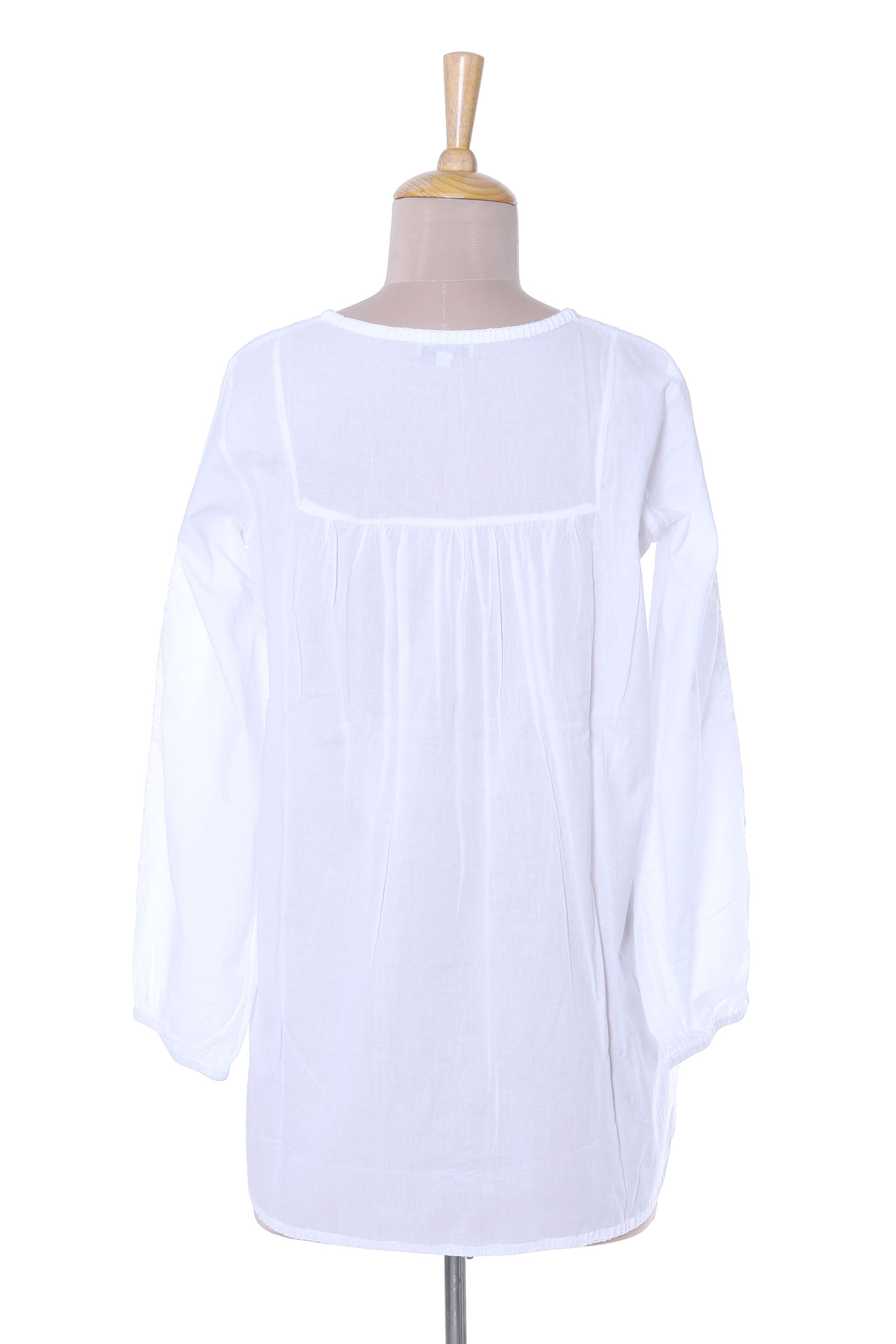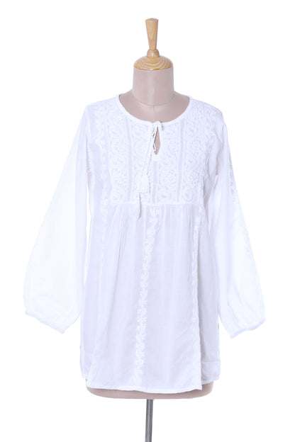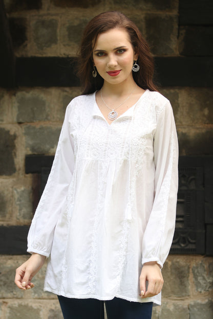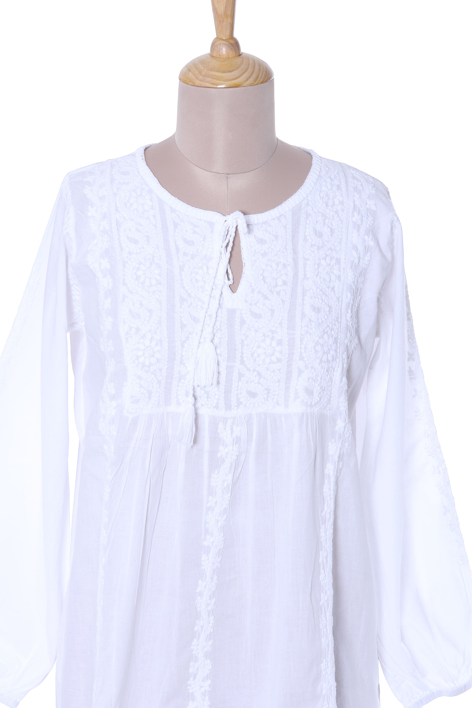 Gorgeous Chikankari Hand-Embroidered Cotton Tunic in White from India